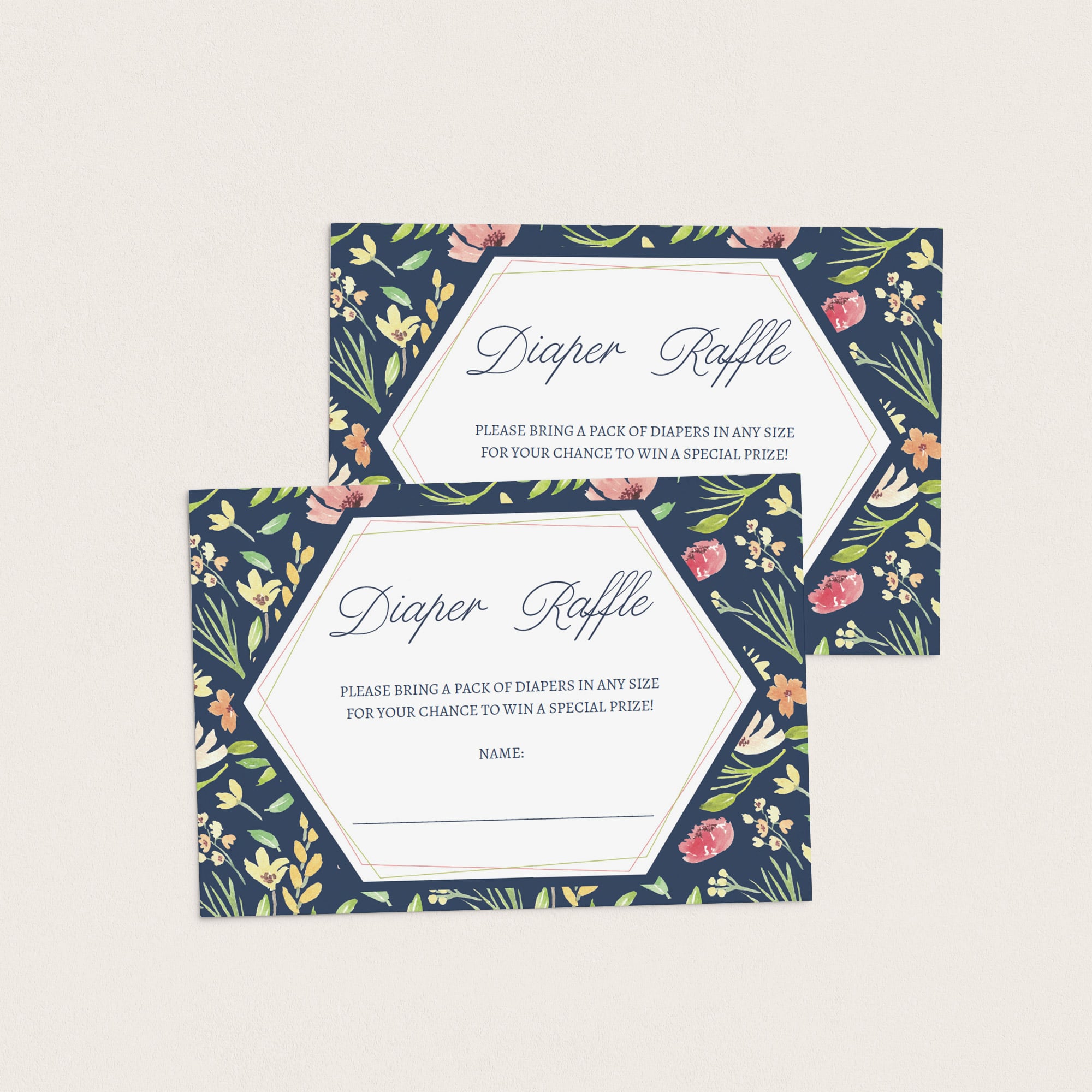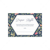 Who doesn't love a diaper raffle during a baby shower? Use this gorgeous navy floral diaper raffle ticket to let your guests know they can win a great prize by bringing a pack of diapers. Include the floral inserts in your baby shower invitations before sending them out.