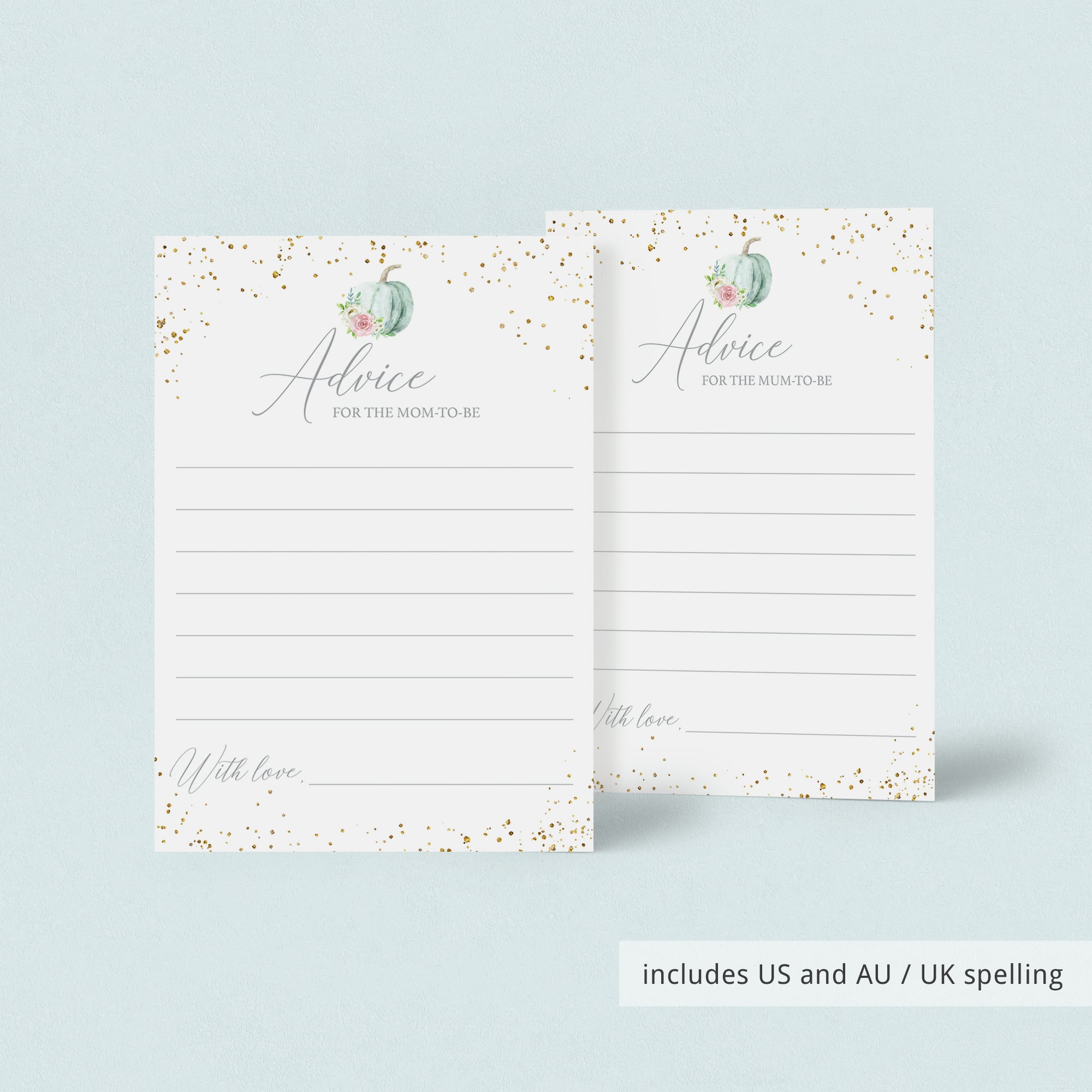 Let your guests write down their words of wisdom for the mom-to-be on your unique floral pumpkin advice cards!