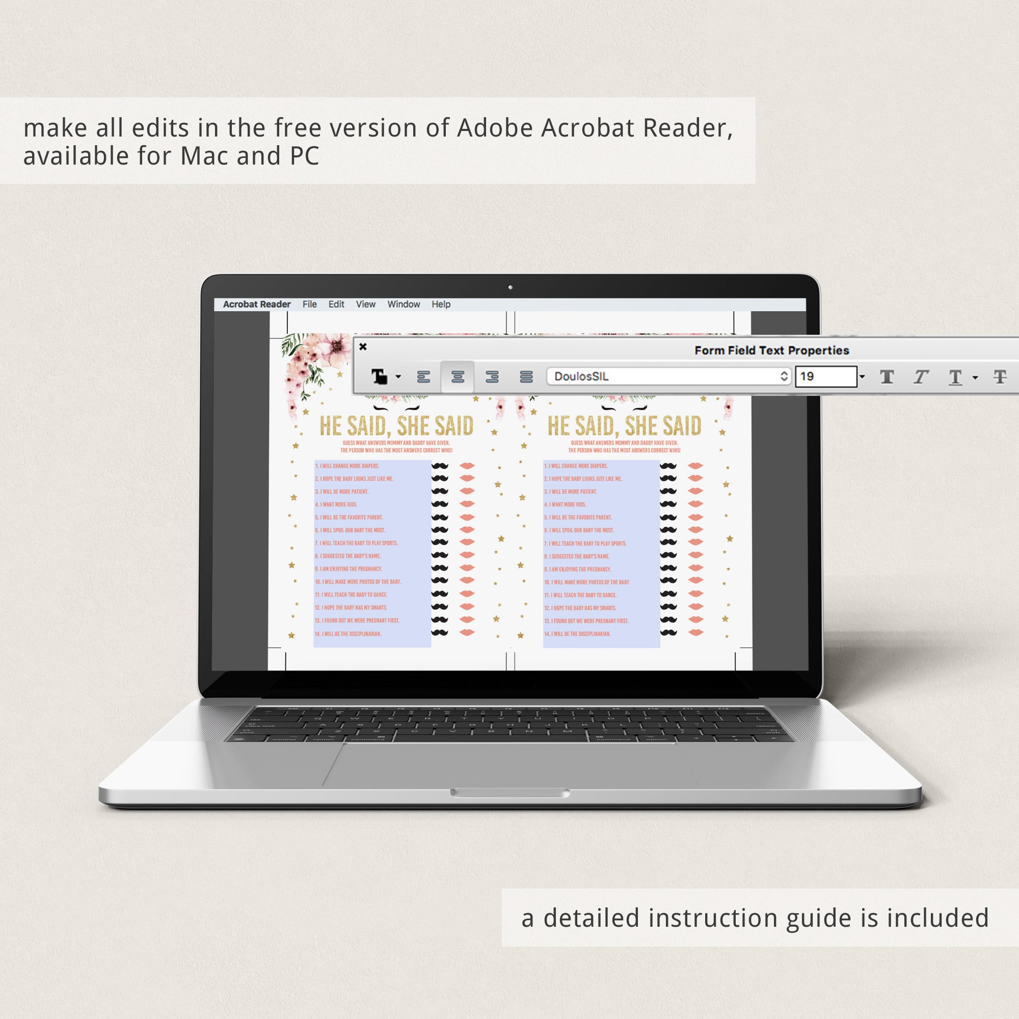 The game He Said, She Said is editable in the free version of Adobe Acrobat Reader, so that your can easily personalize the game. A detailed instruction guide with tips & tricks on editing, printing, trimming, paper choices and more is included. Print right from your computer in a matter of minutes or have the games printed at your favorite print shop.