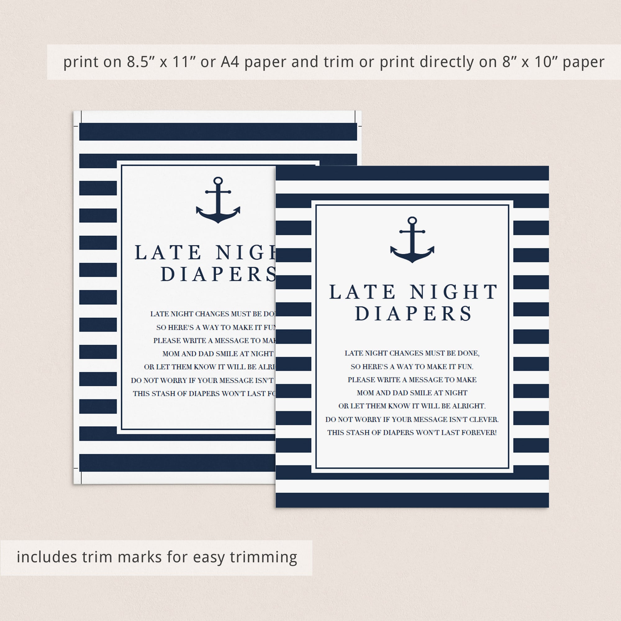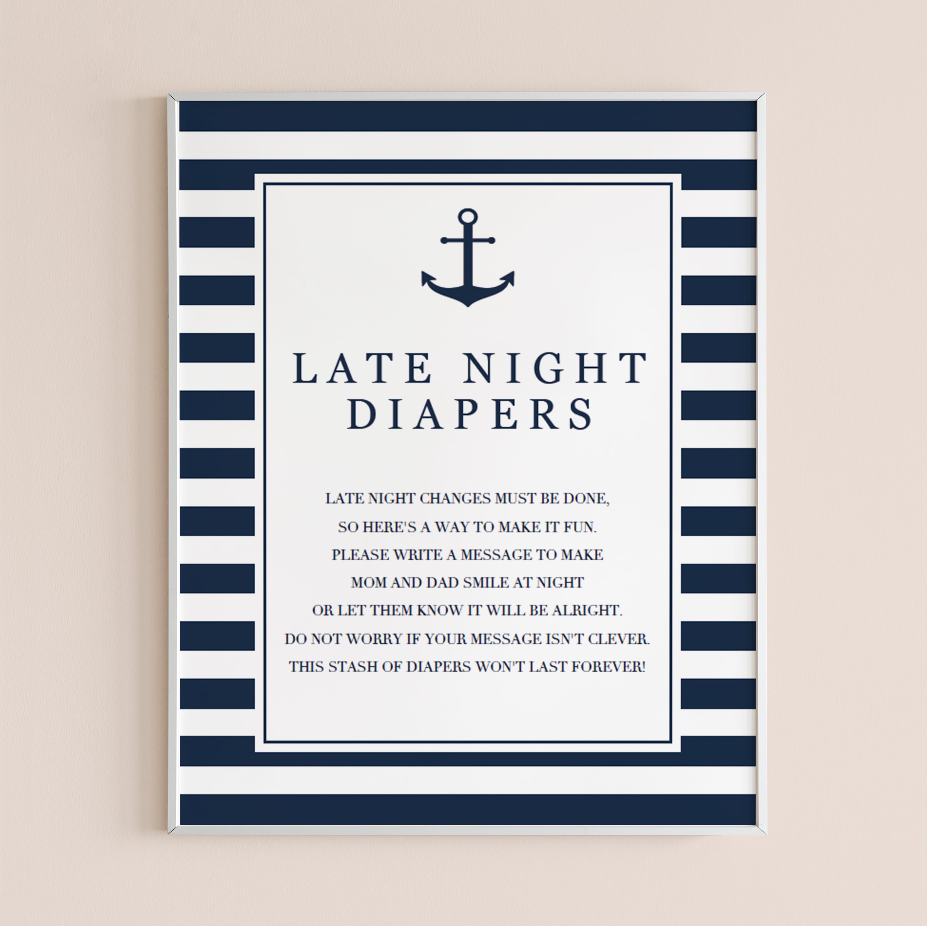 Display this navy and white midnight diapers sign along with a stack of diapers and Sharpie markers. Each guest will write a message on the diaper. They can draw something funny or write words of advice for the new parents to read while they change baby's diaper. Mom-to-be will definitely enjoy reading all of the messages when she is changing her new baby’s diapers.