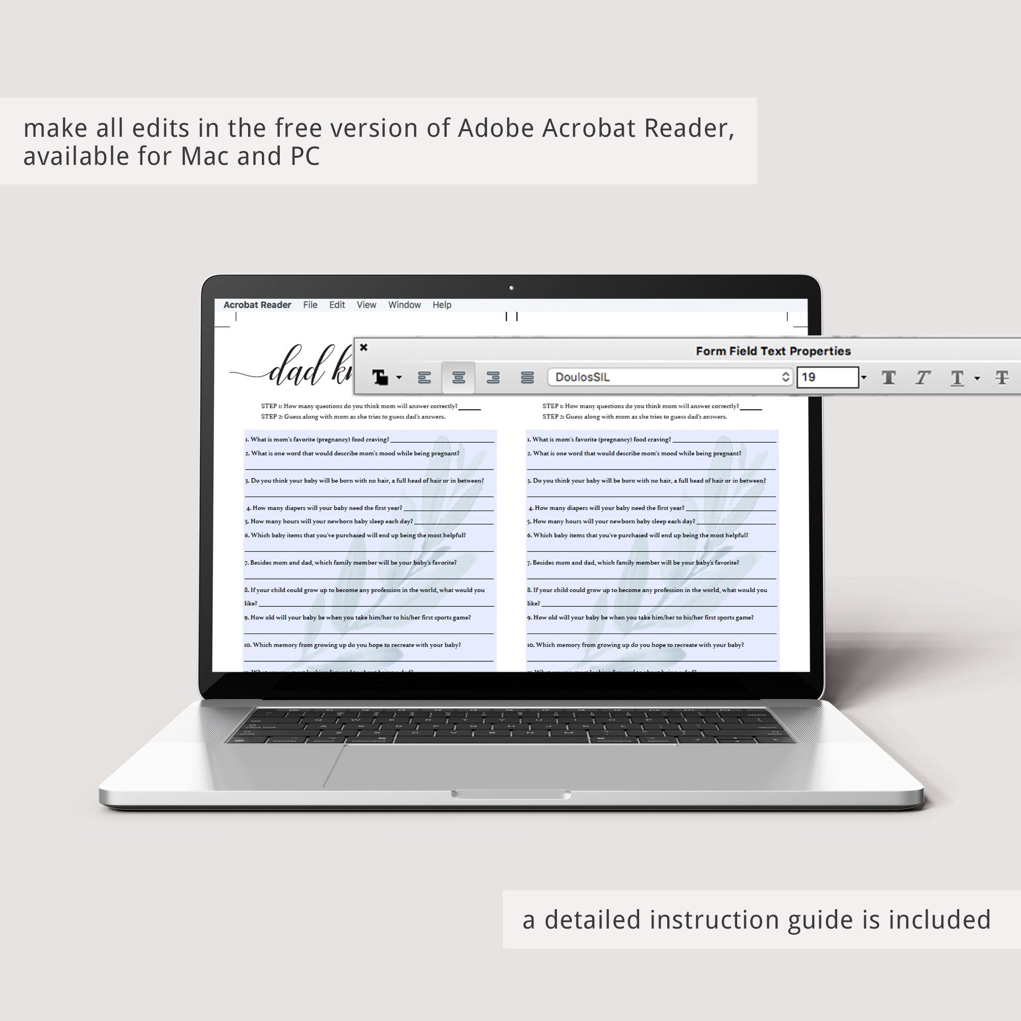 This baby shower Dad Knows Best game template is editable in Adobe Acrobat Reader (free download). After downloading the file, fill in your own questions and print in just minutes. Print the game cards on any 8.5" x 11" paper of your choice. We recommend a nice heavy card stock for the highest quality feel. A detailed instruction guide with tips & tricks on editing, printing, trimming, paper choices and more is included.