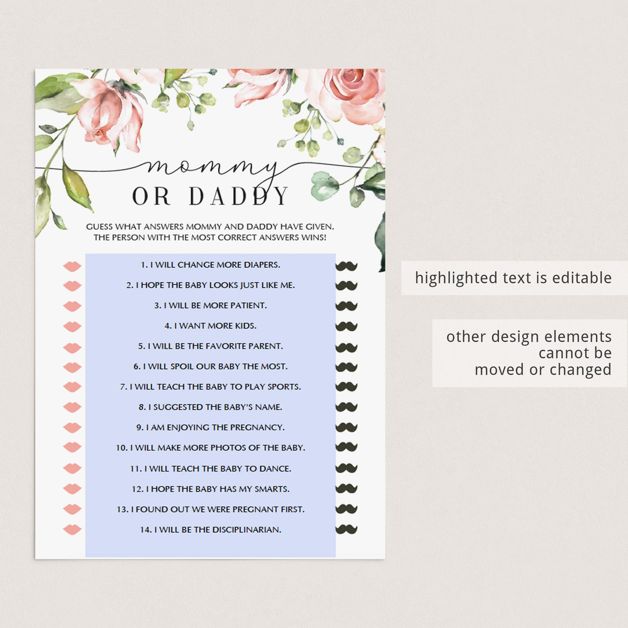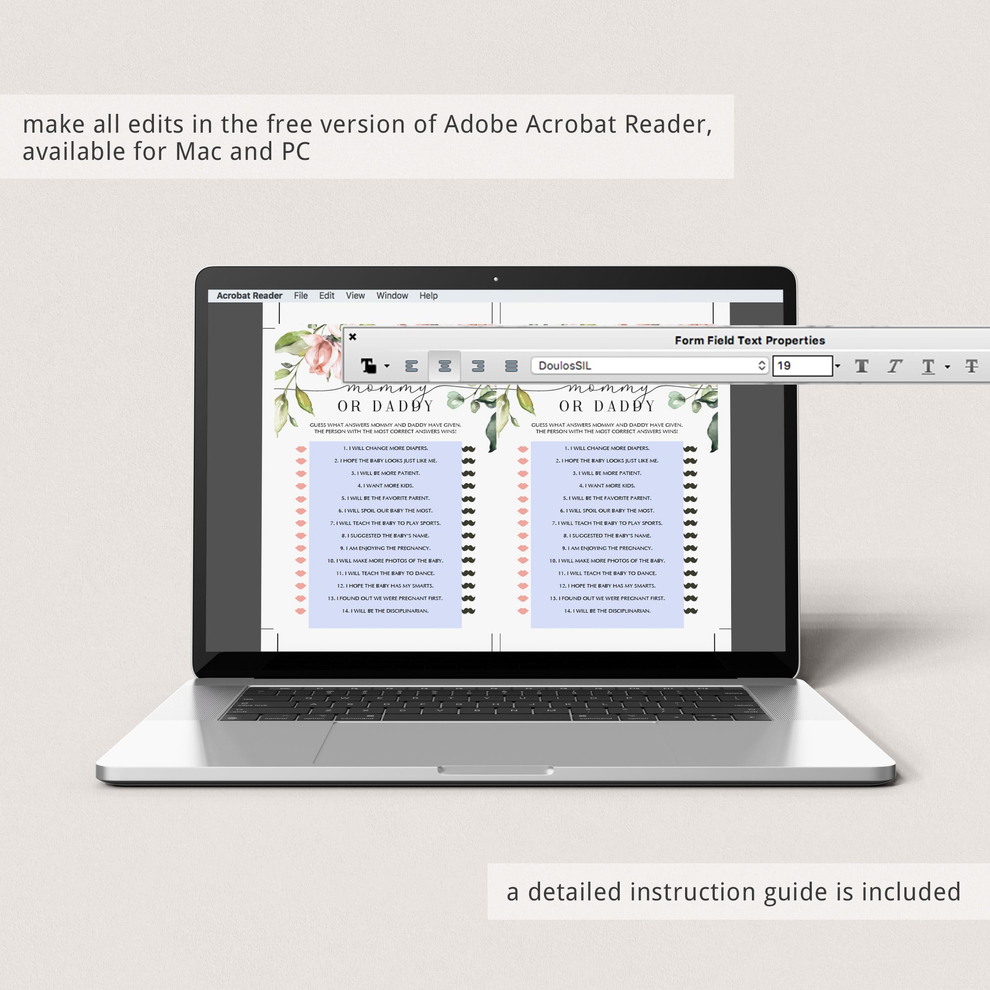 The game Mommy or Daddy is editable in the free version of Adobe Acrobat Reader, so that you can personalize the game (please check the photos to see what parts can be edited).