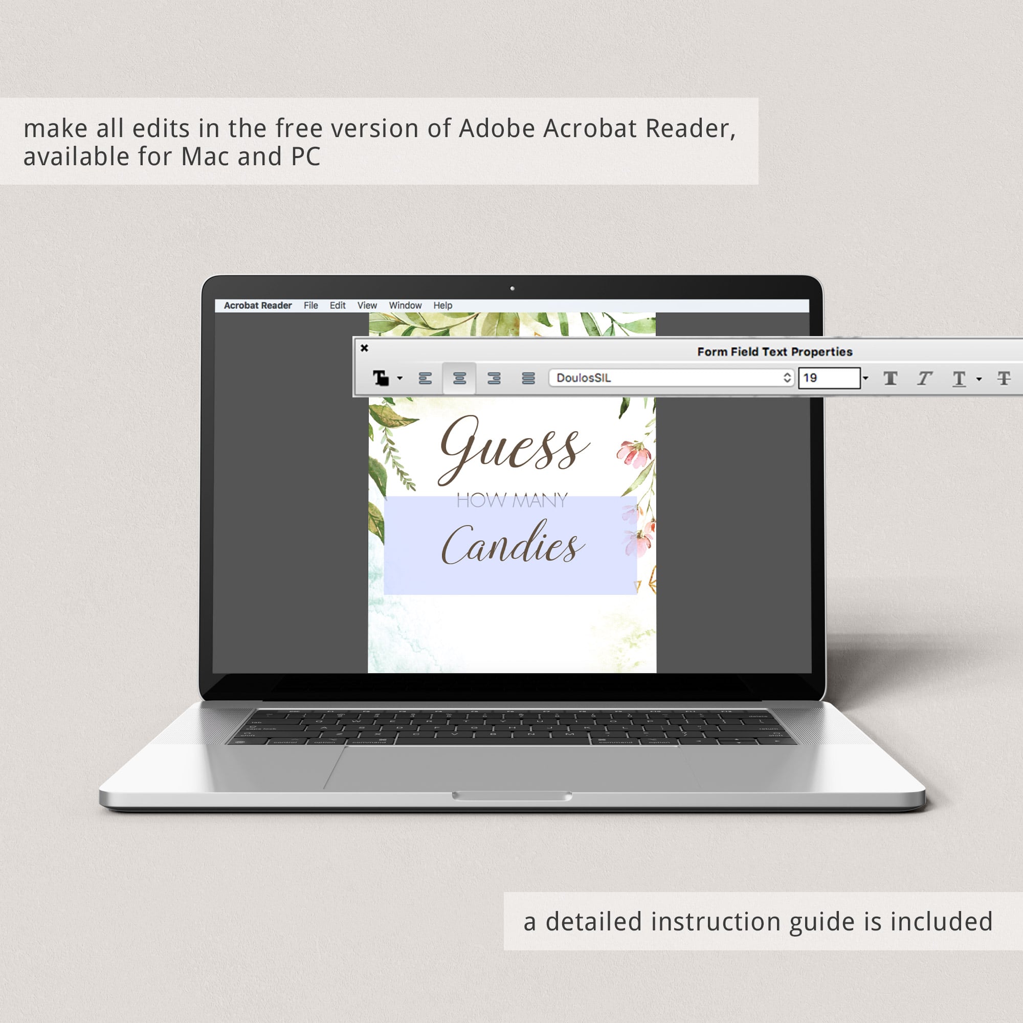 The Guess How Many sign is editable in the free version of Adobe Acrobat Reader, so that you can easily personalize the sign with your own words.