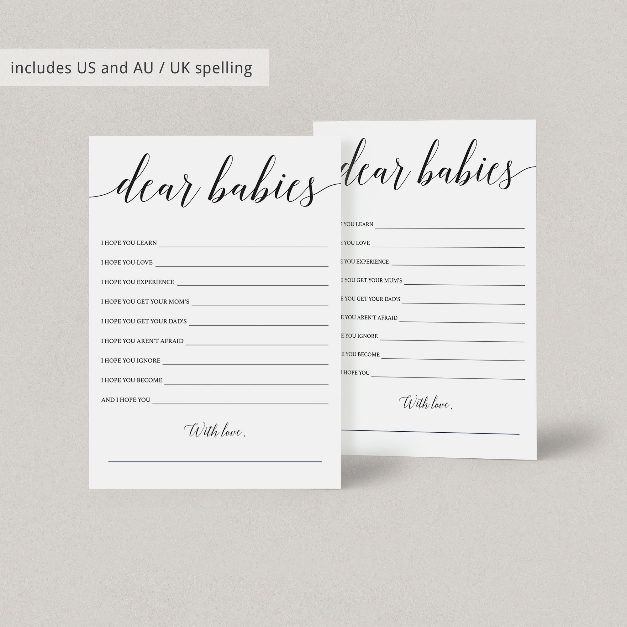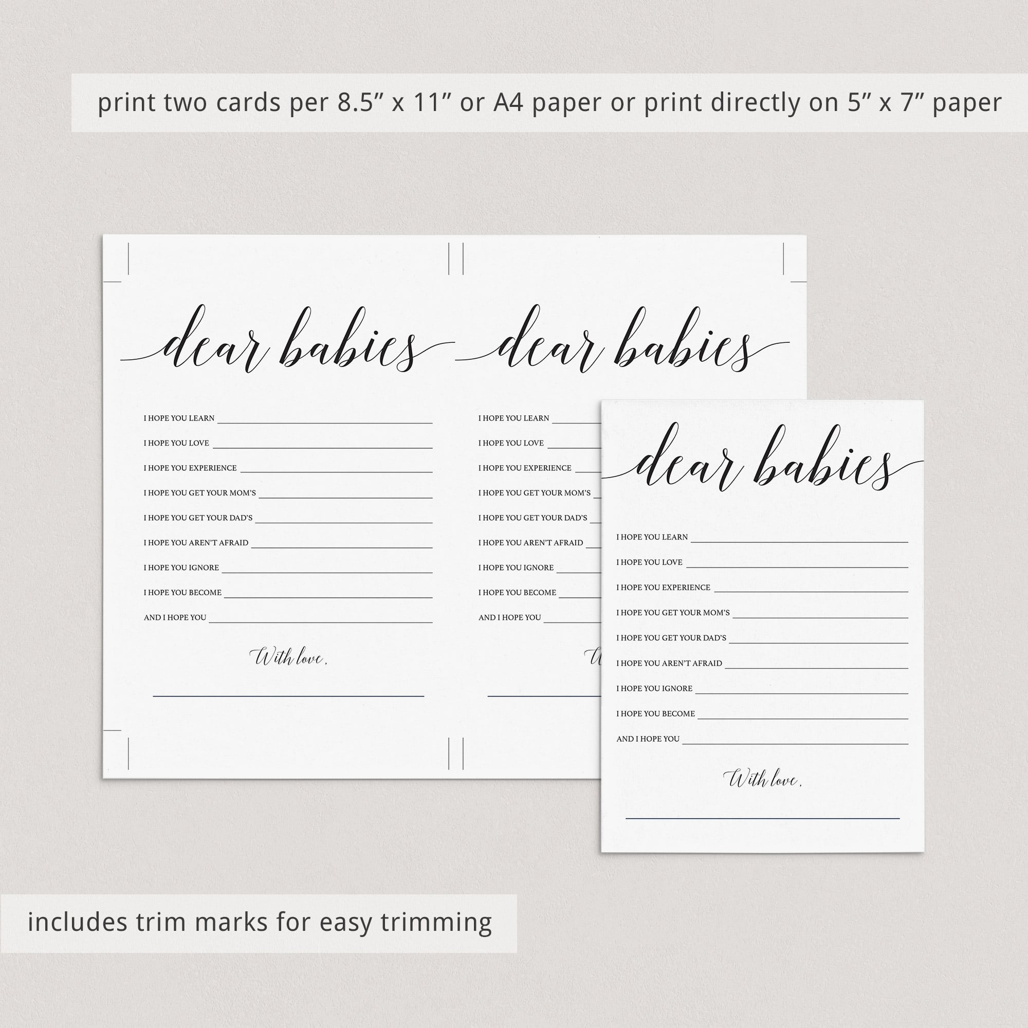 This calligraphy baby shower wish card is an instant download, so simply download and print the dear babies cards as many times as you need. The card has been designed in black and white. You can print on kraft paper to create a rustic look or print on colored cardstock for beautiful results. We recommend printing on a nice heavy card stock for highest quality feel.