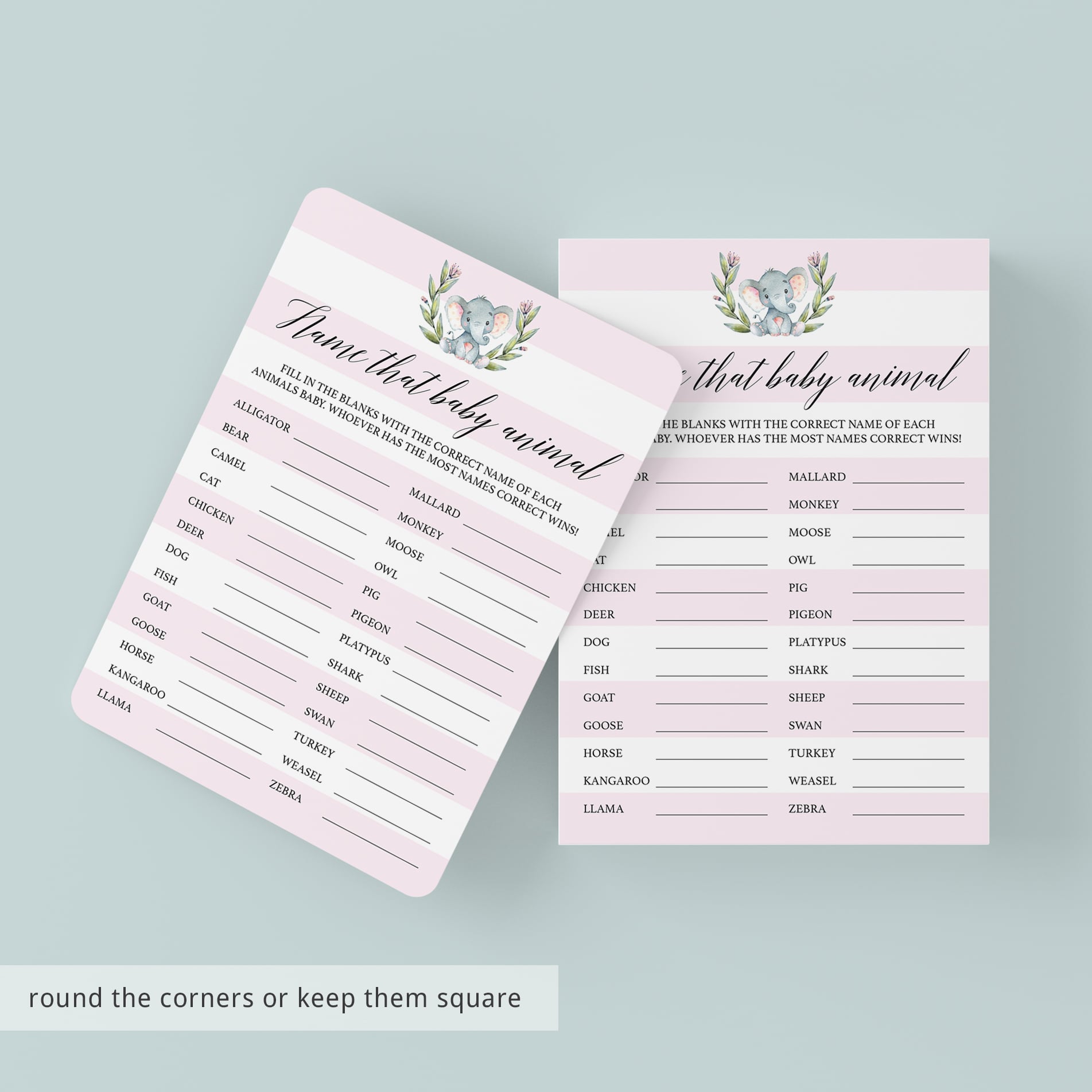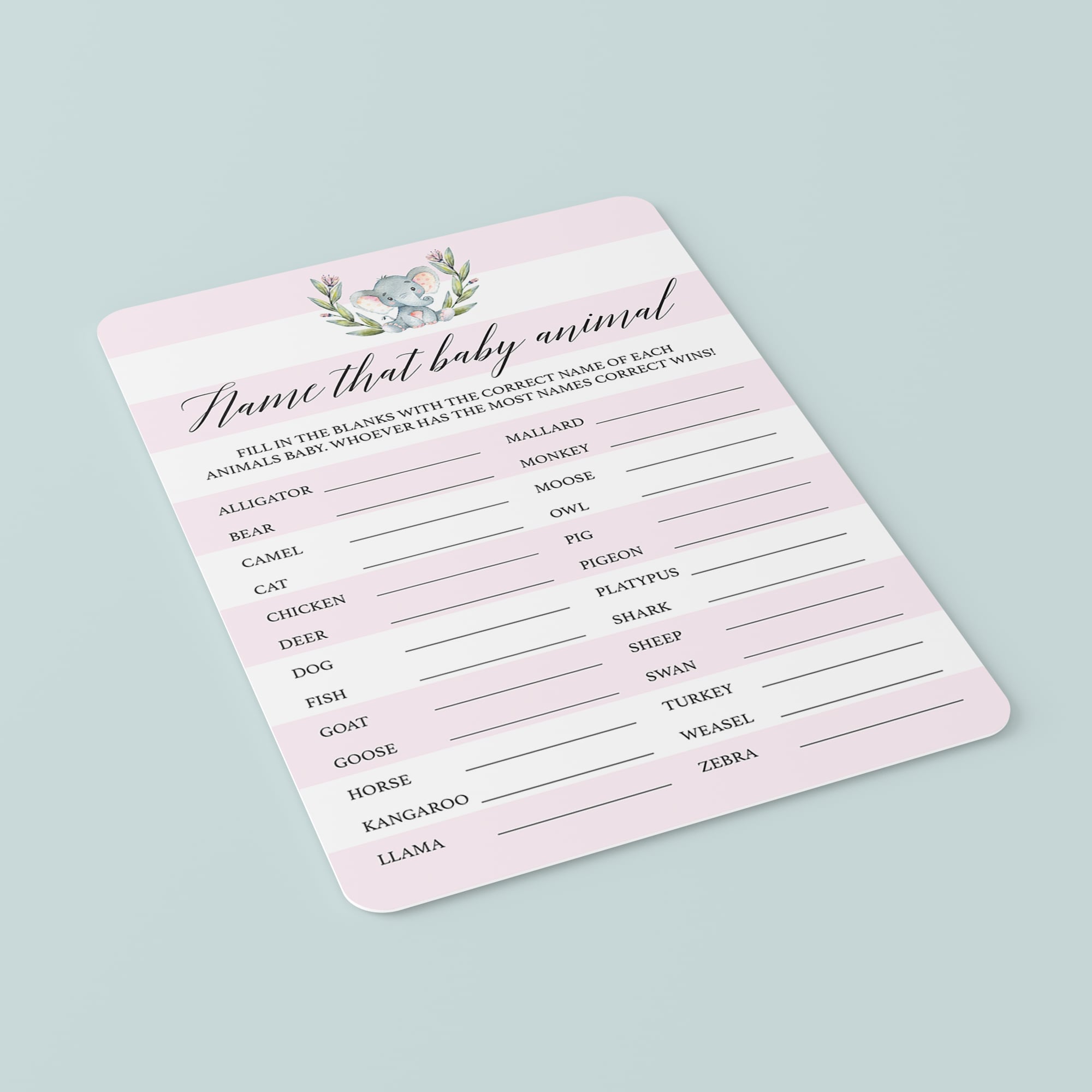 This gir baby shower Name That Baby Animal game has a list of 26 animals and a space for your guests to write on. Ask your guests to write the proper name for the animal’s baby opposite the animal name. Whoever has the most names correct wins. An answer key is included.