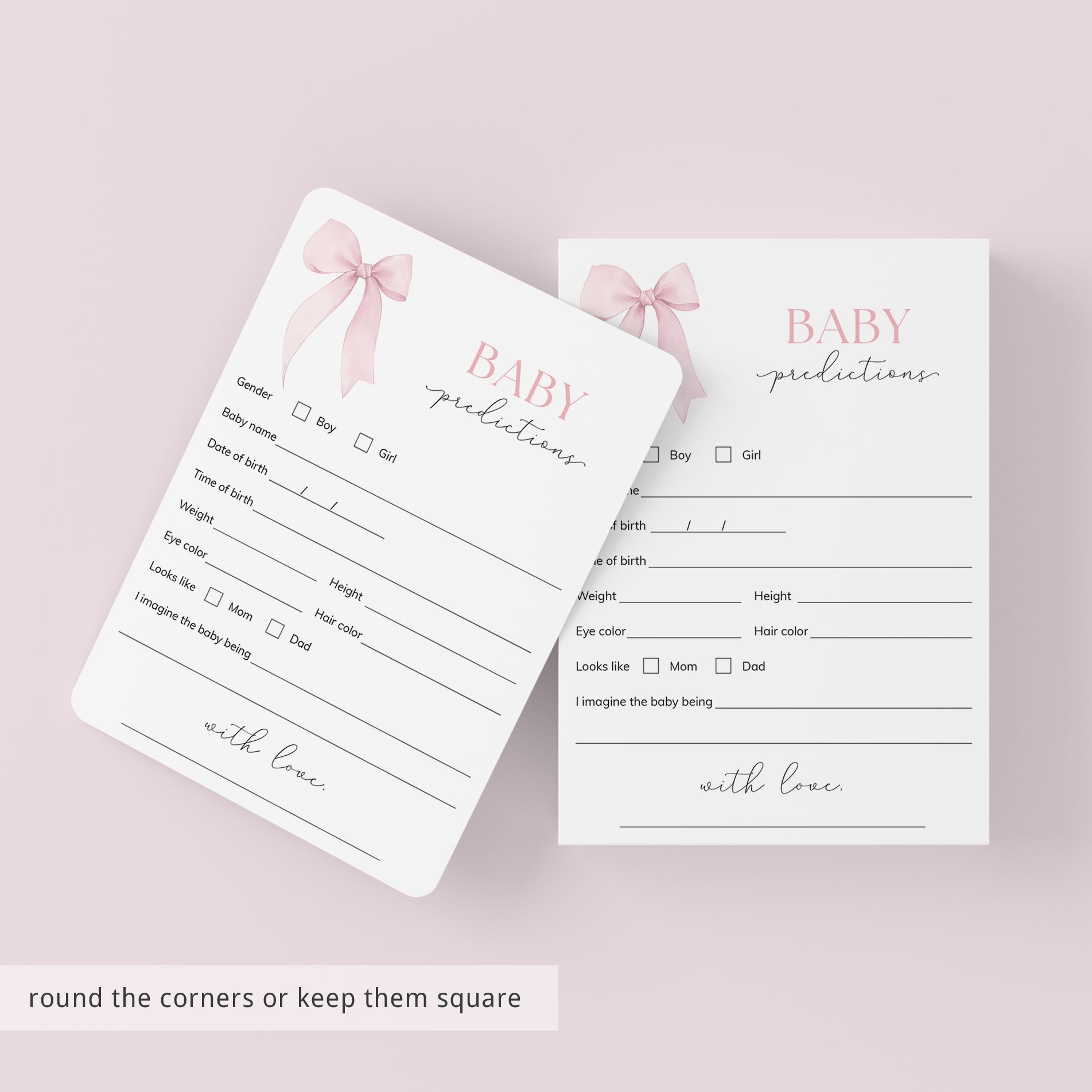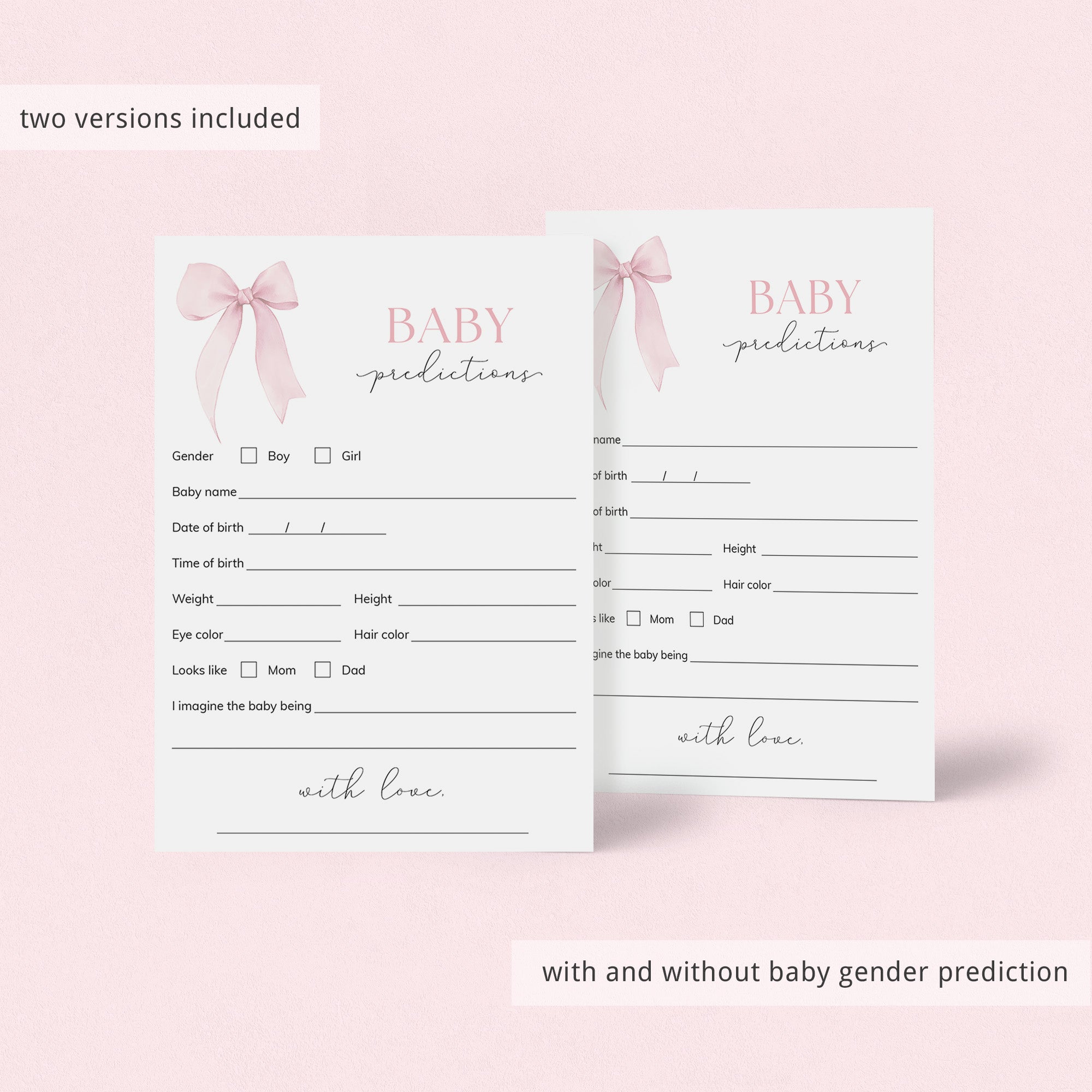 • Baby Predictions card (two versions included, with and without baby gender prediction).