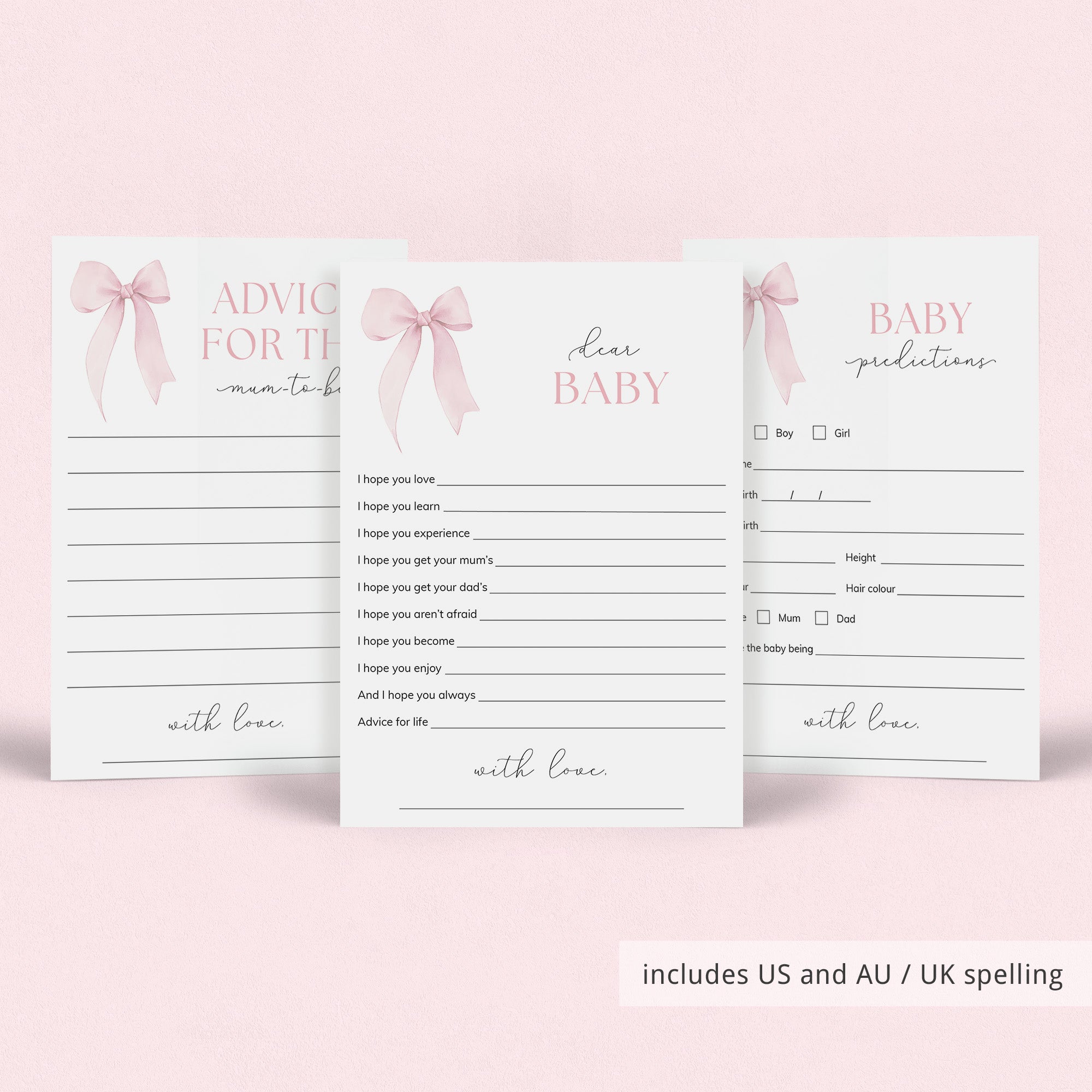 Advice card for the mom-to-be and for the parents-to-be, Baby Predictions card with and without baby gender prediction, Baby Wishes card, in US English and AU / UK English, each: