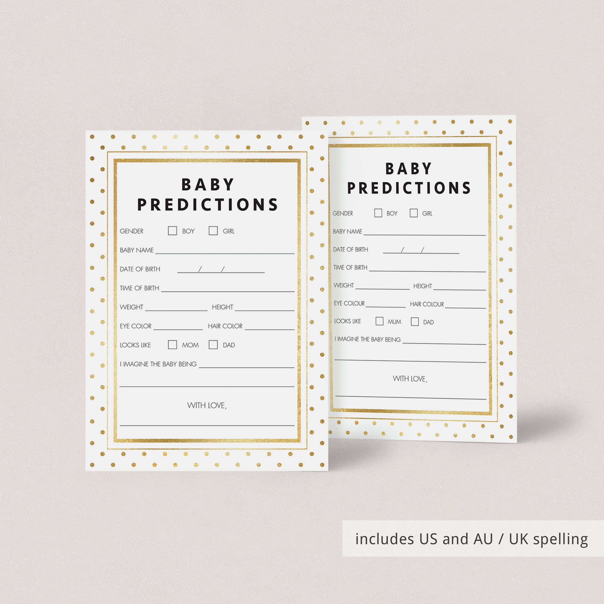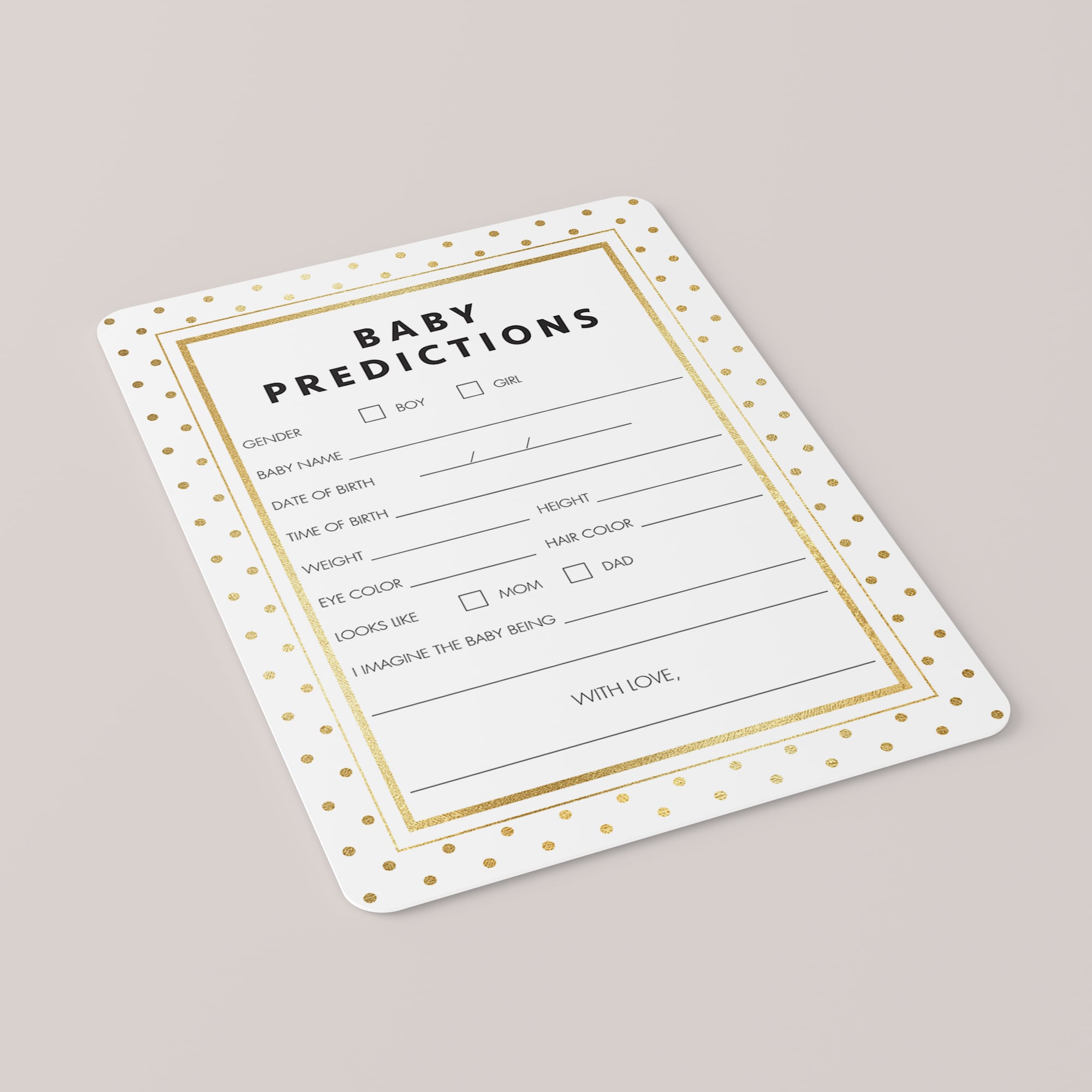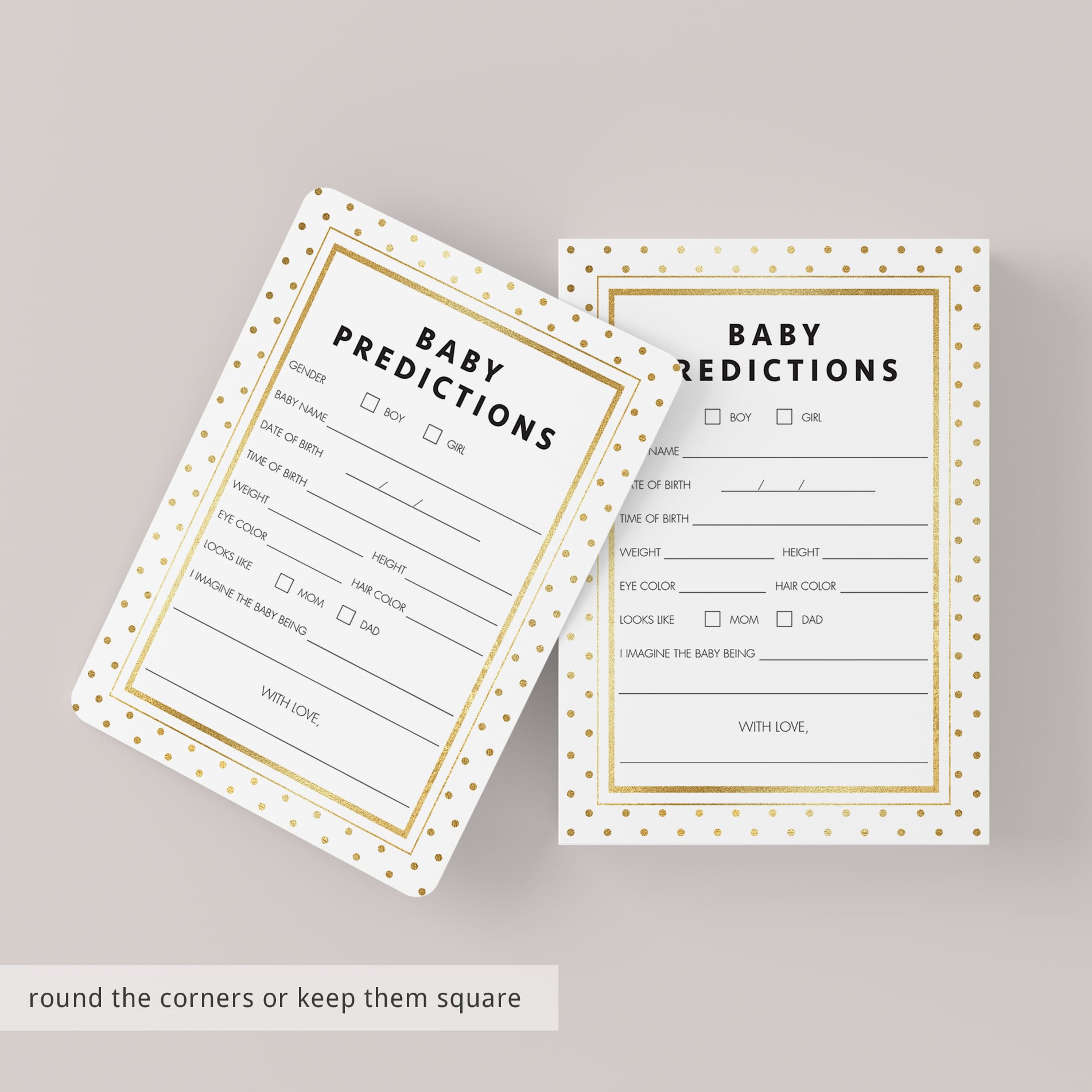Pass the gold prediction cards around during the party where guests can fill them in with their predictions and wishes for the new baby!
