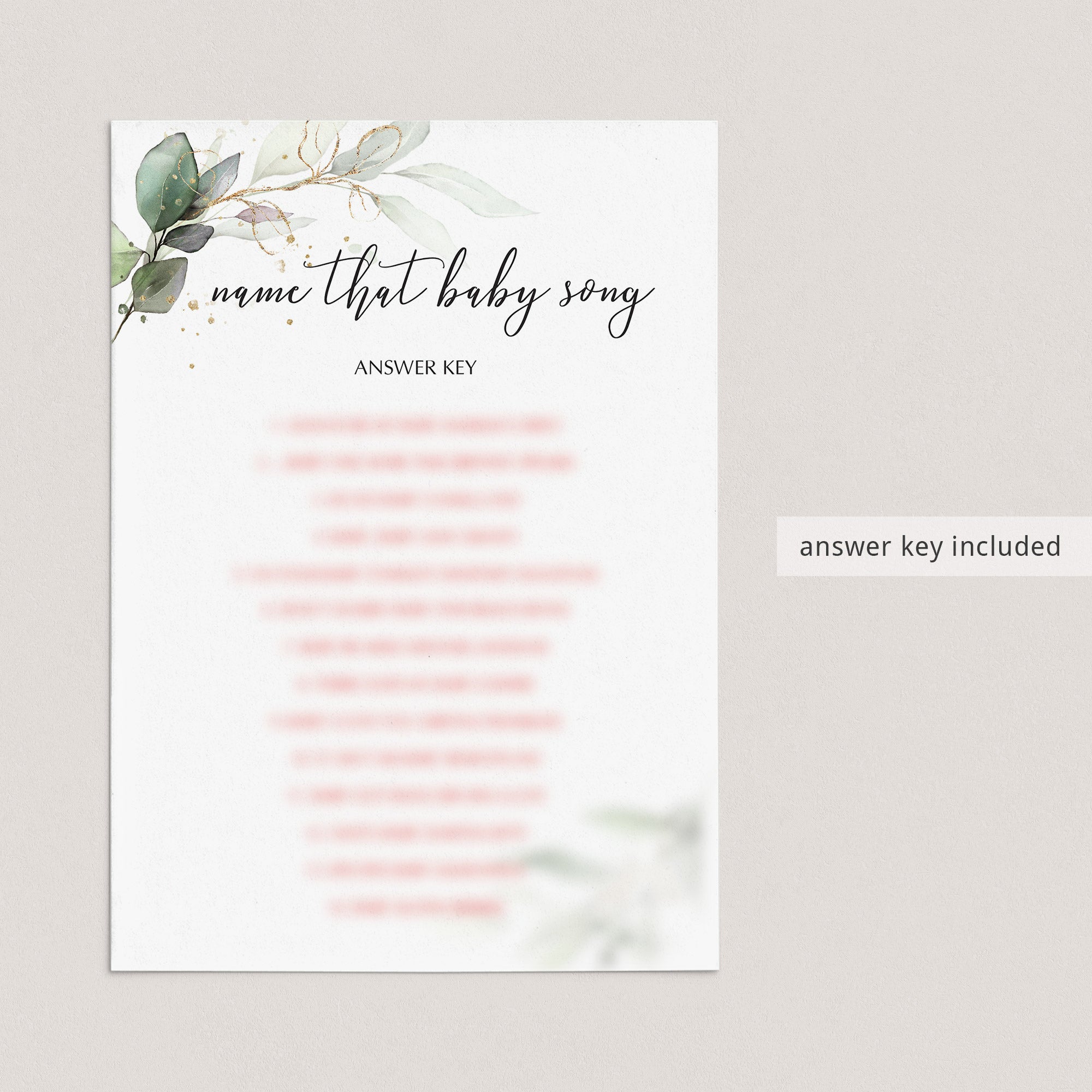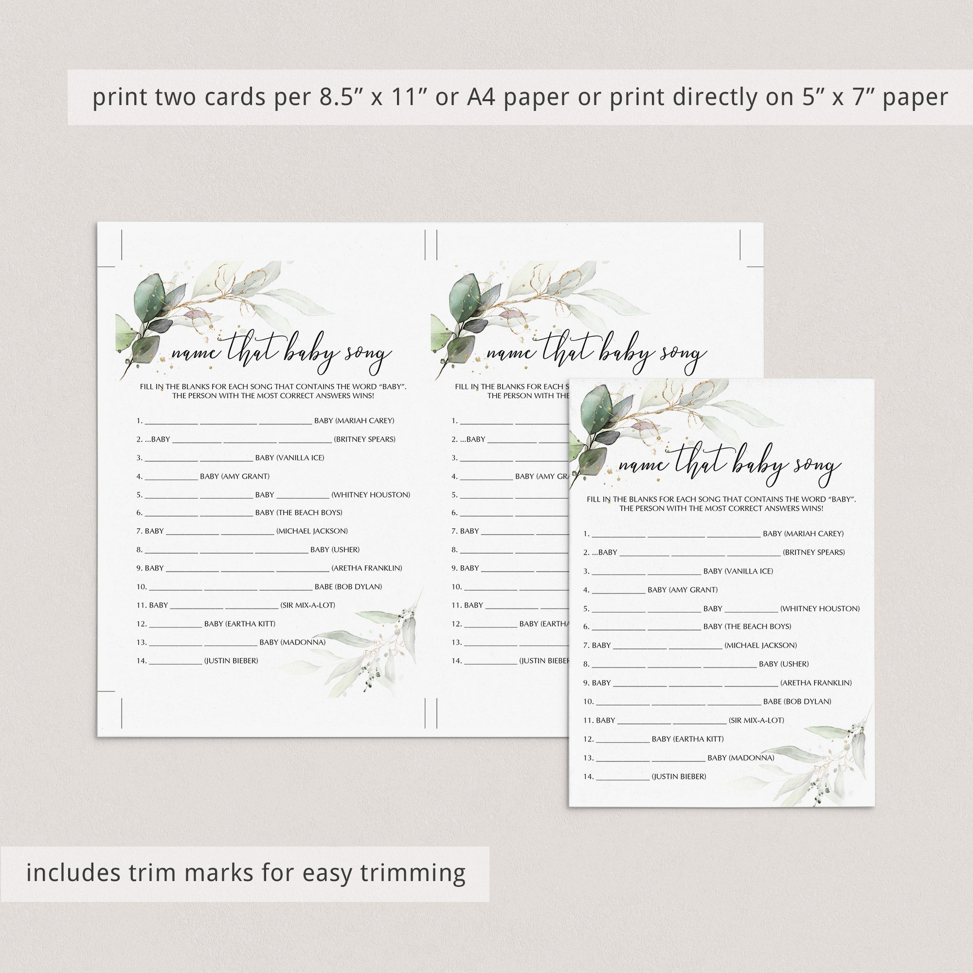 Then let your baby party guests have fun with this gold and greenery Name That Song game. It is the perfect addition to your modern chic baby shower.