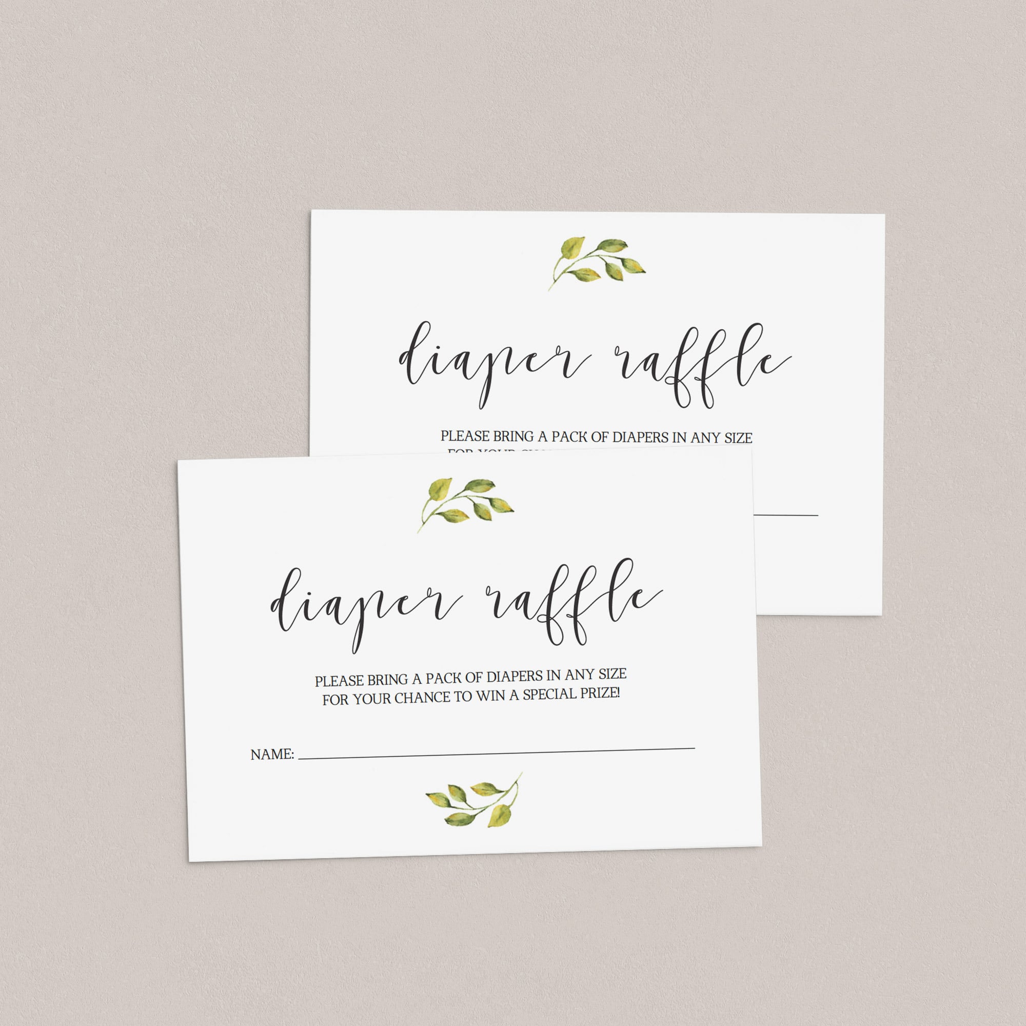 Who doesn't love a diaper raffle during a baby shower? Use this minimal green diaper raffle ticket to let your guests know they can win a great prize by bringing a pack of diapers. Include the diaper raffle tickets with tiny leaves in your baby shower invitations before sending them out.