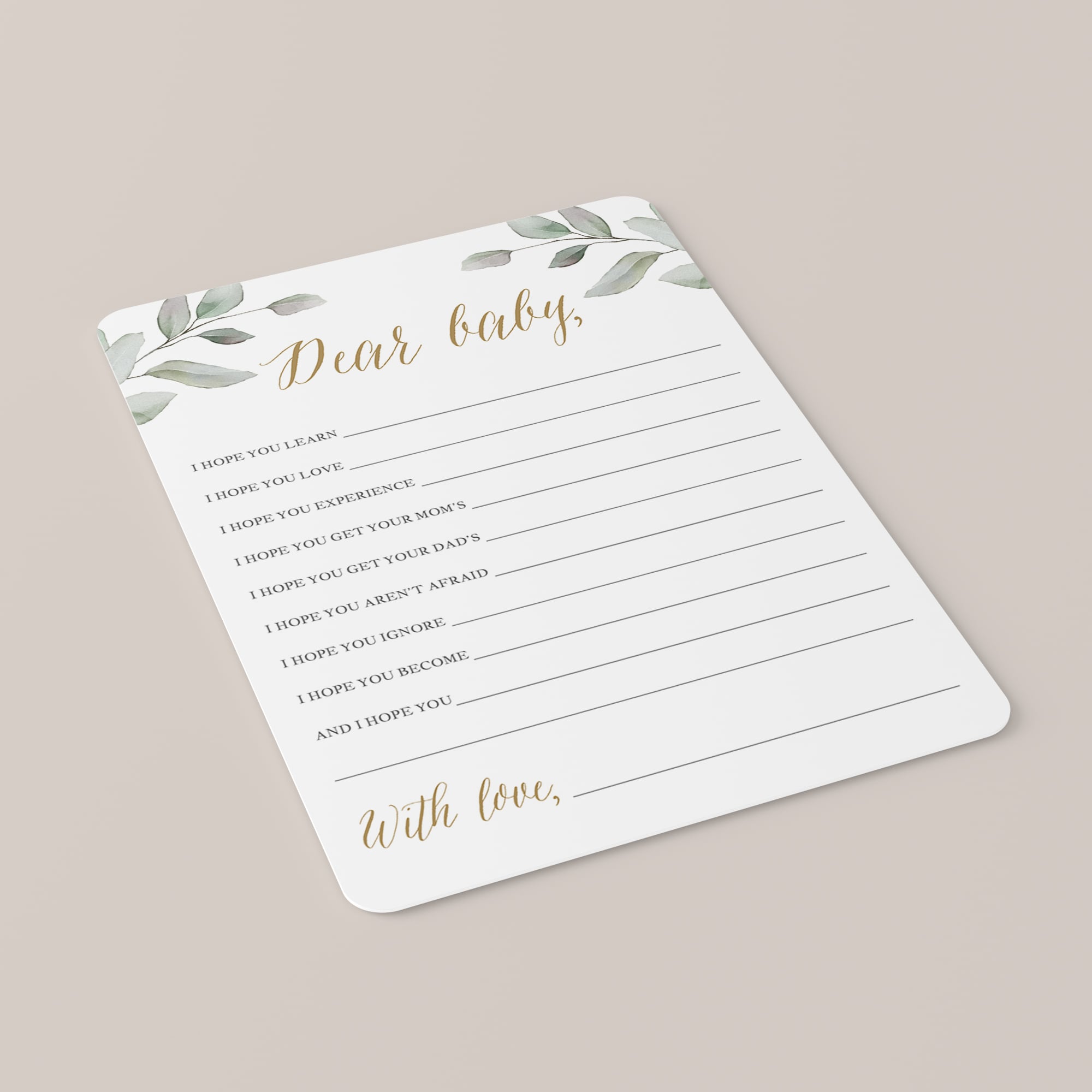 Create a magnificent keepsake for the new mom with this greenery and gold baby shower Dear Baby wishes cards. Let every baby shower guest write down their wishes for the new baby and collect the cards for the lucky mom-to-be.