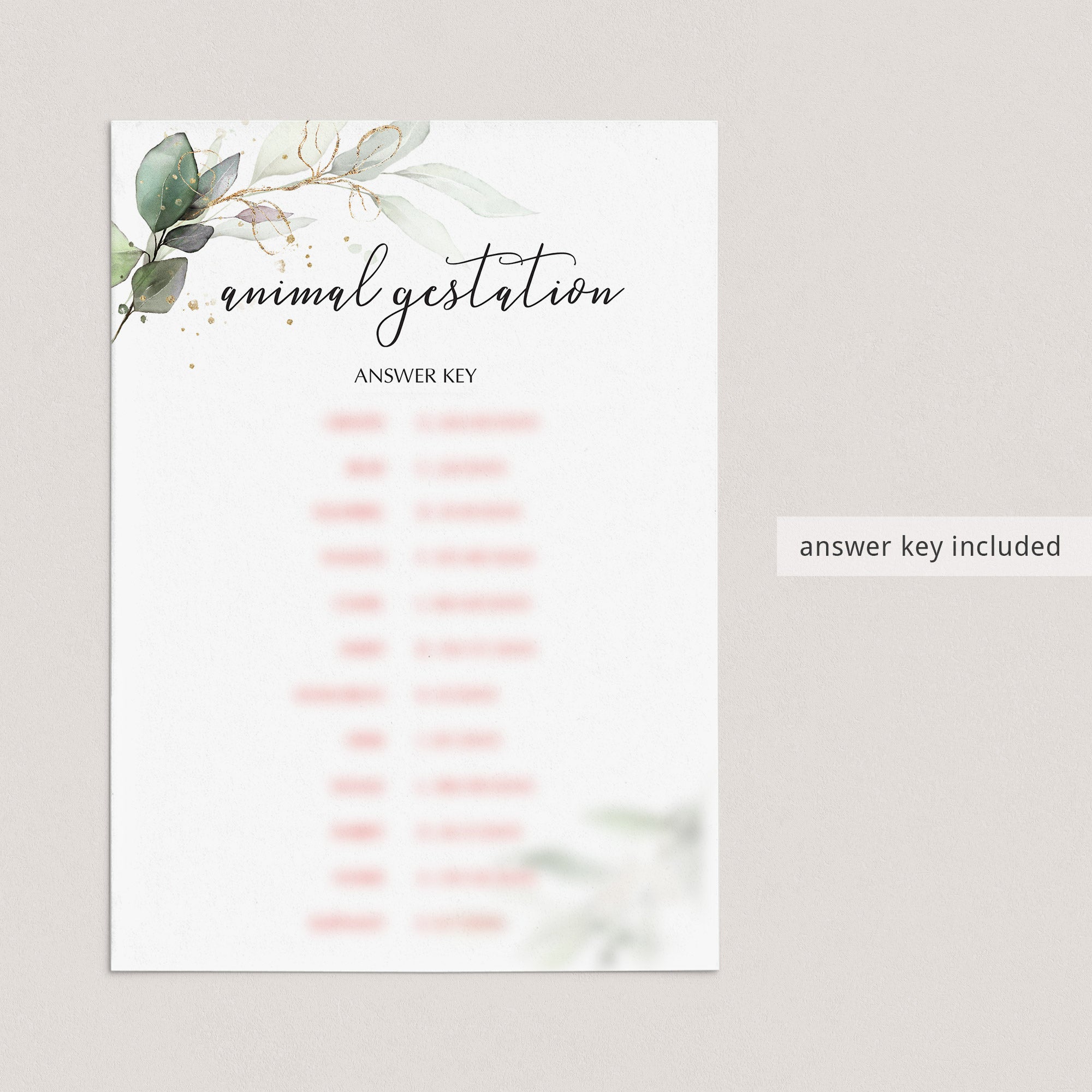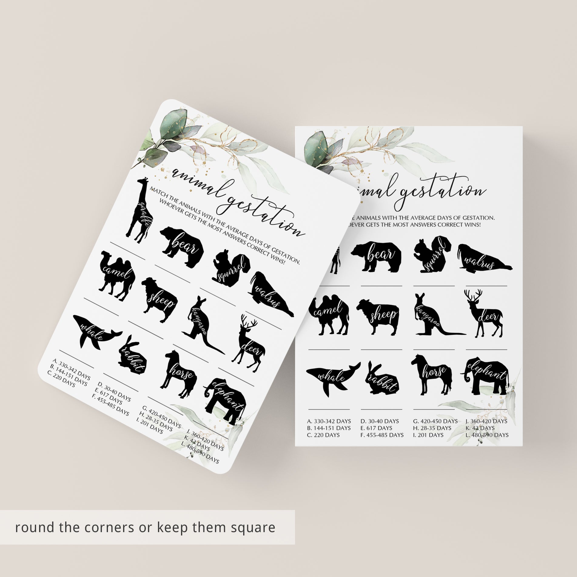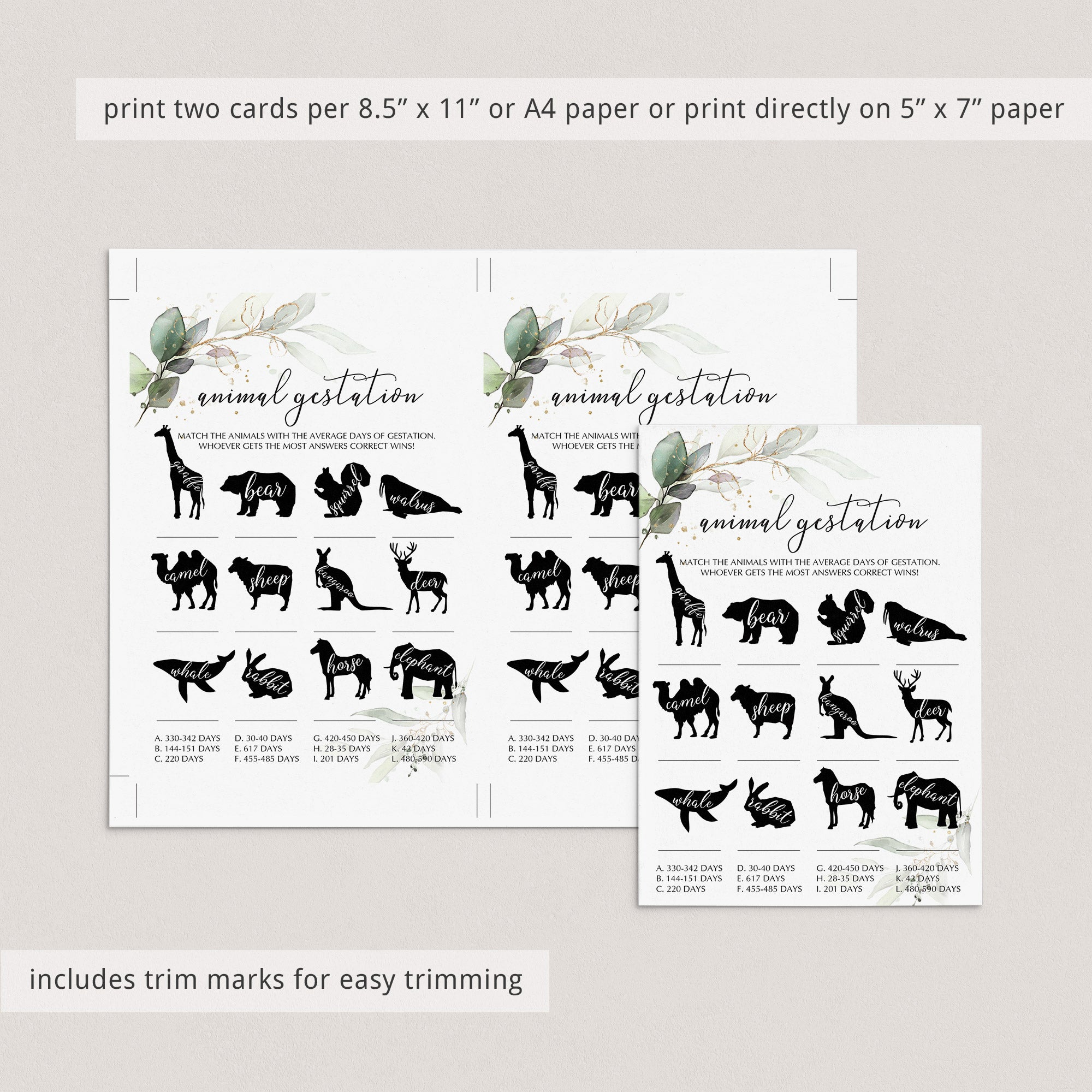 Test your baby shower guests' knowledge of animal gestation periods with this modern chic Greenery and Gold Baby Shower Game Animal Gestation Match. The game with animal silhouettes and watercolor greenery is perfect for your modern baby party. Animal games are always a huge hit at baby showers.