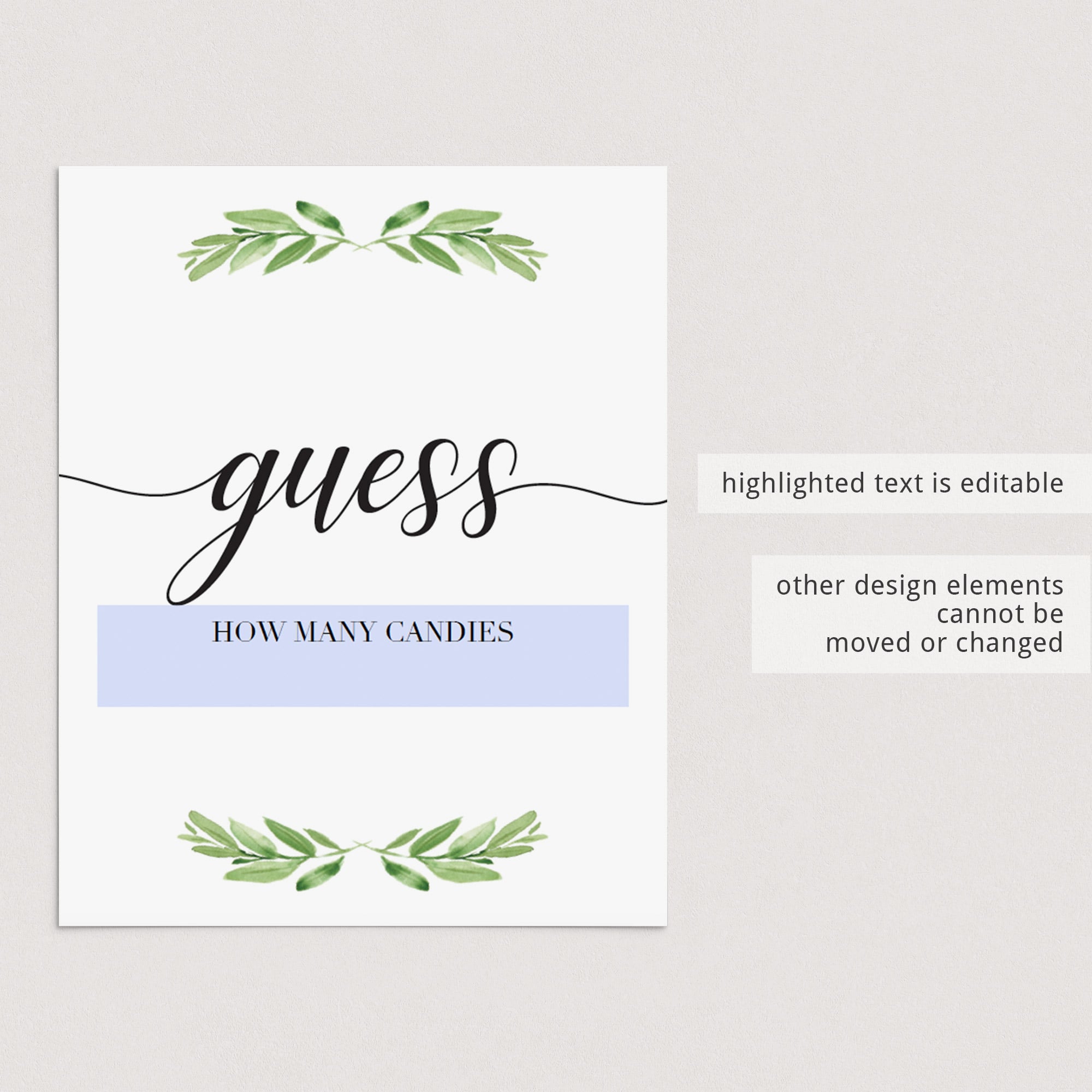 Guessing games are a huge hit at baby showers. Most people love the fun of guessing and the potential thrill of finding out they have guessed right. Kick off the fun and get your guests involved with this bundle of greenery baby shower guessing signs and cards. The green signs and matching guessing cards with watercolor leaves are perfect for any gender neutral baby shower.