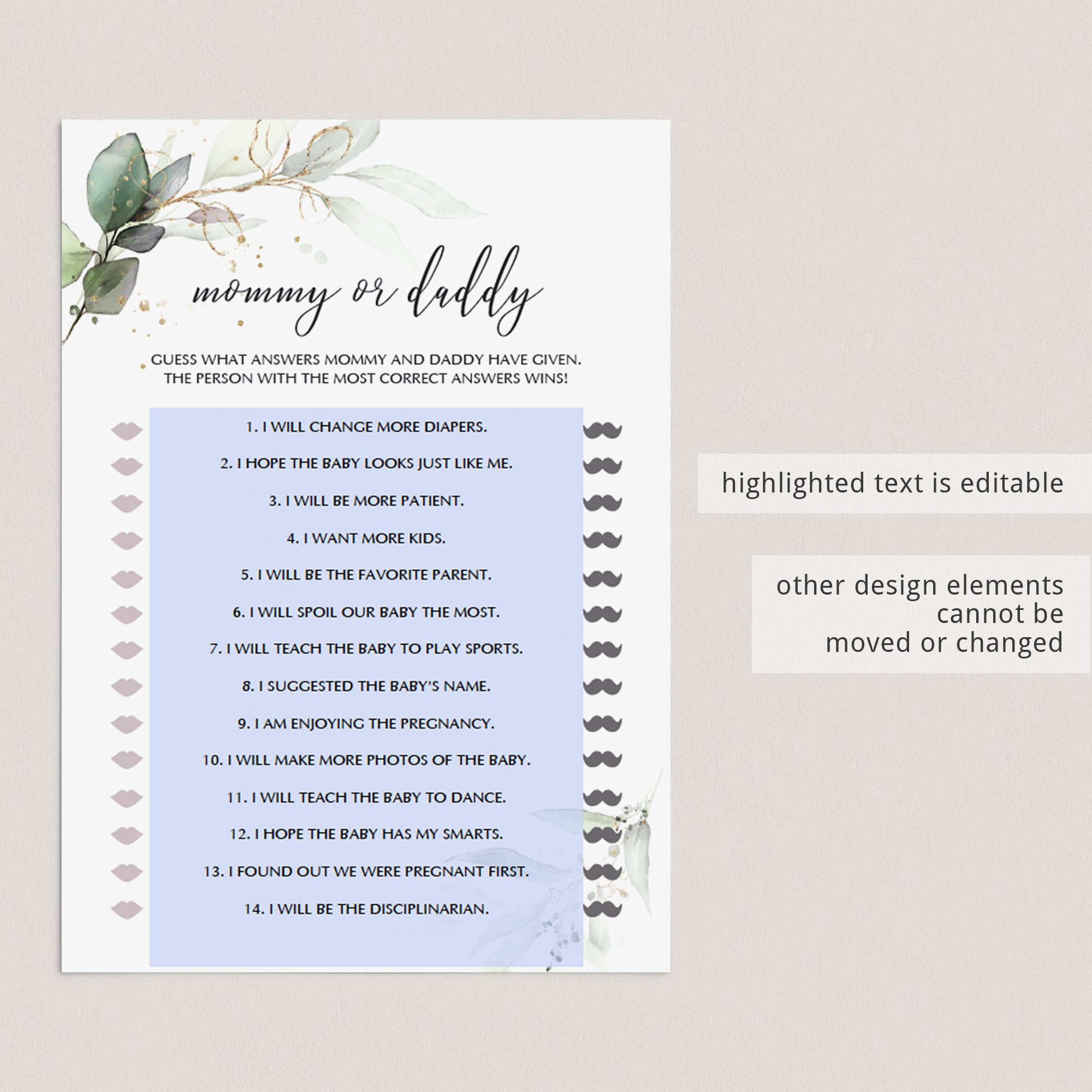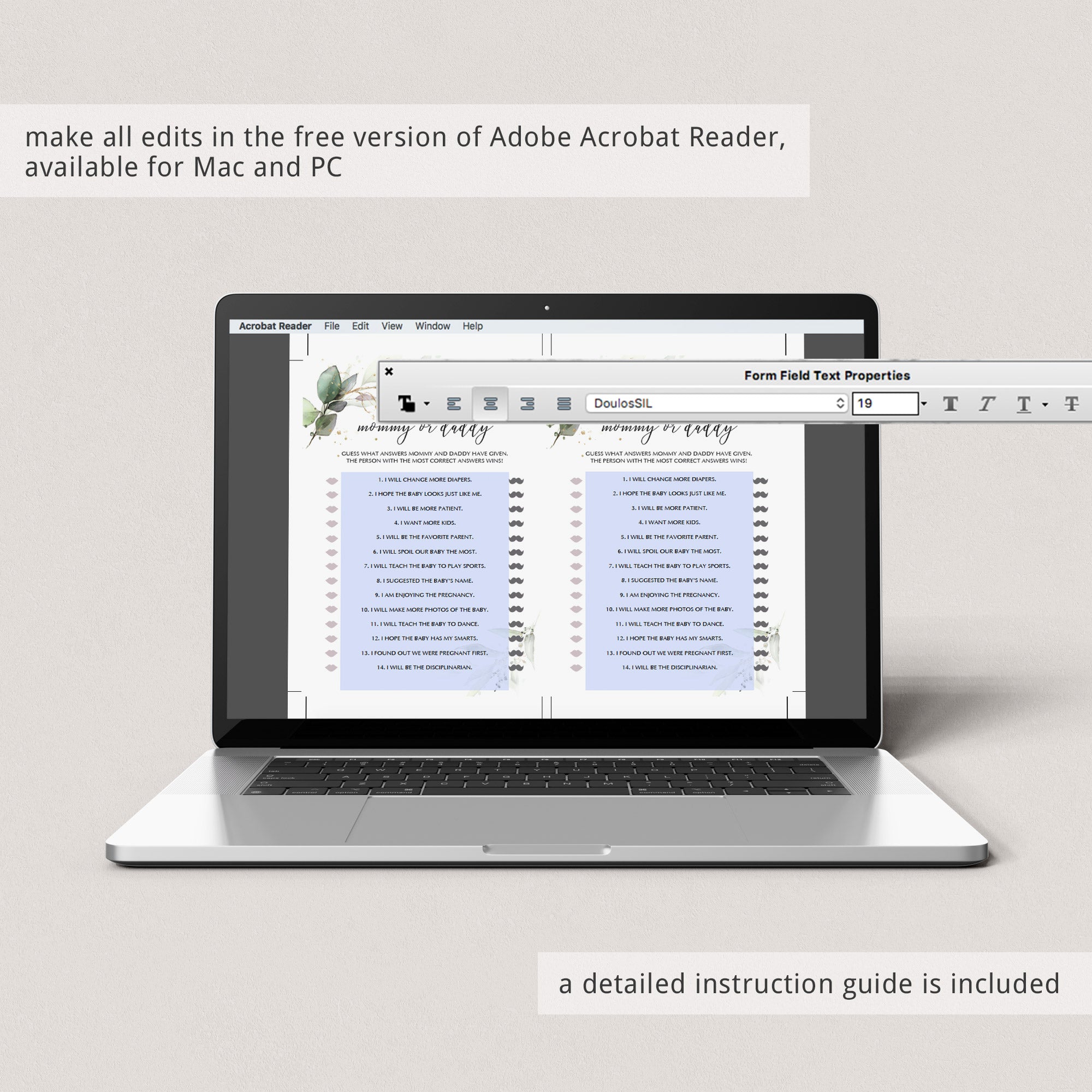 The game Mommy or Daddy is editable in the free version of Adobe Acrobat Reader, so that your can personalize the statements. A detailed instruction guide with tips & tricks on editing, printing, trimming, paper choices and more is included.