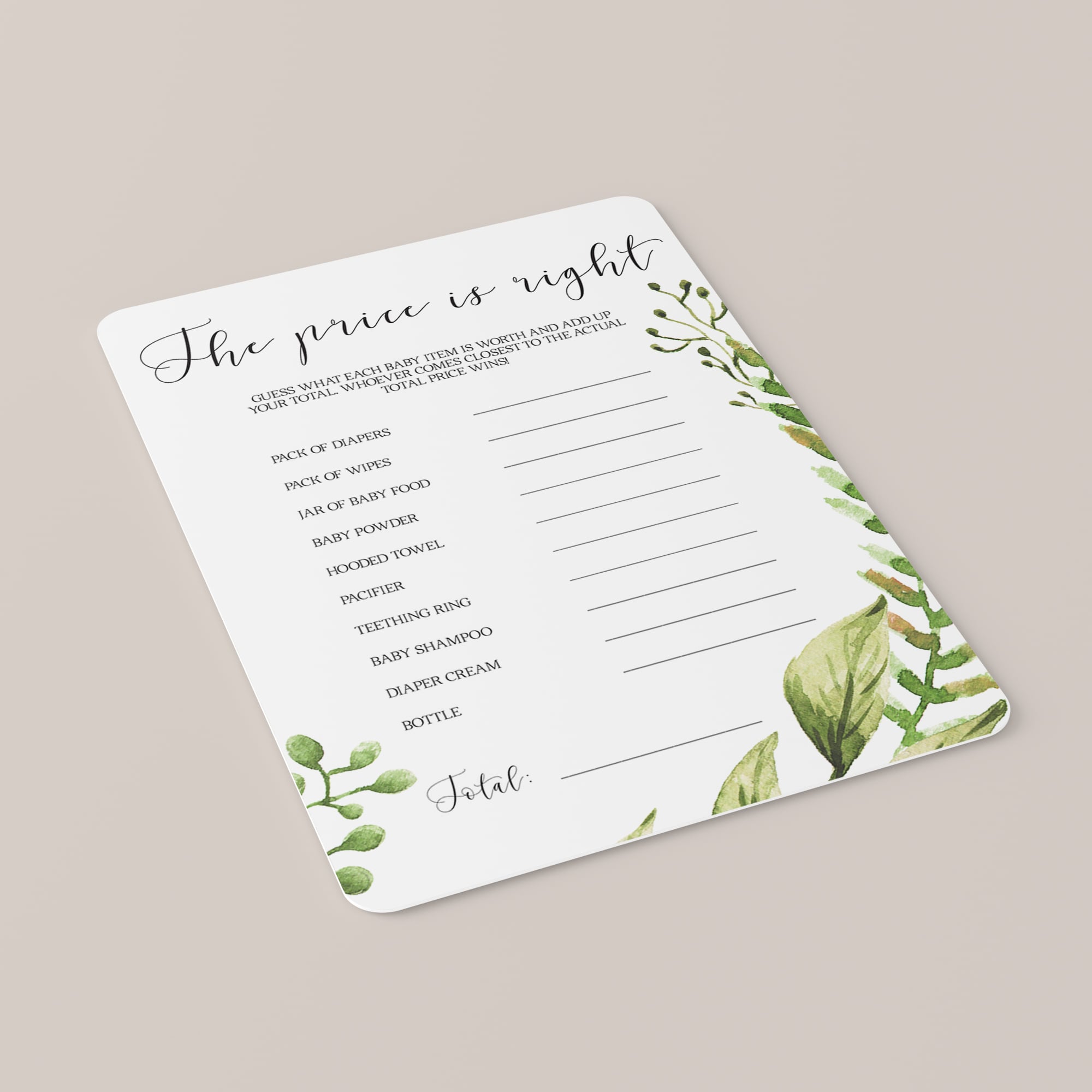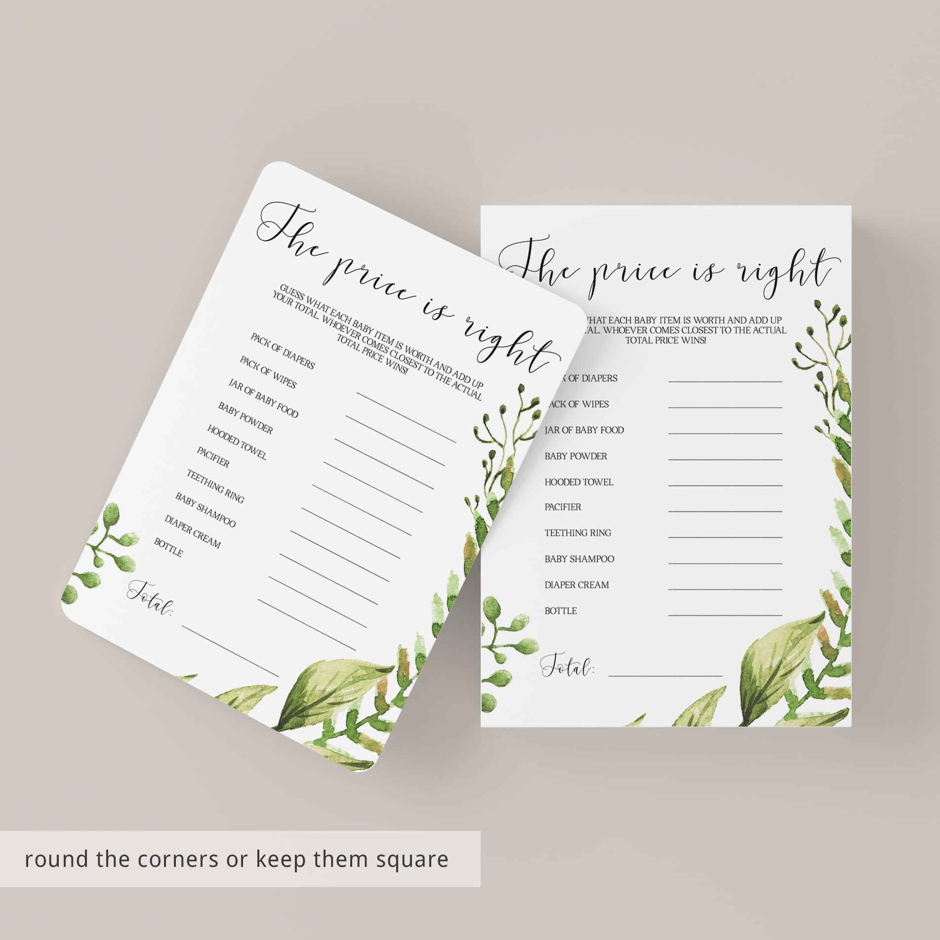 Play "The Price is Right" at your baby shower with these gorgeous greenery game cards. The neutral cards with green leaves would be perfect for a garden or botanical themed baby shower and will create an enjoyable moment for all of your guests.