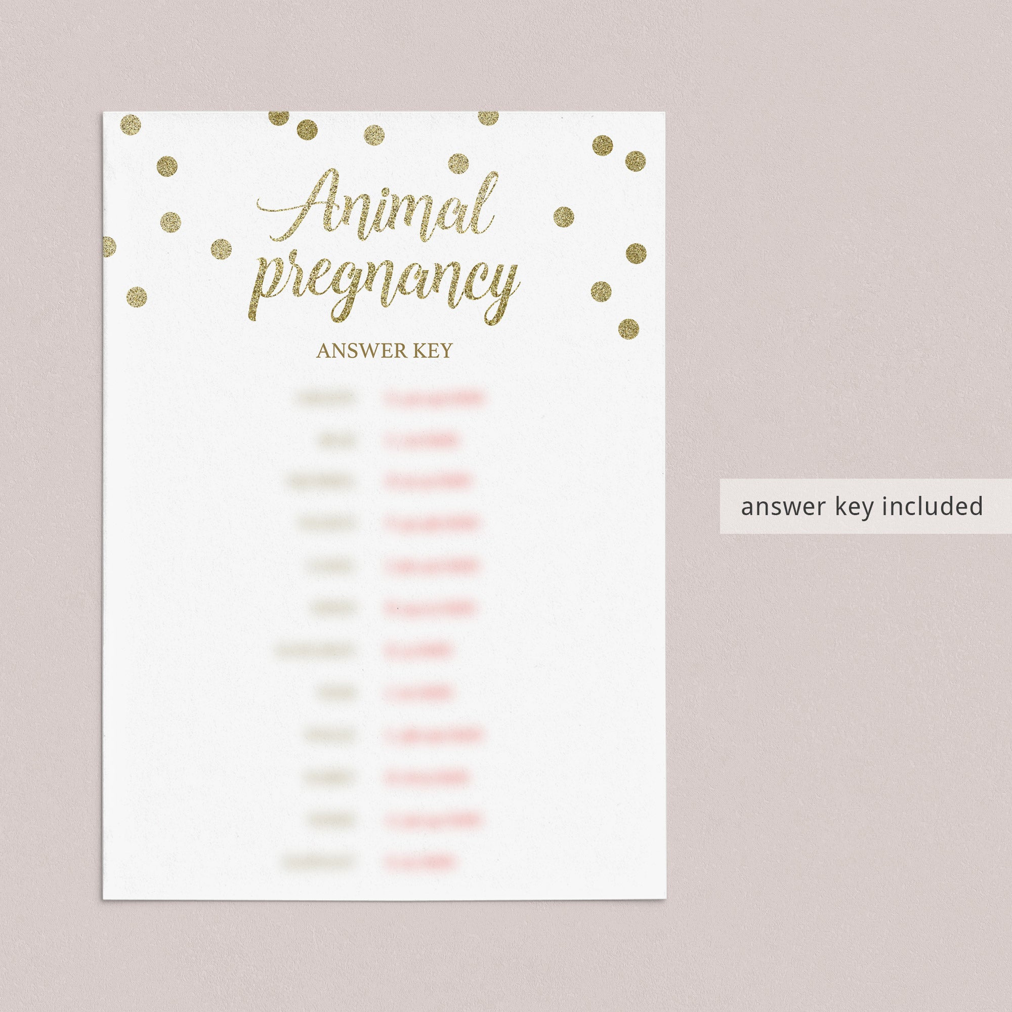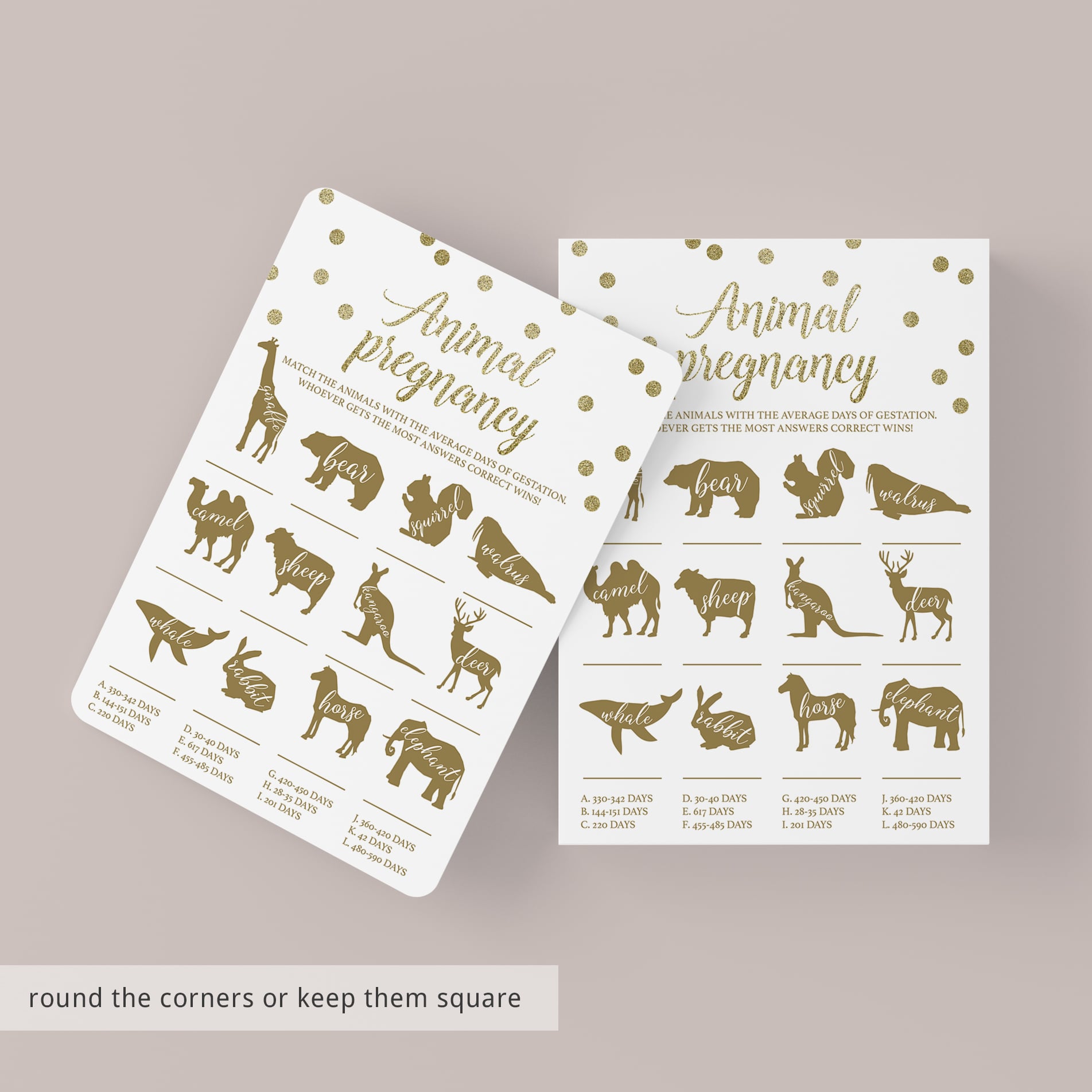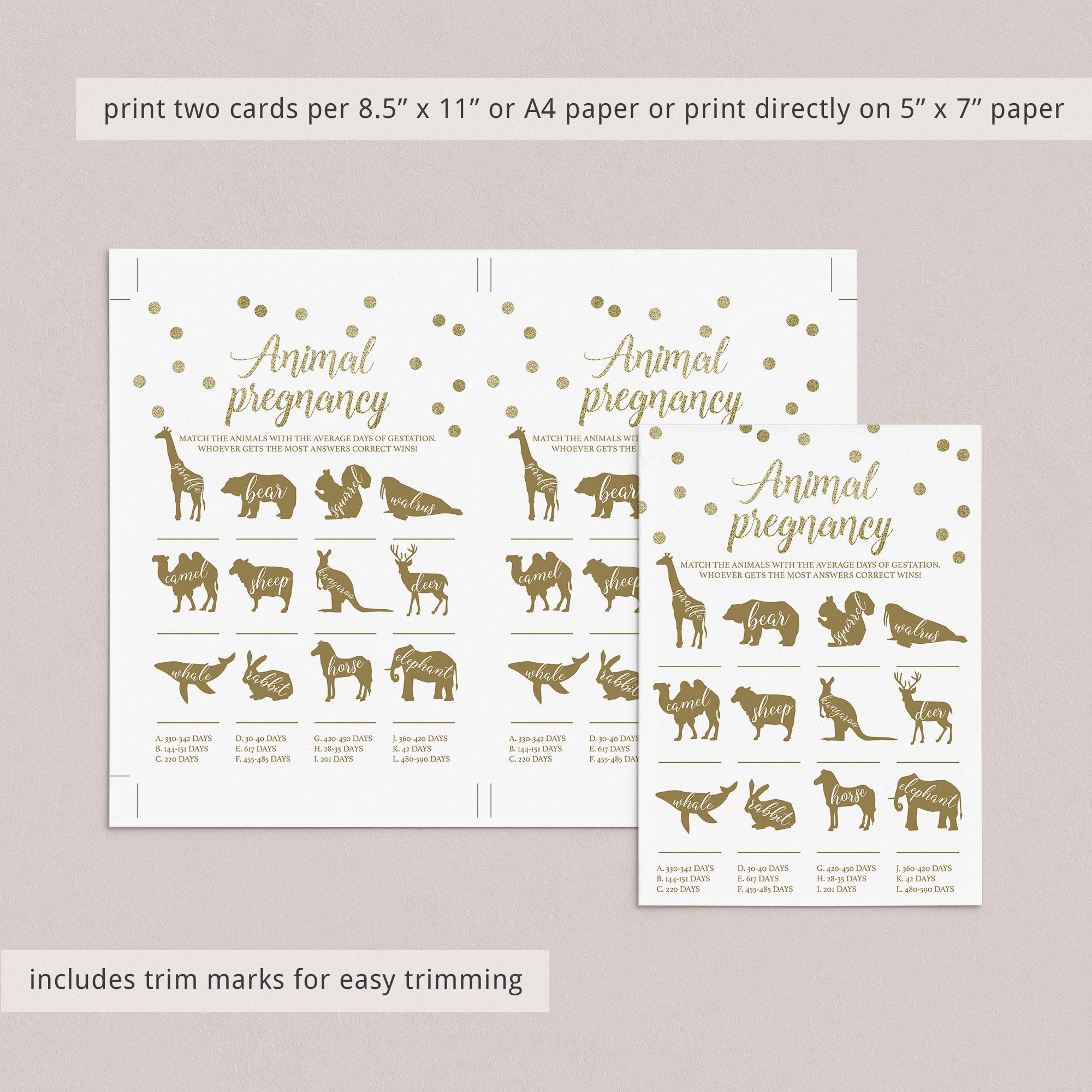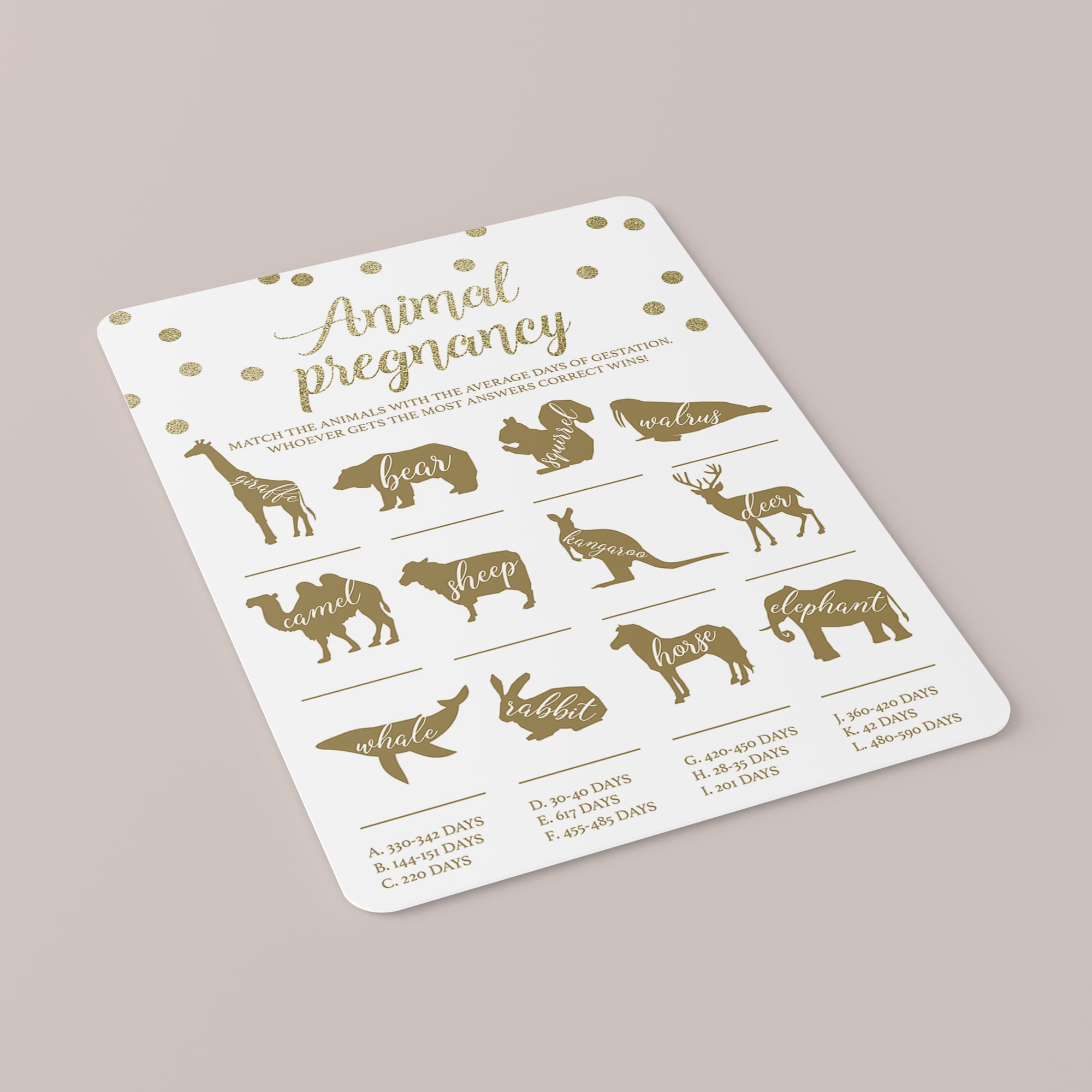 Test your guests' knowledge of animal gestation periods with this How Long is Each Animal Pregnant baby shower game with gold confetti. The printable game with gold animal silhouettes is perfect for any gender neutral baby party.