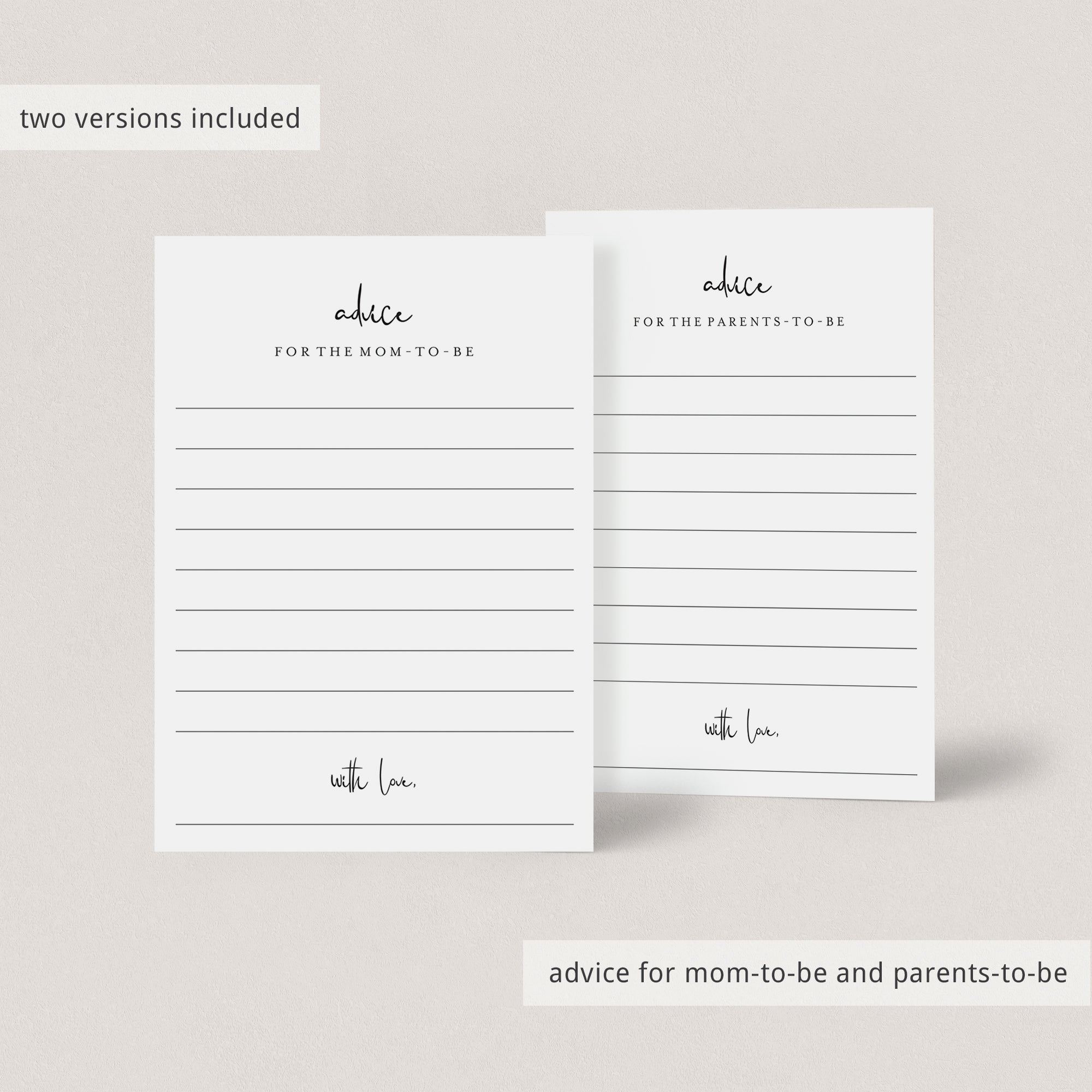• Advice card (two versions included, advice for the mom-to-be and advice for the parents-to-be)