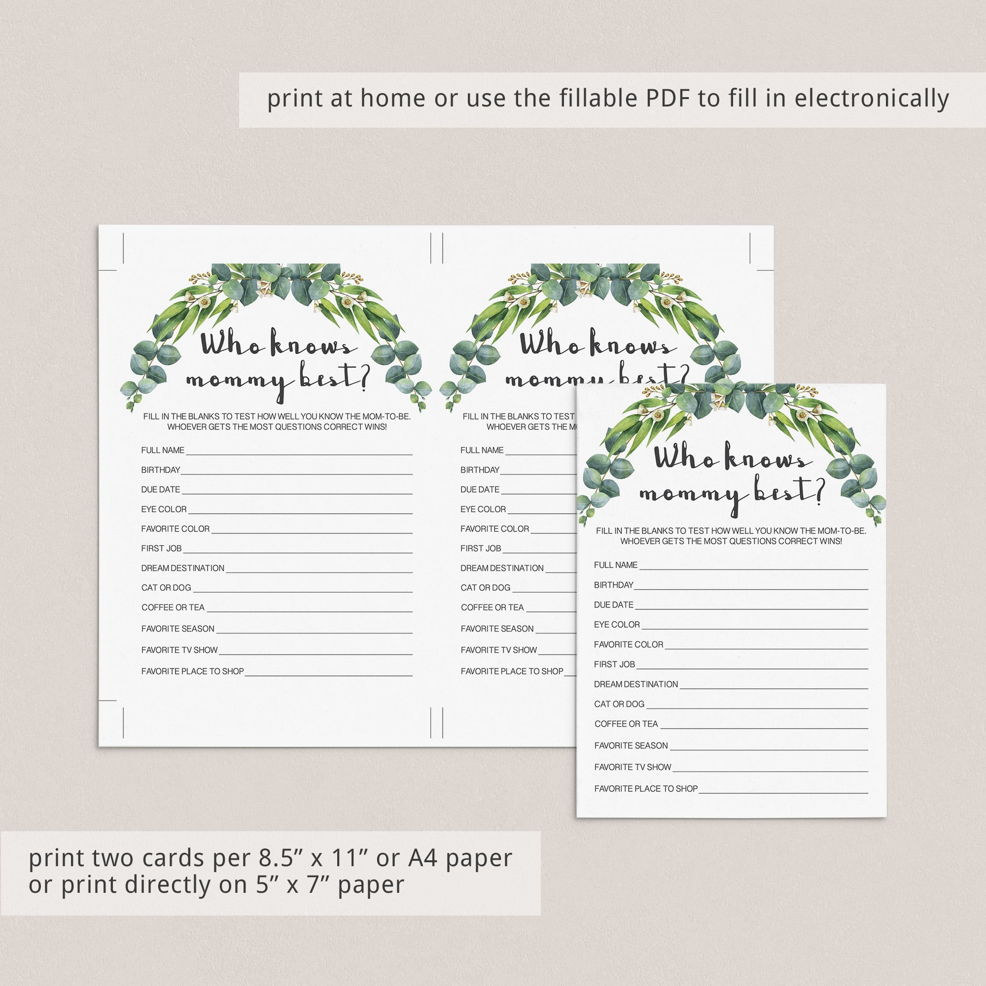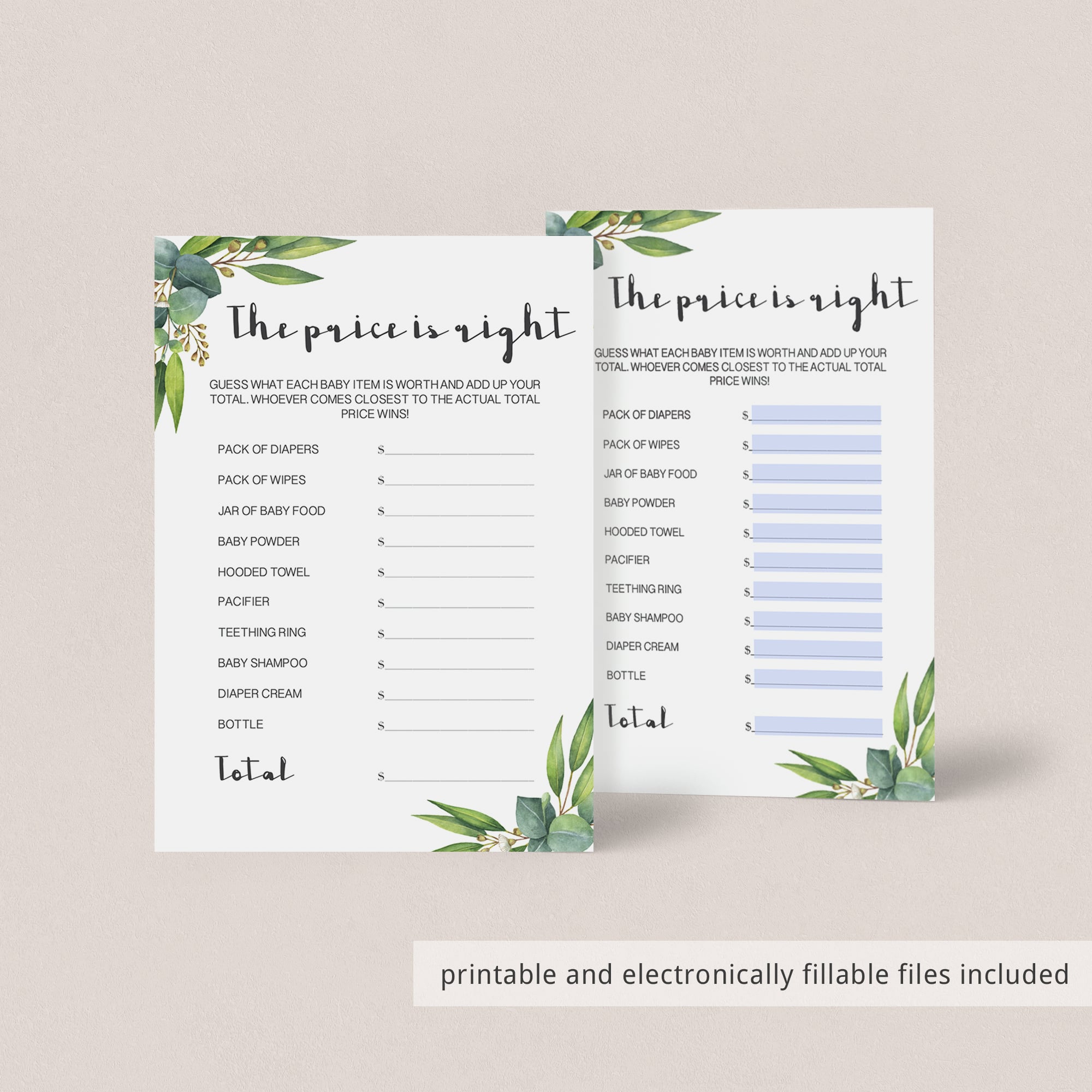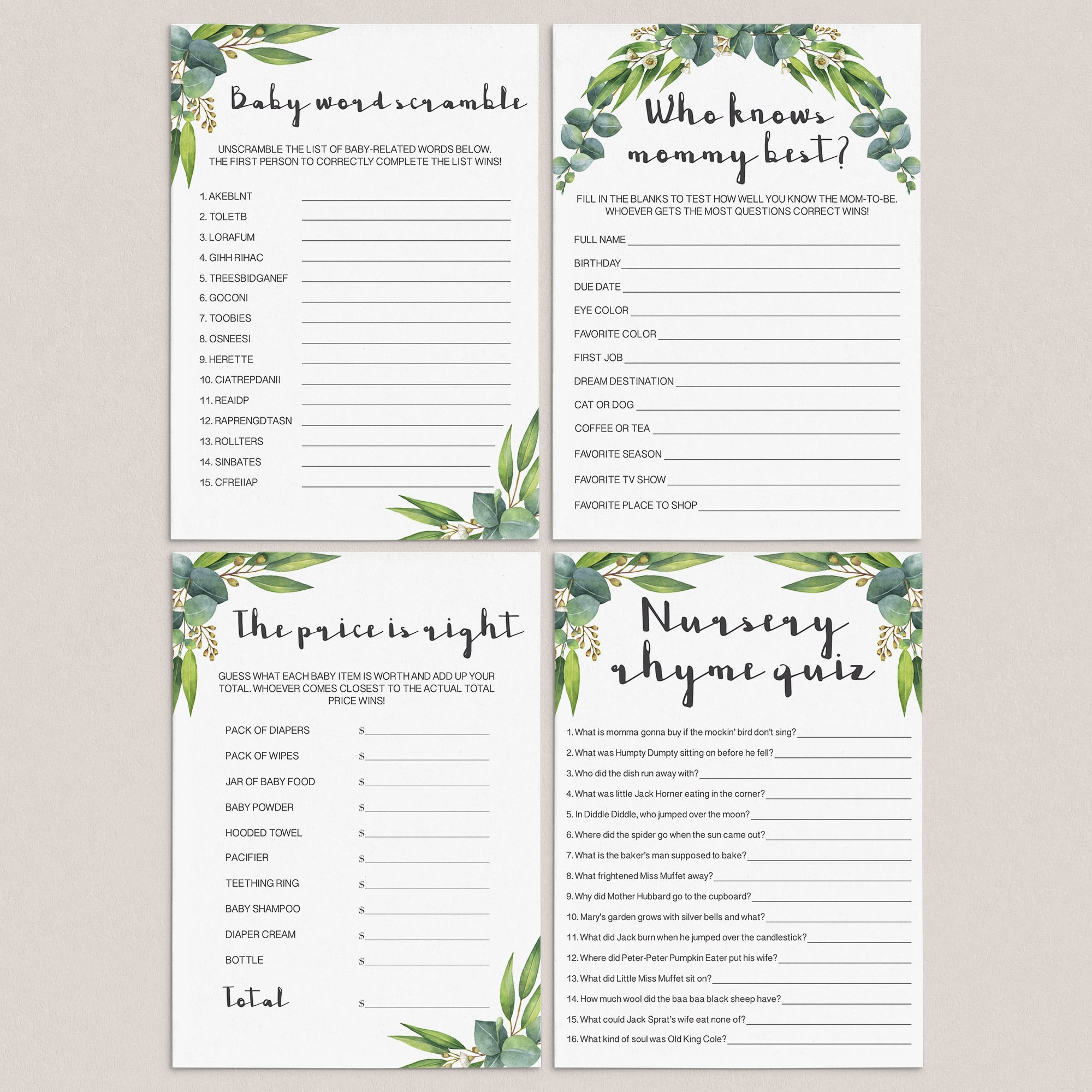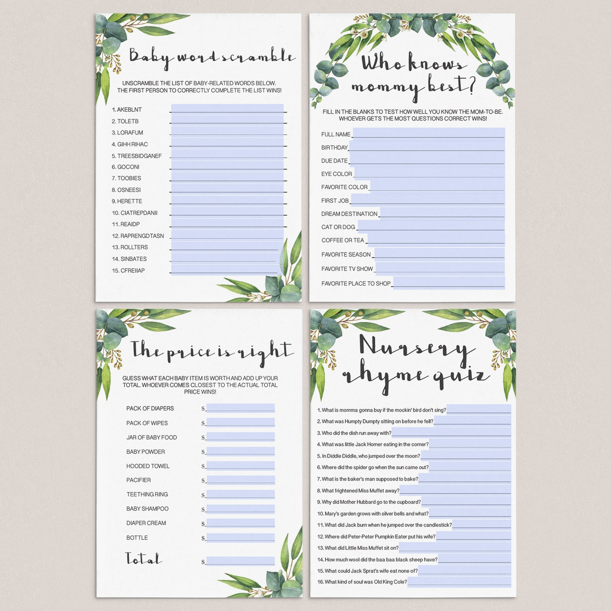 Entertain your (virtual) baby shower guests with this package of modern baby shower games with watercolor eucalyptus leaves. The package is perfect for any gender neutral baby shower. Printable and electronically fillable files are included.
