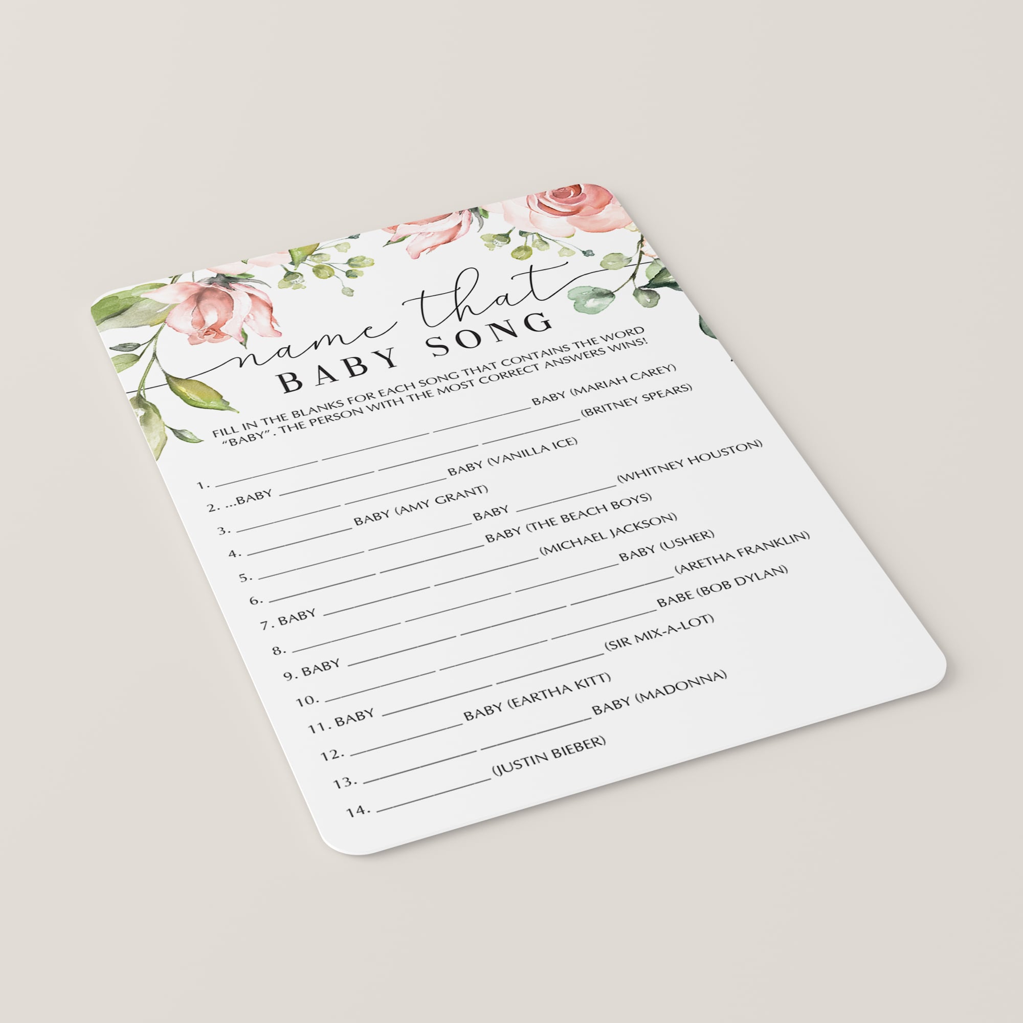 Print and distribute these pretty game sheets with watercolor flowers among your guests along with a pen. Have them fill in the blanks with the song title. They all have the word "Baby" in it.
