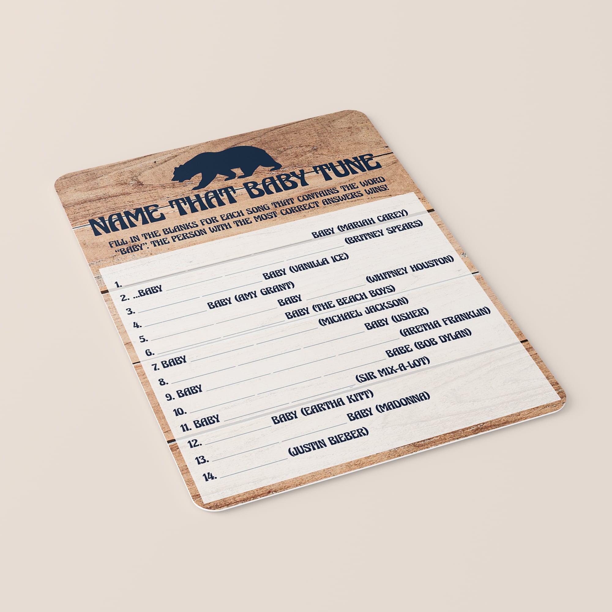 Let your baby shower guests have fun with this rustic “Name That Baby Tune” game with little cub and wood background. It is perfect for a boy baby shower.