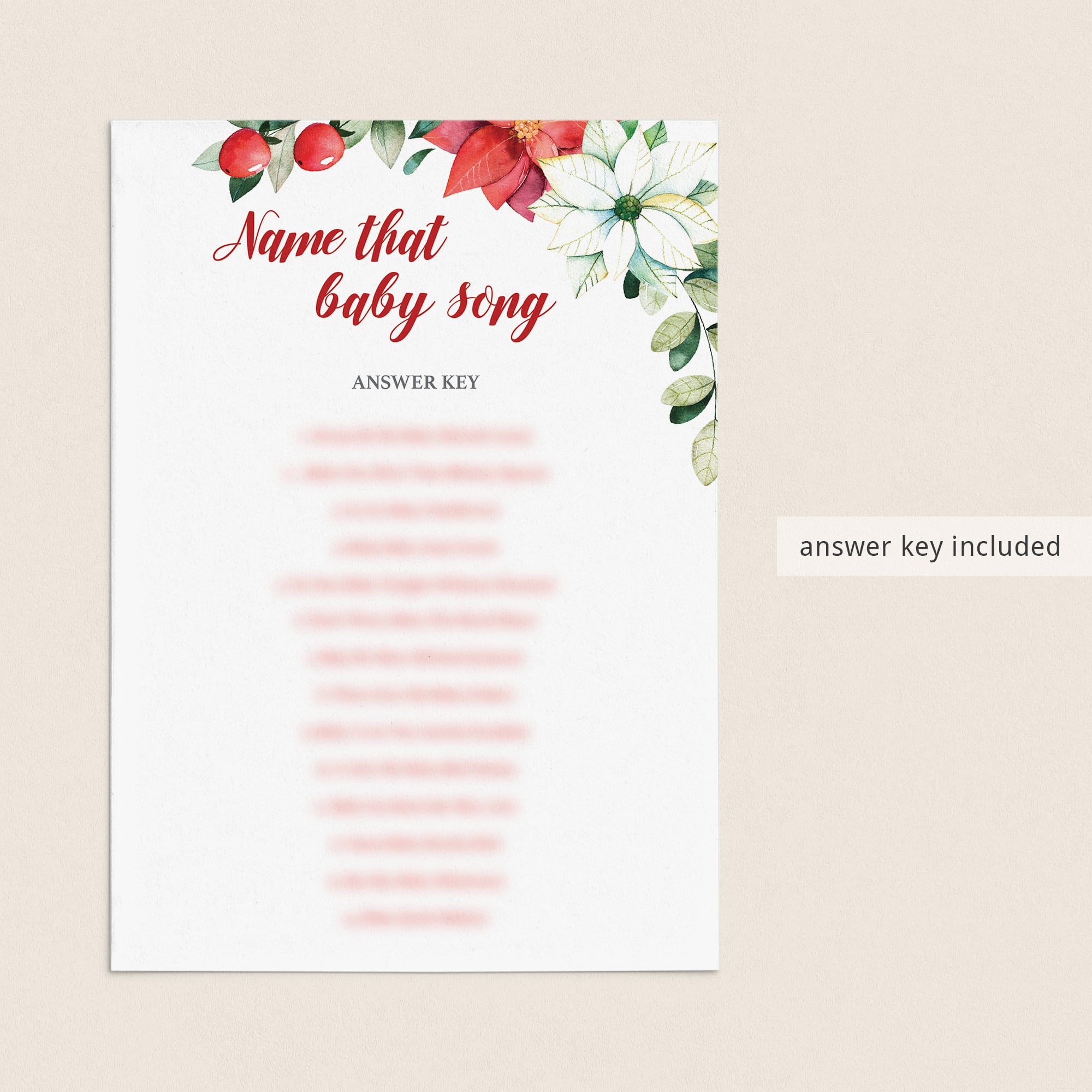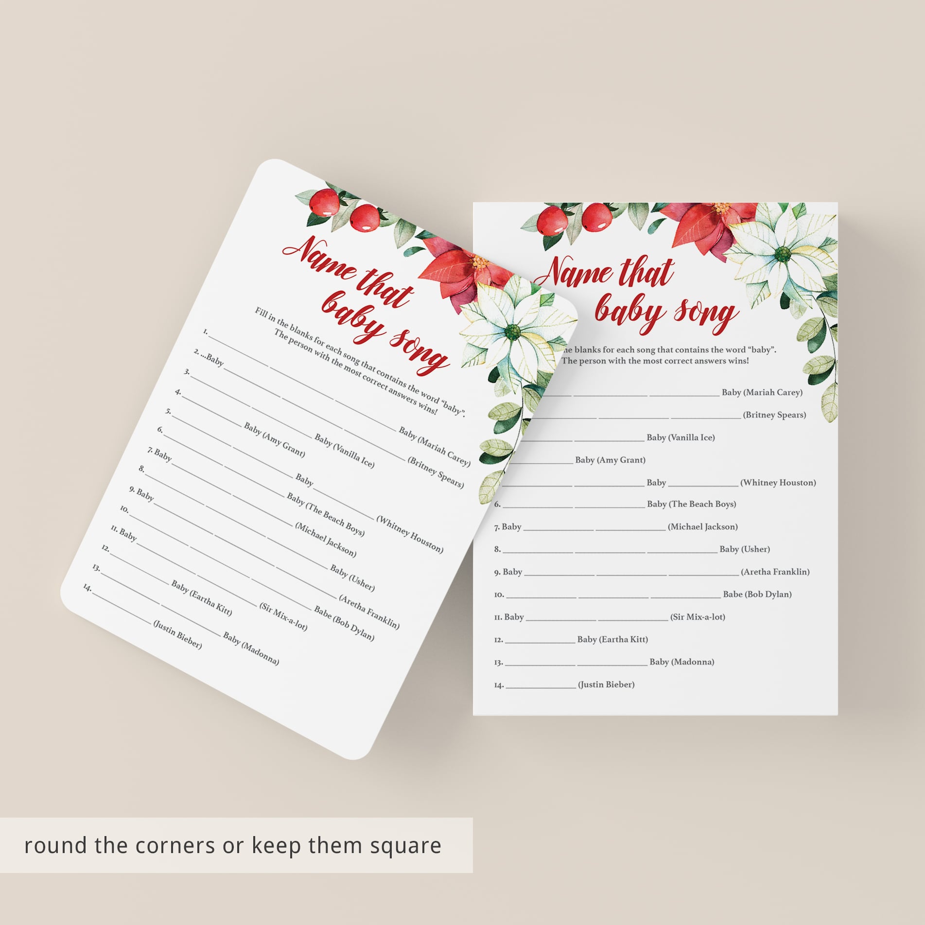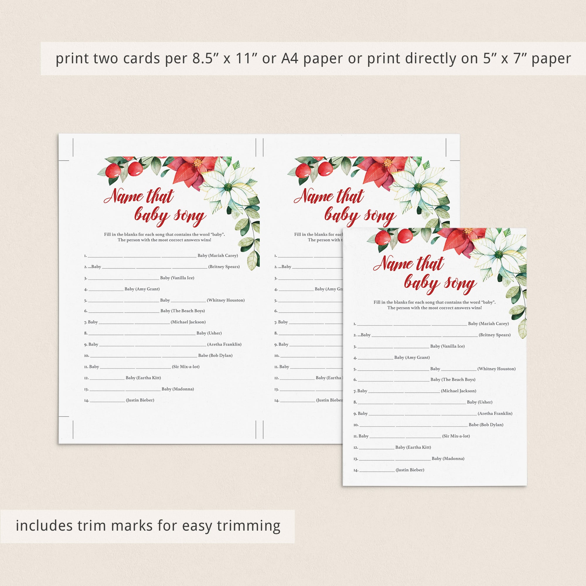 Let your baby party guests have fun with this Christmas baby shower Name That Song game. It is perfect for a winter baby shower. The red and white flowers and green leaves will ensure that you have those special winter vibes at your party.