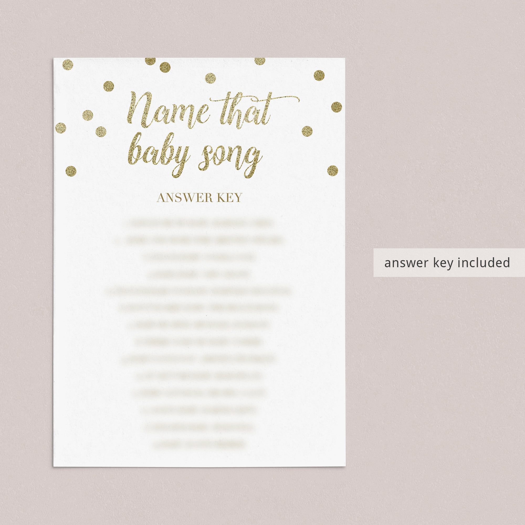 Let your baby shower guests have fun with this Name The Baby Song game with gold confetti. It is perfect for a gender neutral or twinkle twinkle themed baby shower.