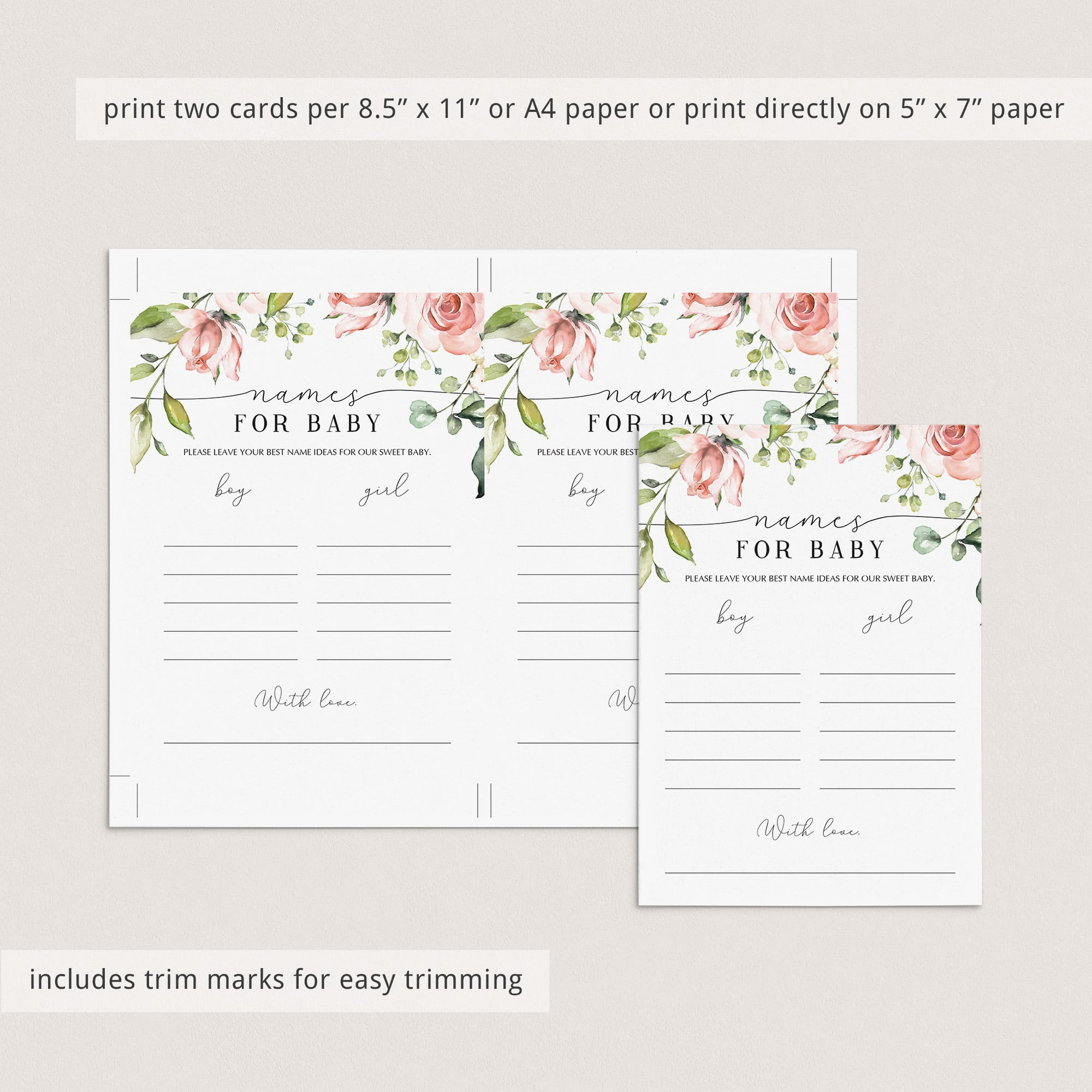 The blush floral Names for Baby card is an instant download, so simply download and print the card as many times as you need. Print right from your computer in a matter of minutes or have the cards printed at your favorite print shop.