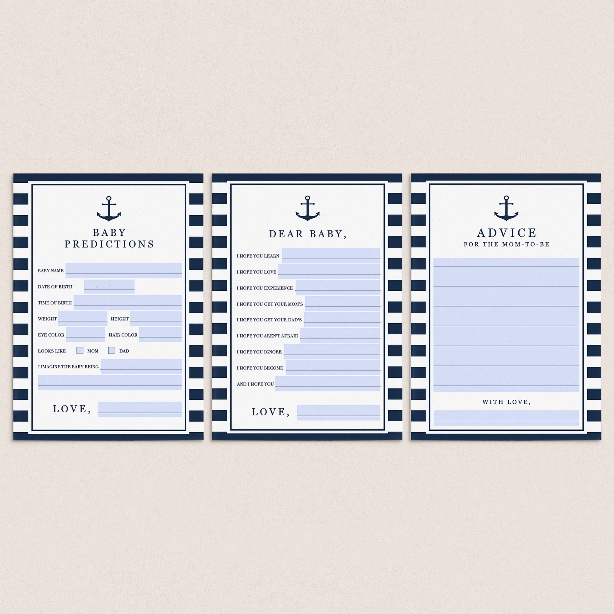 Create magnificent keepsakes for the new mom with this bundle of nautical baby shower games. The bundle includes everything you need to engage your baby shower guests during the party and makes a beautiful keepsake for the mom-to-be afterwards. Printable and electronically fillable PDF templates are included.
