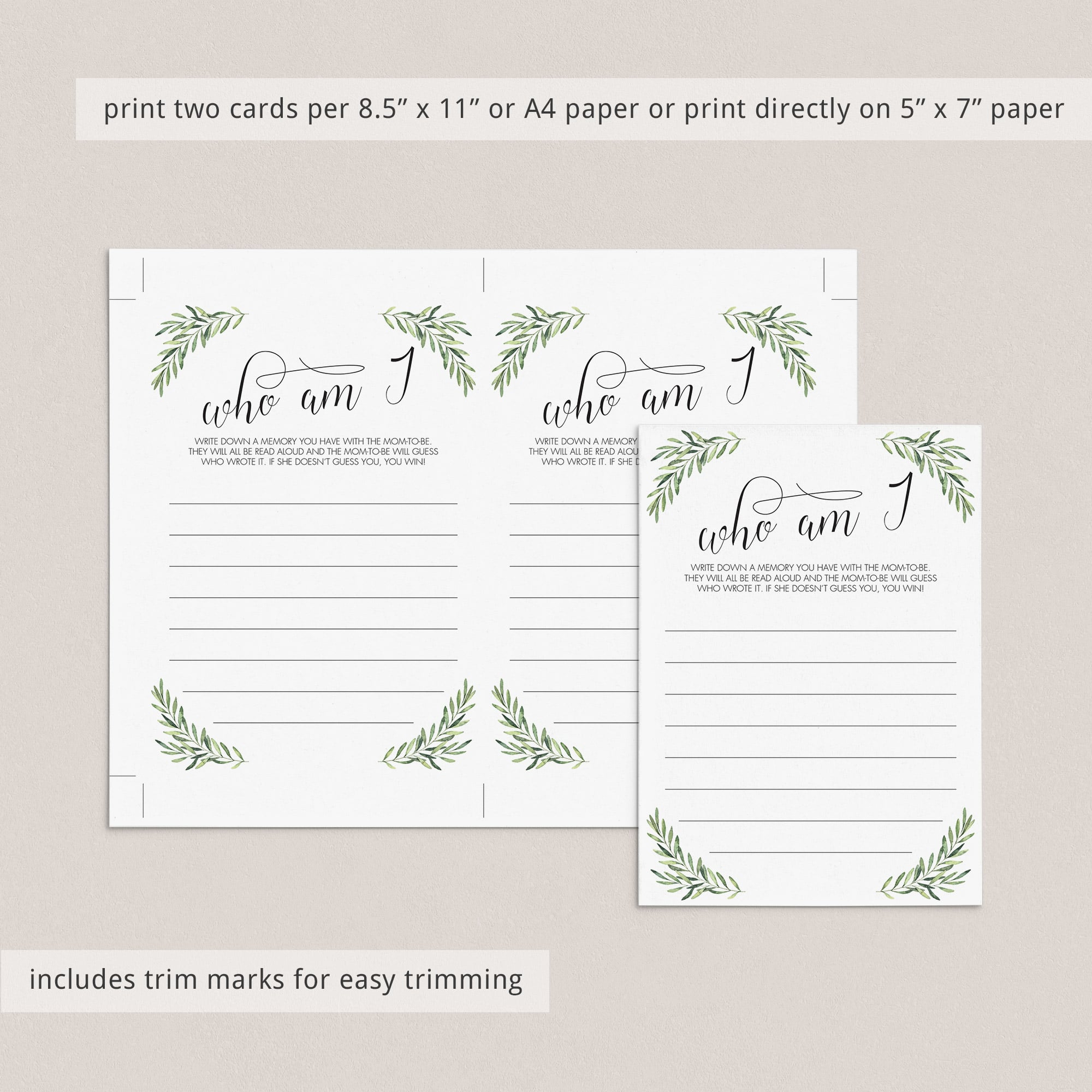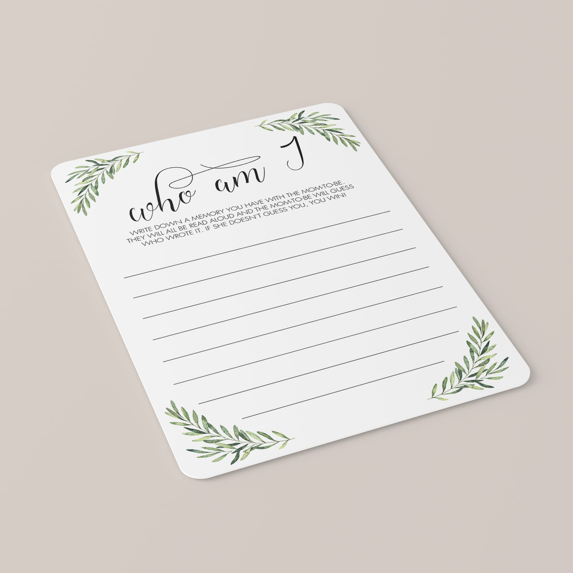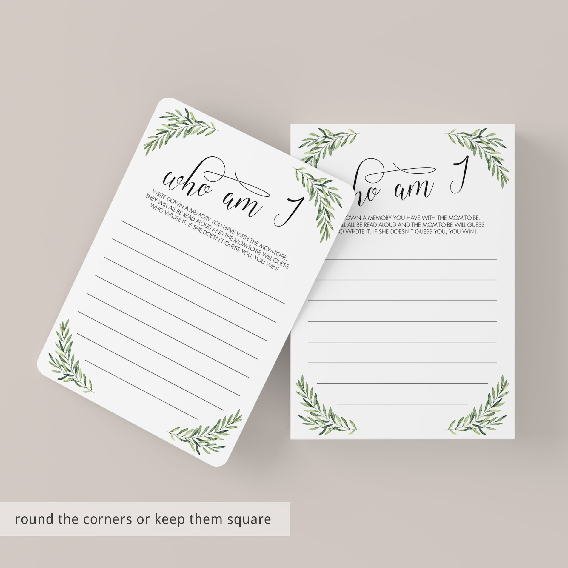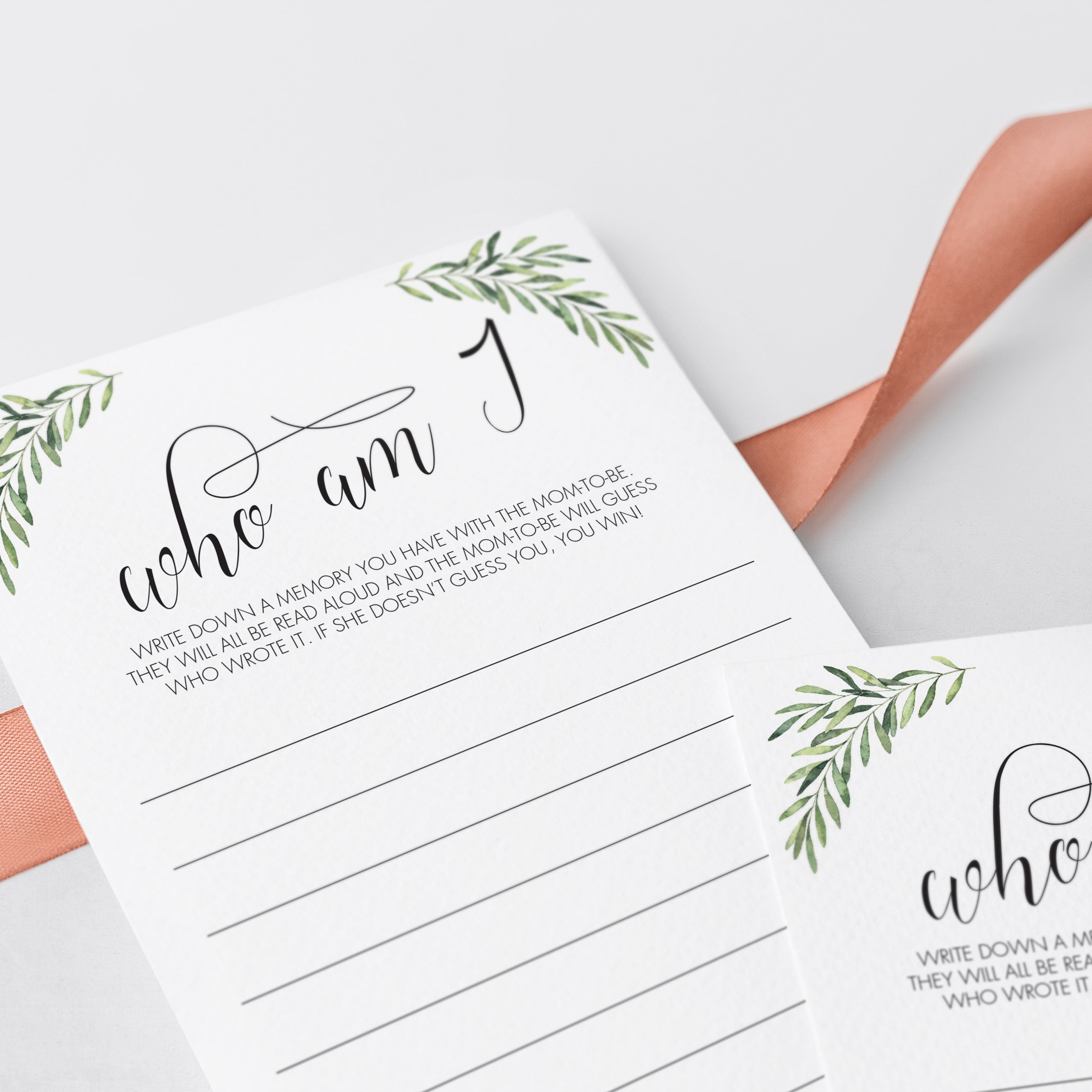 Are you looking for a fun memory game to play at your baby shower? Play Who Am I with these gender neutral game cards with watercolor olive branches. It's the perfect icebreaker for a baby shower with a large group of guests.
