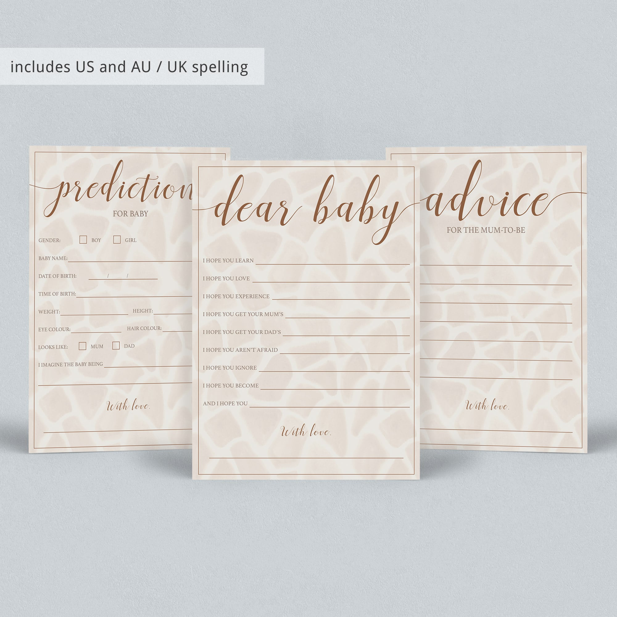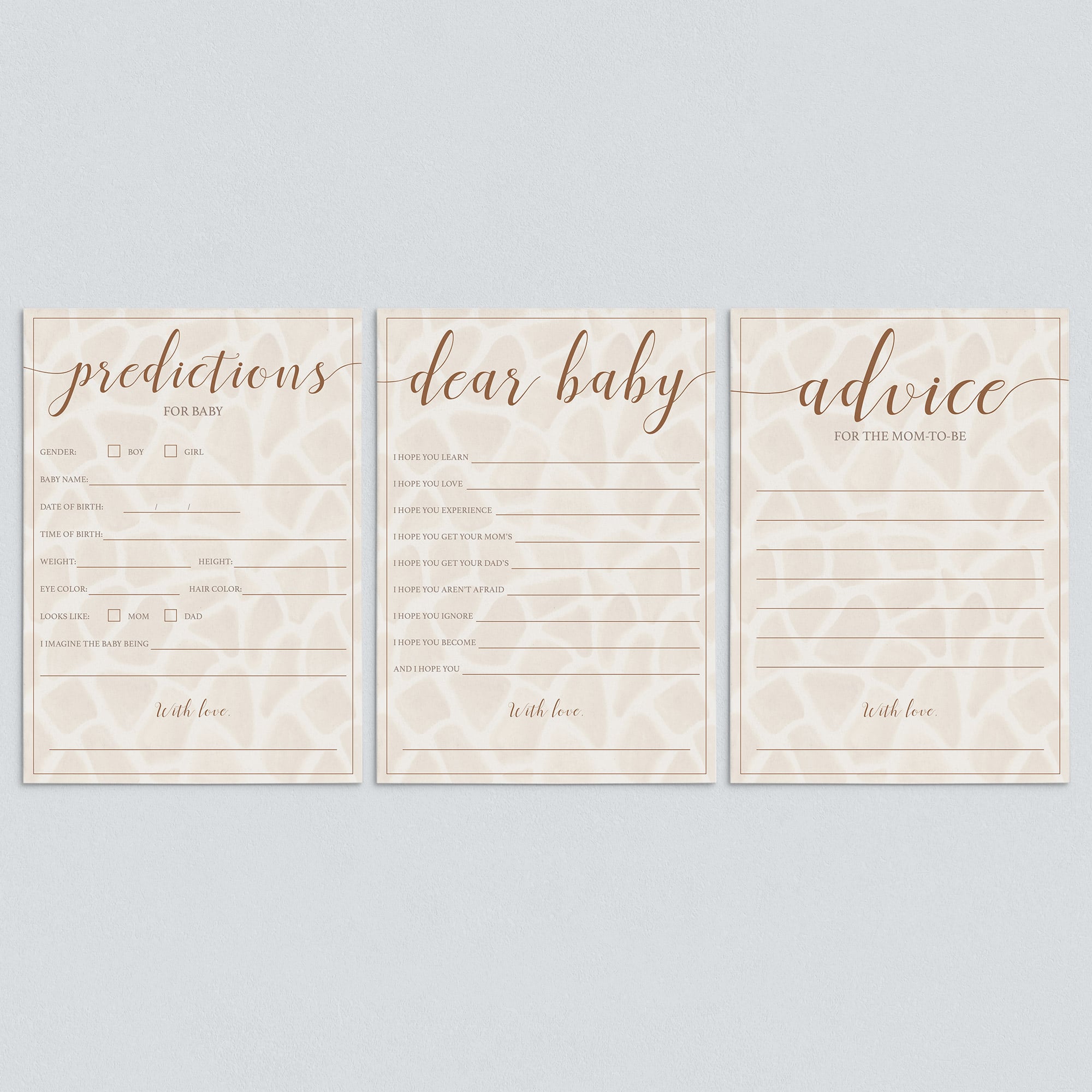 Create beautiful keepsakes for the new mommy with these gender neutral safari baby shower games. The games package with giraffe pattern includes everything you need to engage your baby shower guests during the party and it makes a meaningful keepsake for the mommy afterwards. The games are perfect for a neutral or safari themed baby shower.