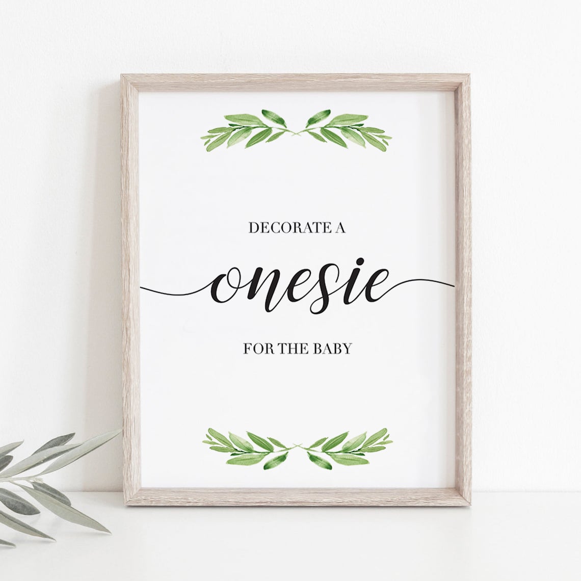 Draw attention to your Onesie station by displaying this greenery Onesie sign with green leaves in a cute frame. It is perfect for any neutral baby shower.