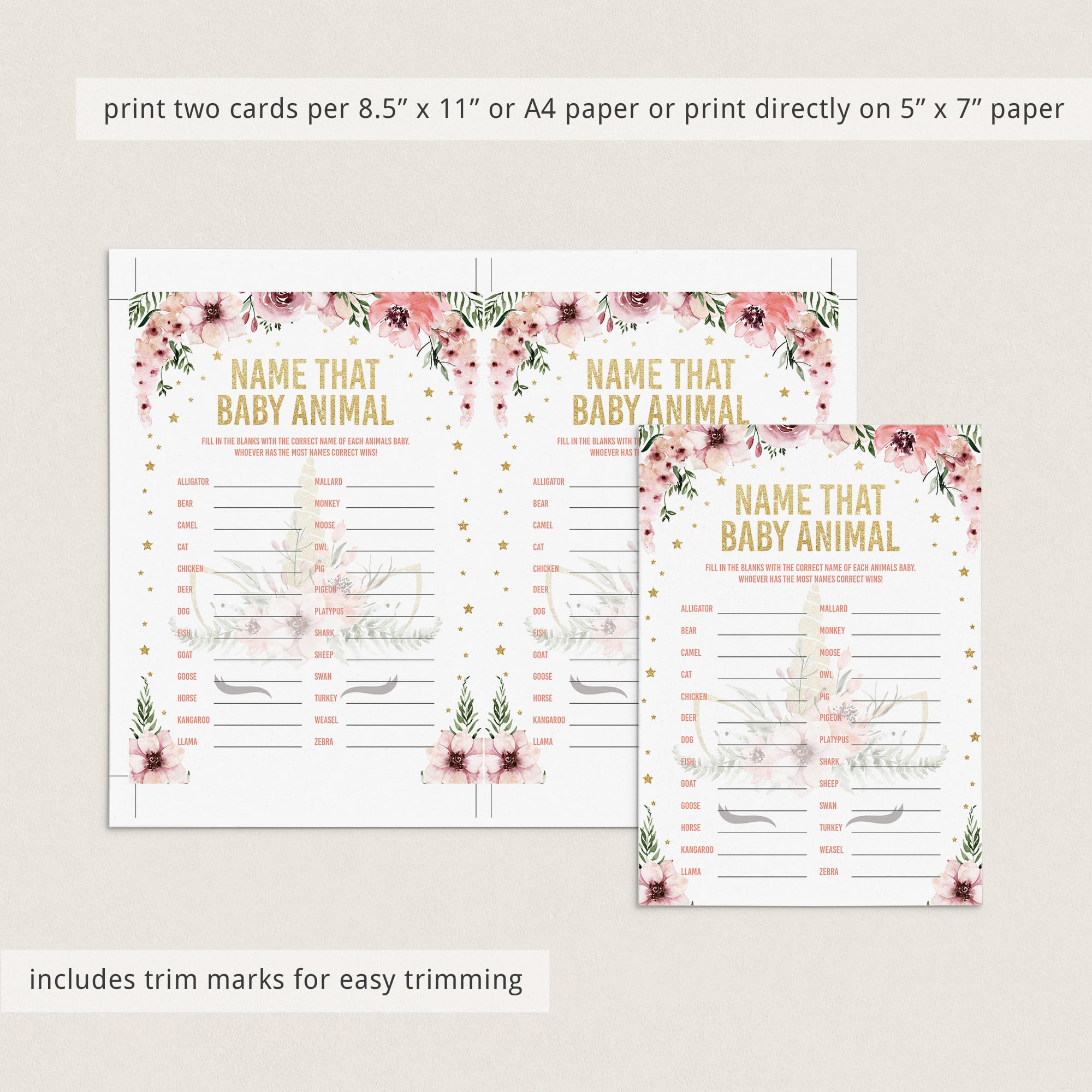 Did you know that a baby shark is a “pup,” and a baby kangaroo is a “joey”? Test your baby shower guests how well they know the names of animals babies with this pink and gold baby shower Name That Baby Animal game card.
