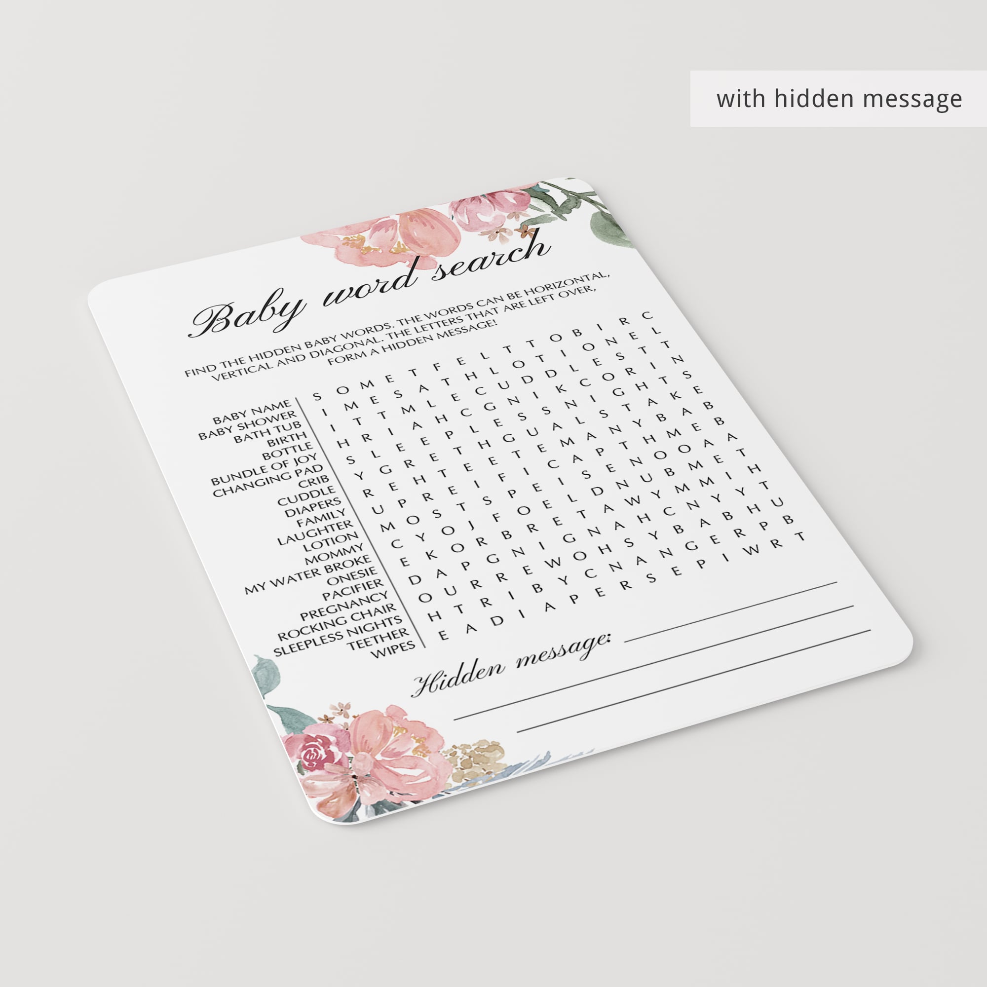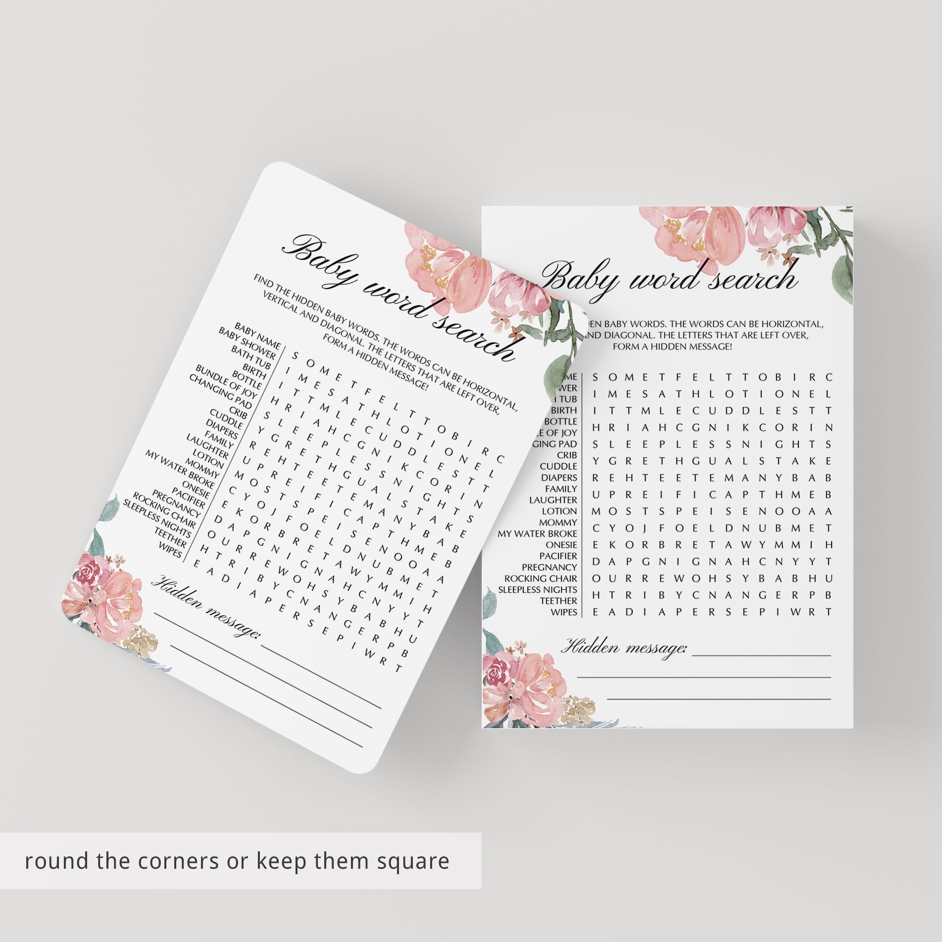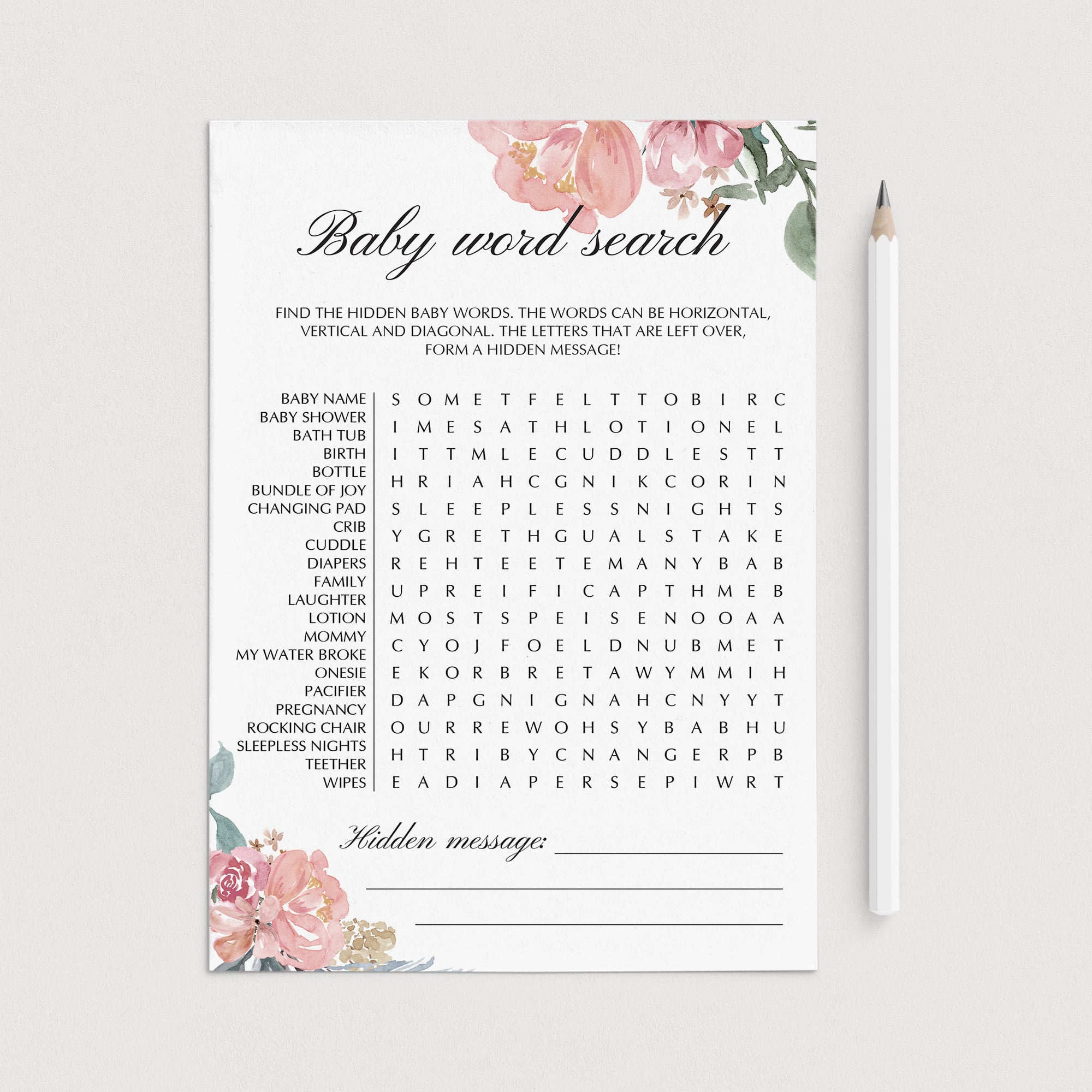 This pink floral Baby Word Search game will sure be a hit at your next party!