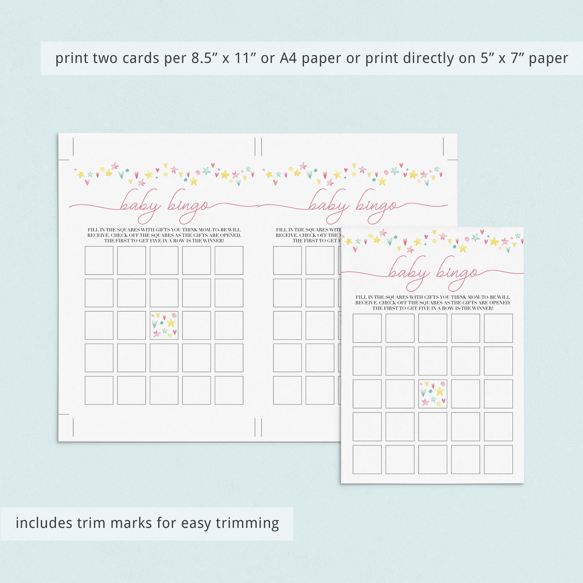The baby shower bingo cards are instant downloadable files that can be printed right from your computer in a matter of minutes. Or you can have them printed by your favorite print shop. We recommend printing on a nice heavy card stock for the highest quality feel. A detailed instruction guide, with tips & tricks on editing, printing, trimming and more is included.