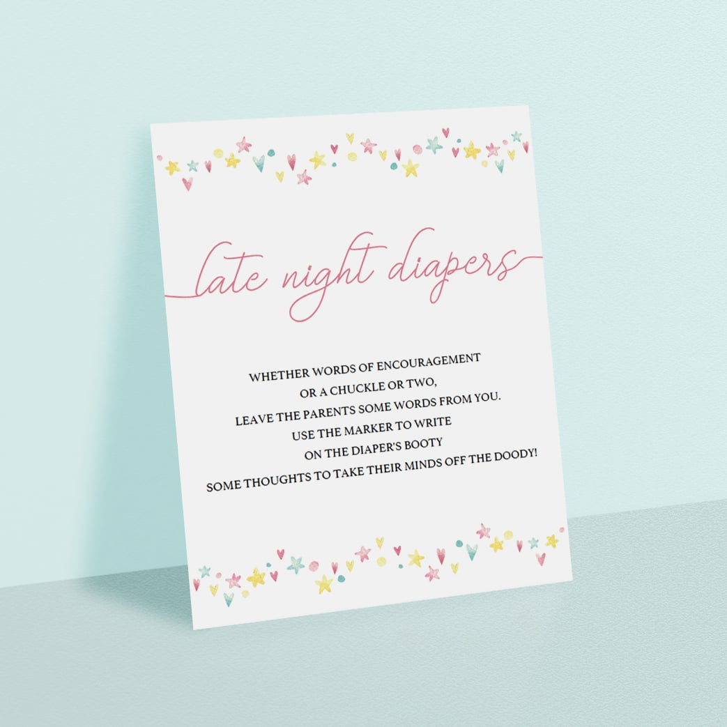 Are you hosting a baby shower to welcome a little girl and looking for a creative and fun shower activity? Set up a Diaper Thoughts station with this adorable pink baby shower Late Night Diapers sign with watercolor hearts and stars. Guaranteed to be a huge hit!