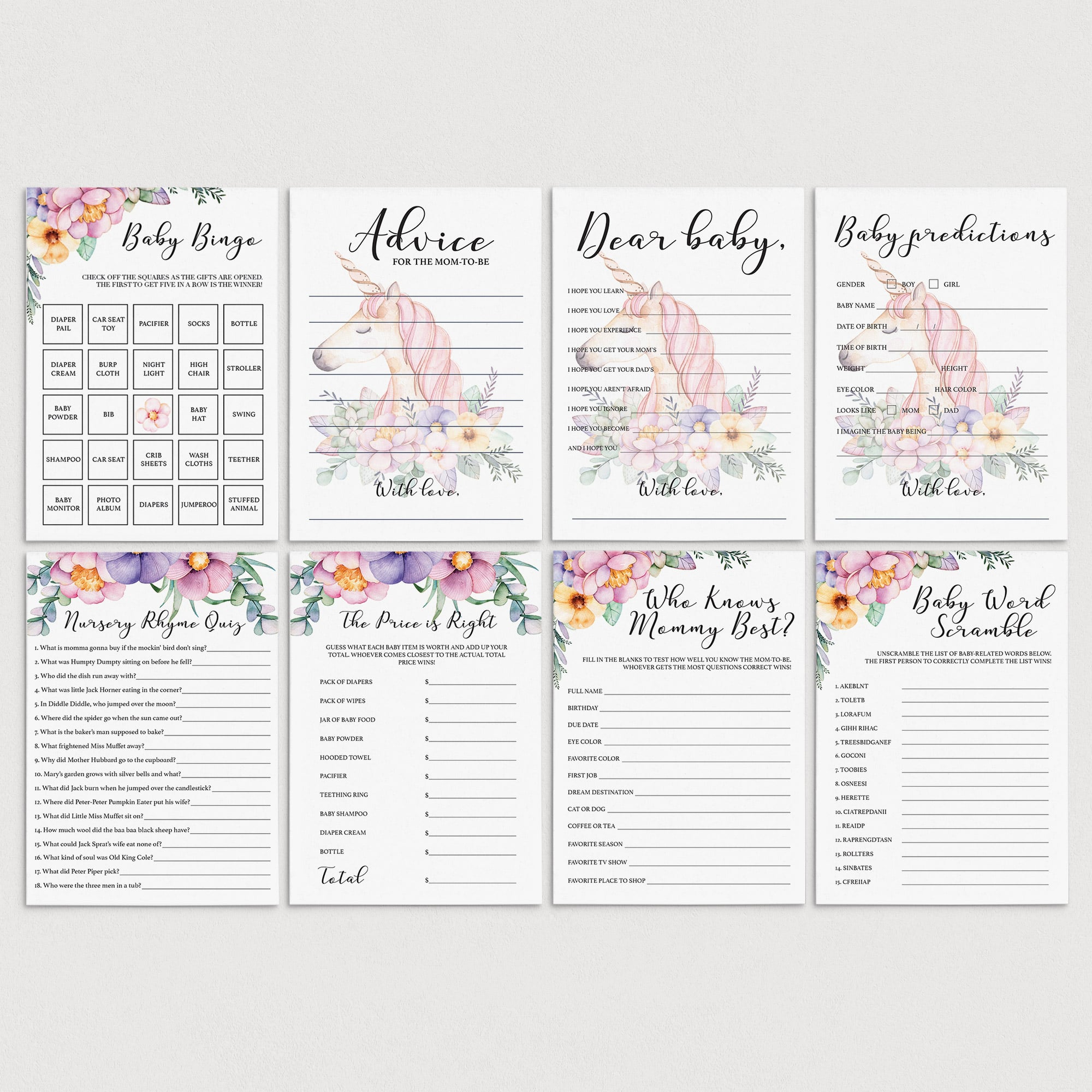 This floral baby shower games pack includes the following 8 popular games and activities: