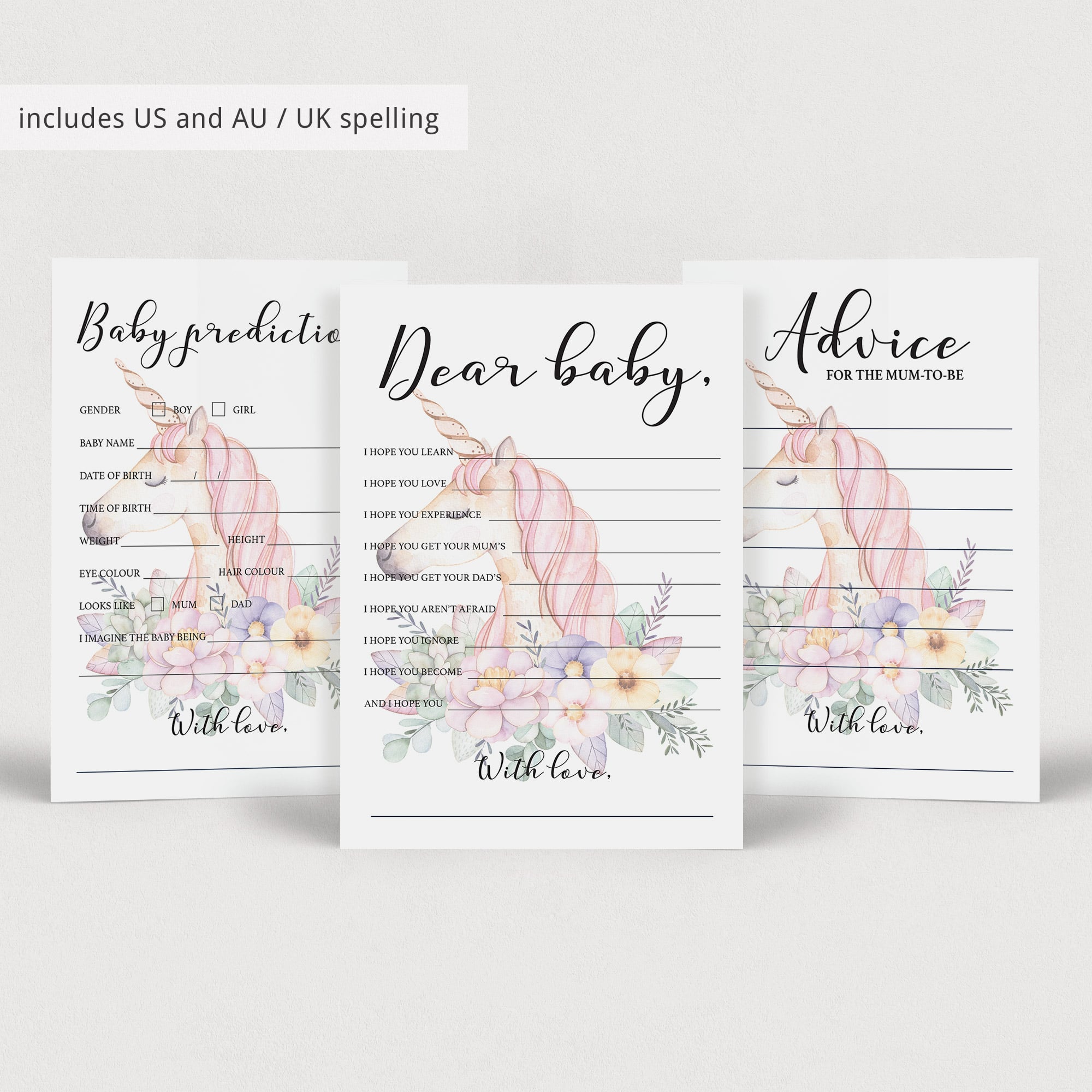 For the Advice card for the mom-to-be and for the parents-to-be, Baby Predictions card with and without baby gender prediction, Baby Wishes card, all in US English and AU / UK English, each: