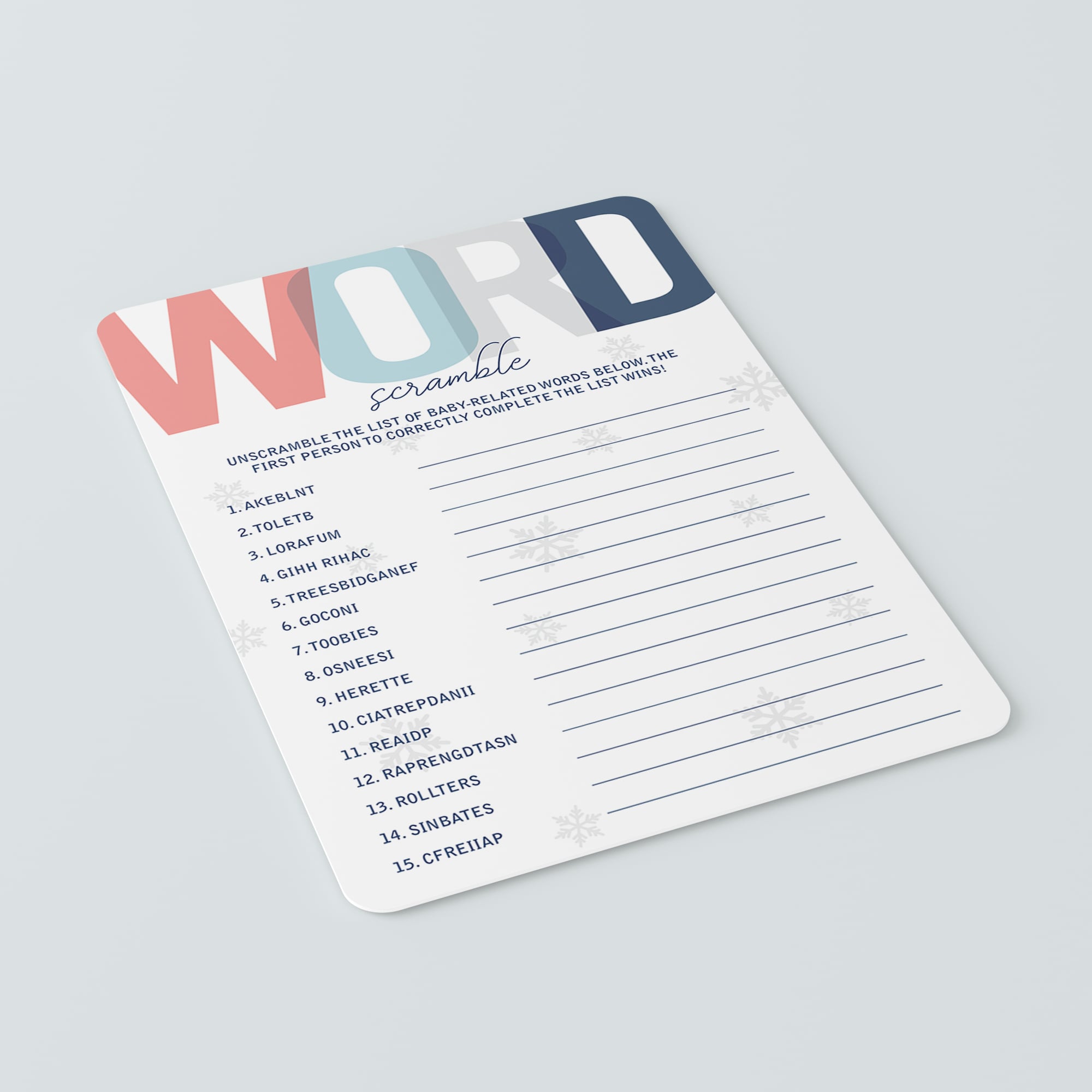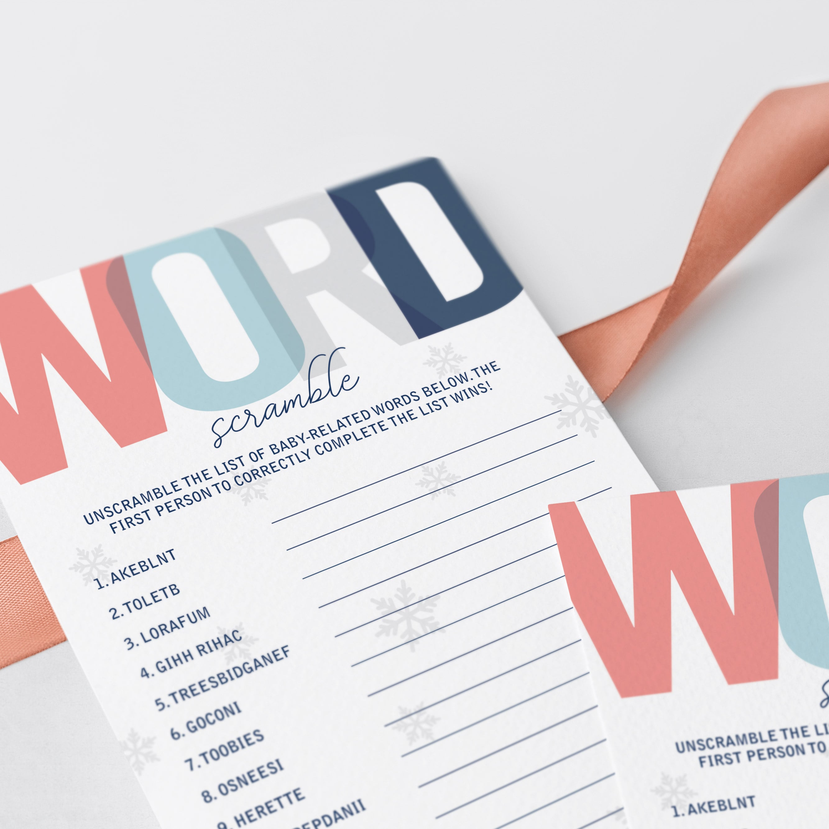Play Word Scramble at your baby shower with this winter themed Baby Word Scramble game. The blue and red game cards with little snowflakes would be perfect for a boy or winter baby shower and will create a fun and enjoyable moment for all of your guests.