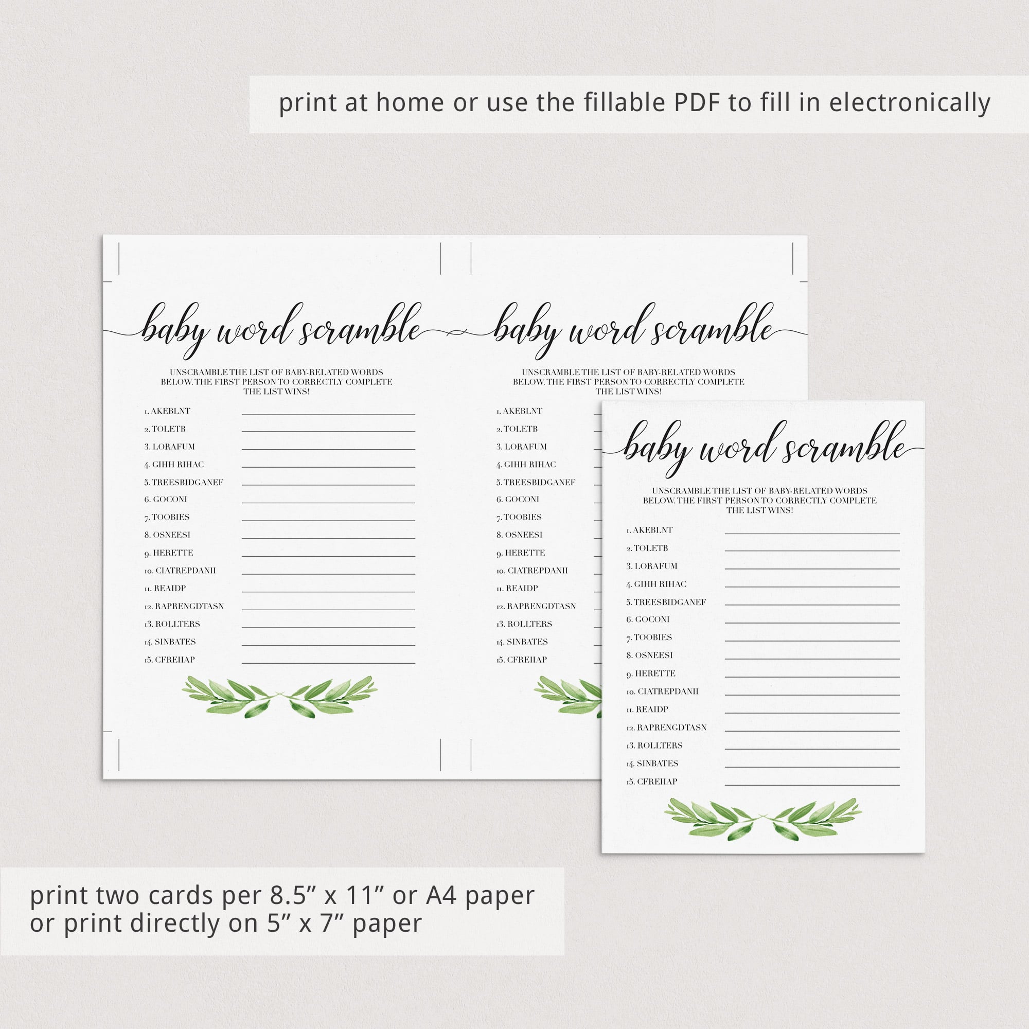 Play (virtual) Baby Word Scramble and WOW everyone with your unique greenery baby shower game cards!