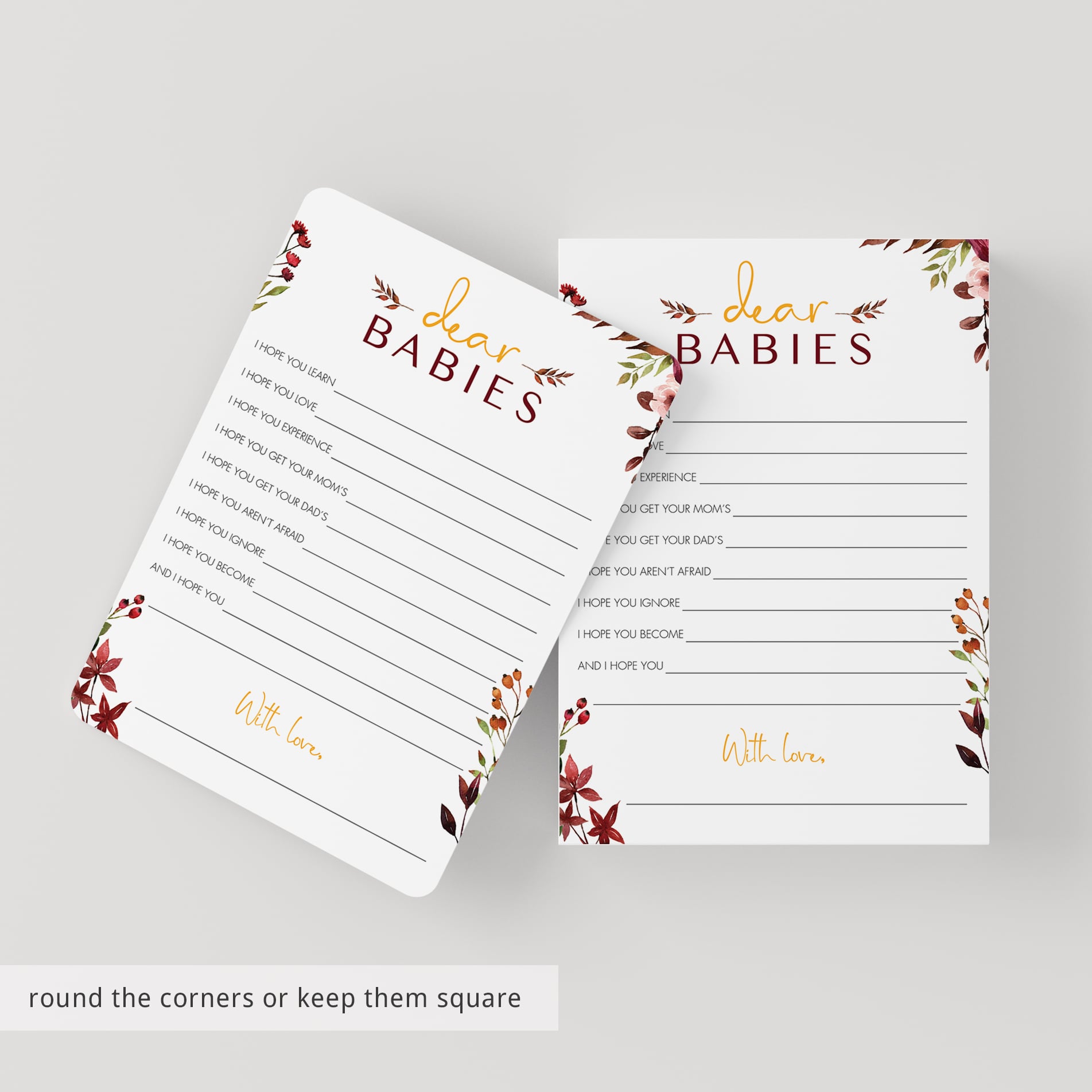 Oh baby baby! Precious twins are on the way! Create a beautiful keepsake with these burgundy flowers Dear Babies wishes cards. Let every baby shower guest write down their wishes for the new babies and collect the burgundy floral cards for the lucky mom-to-be.