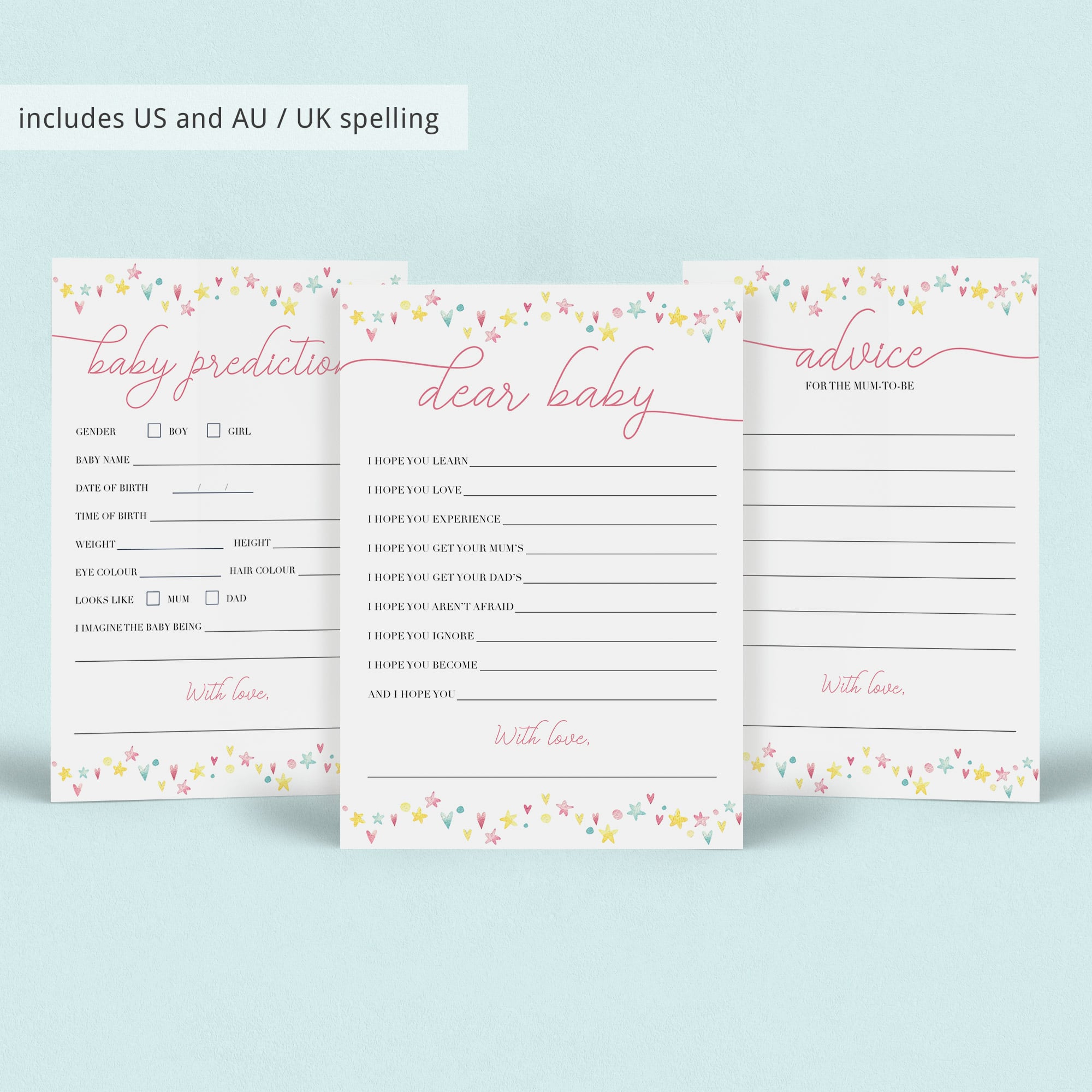 • Baby Predictions card (two versions included, with and without baby gender prediction).
