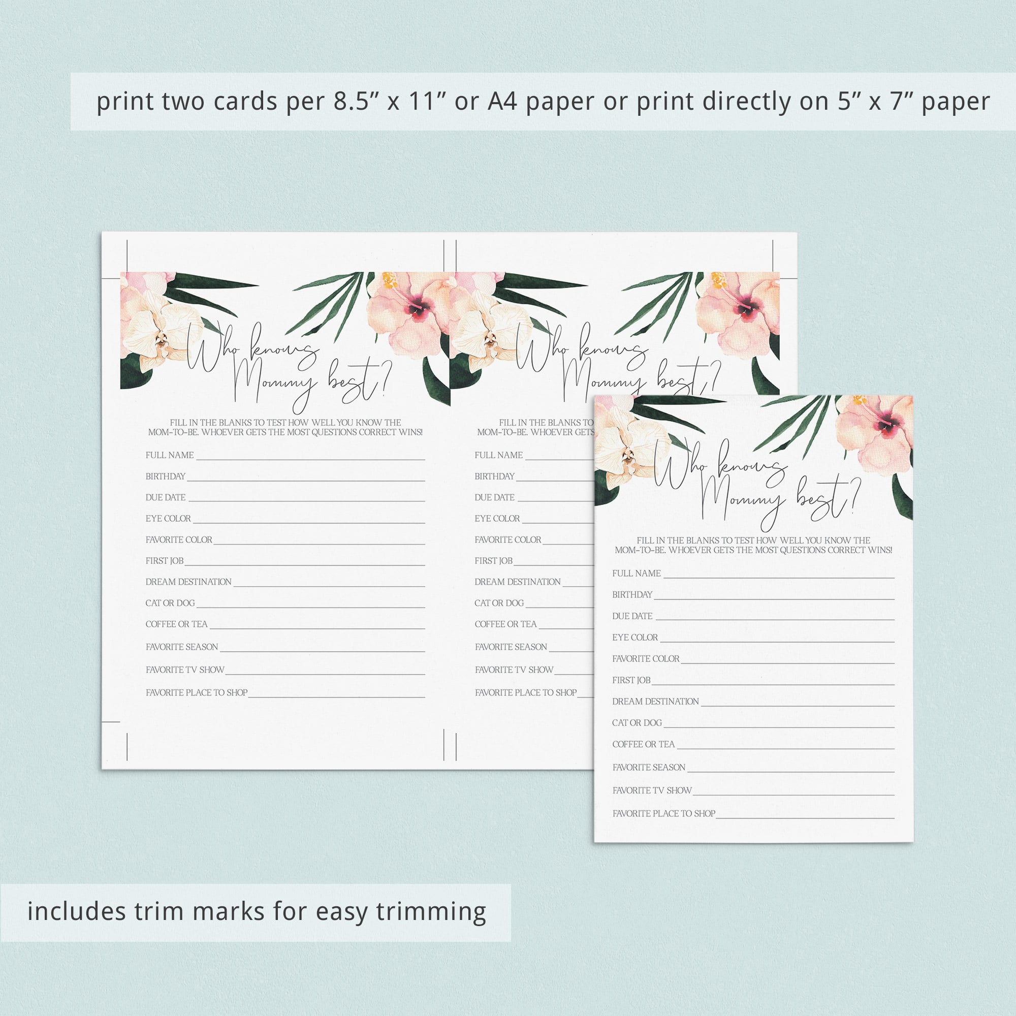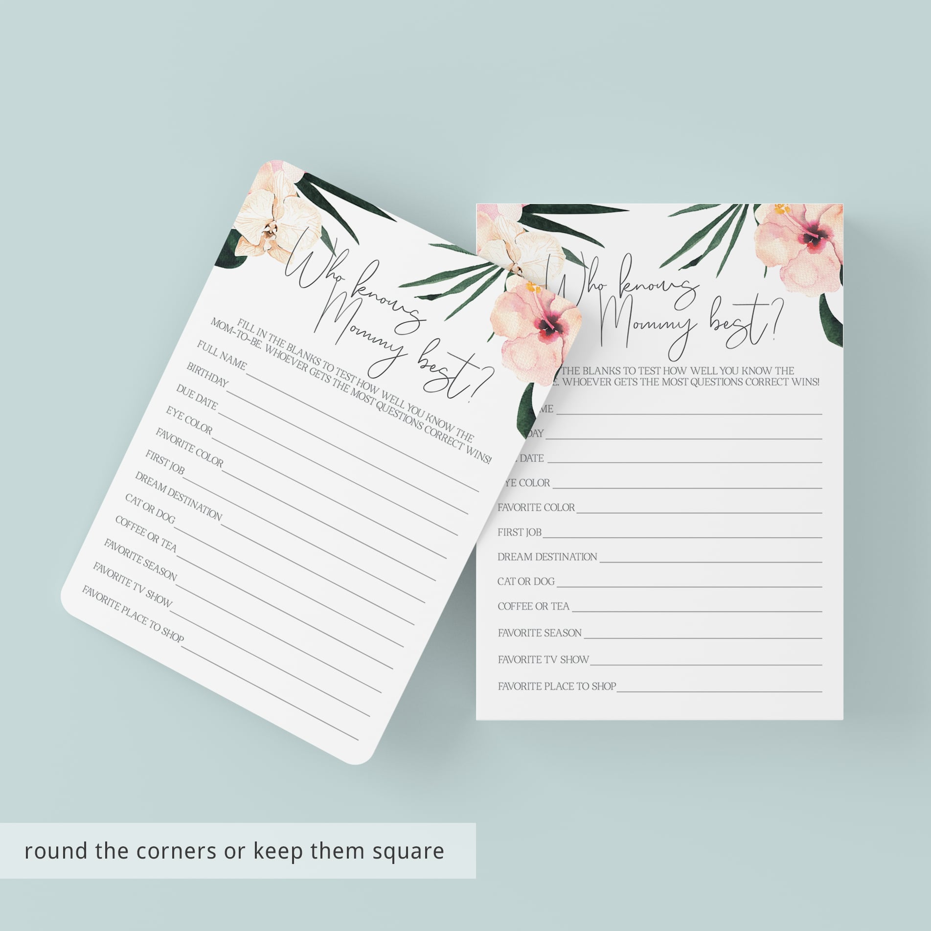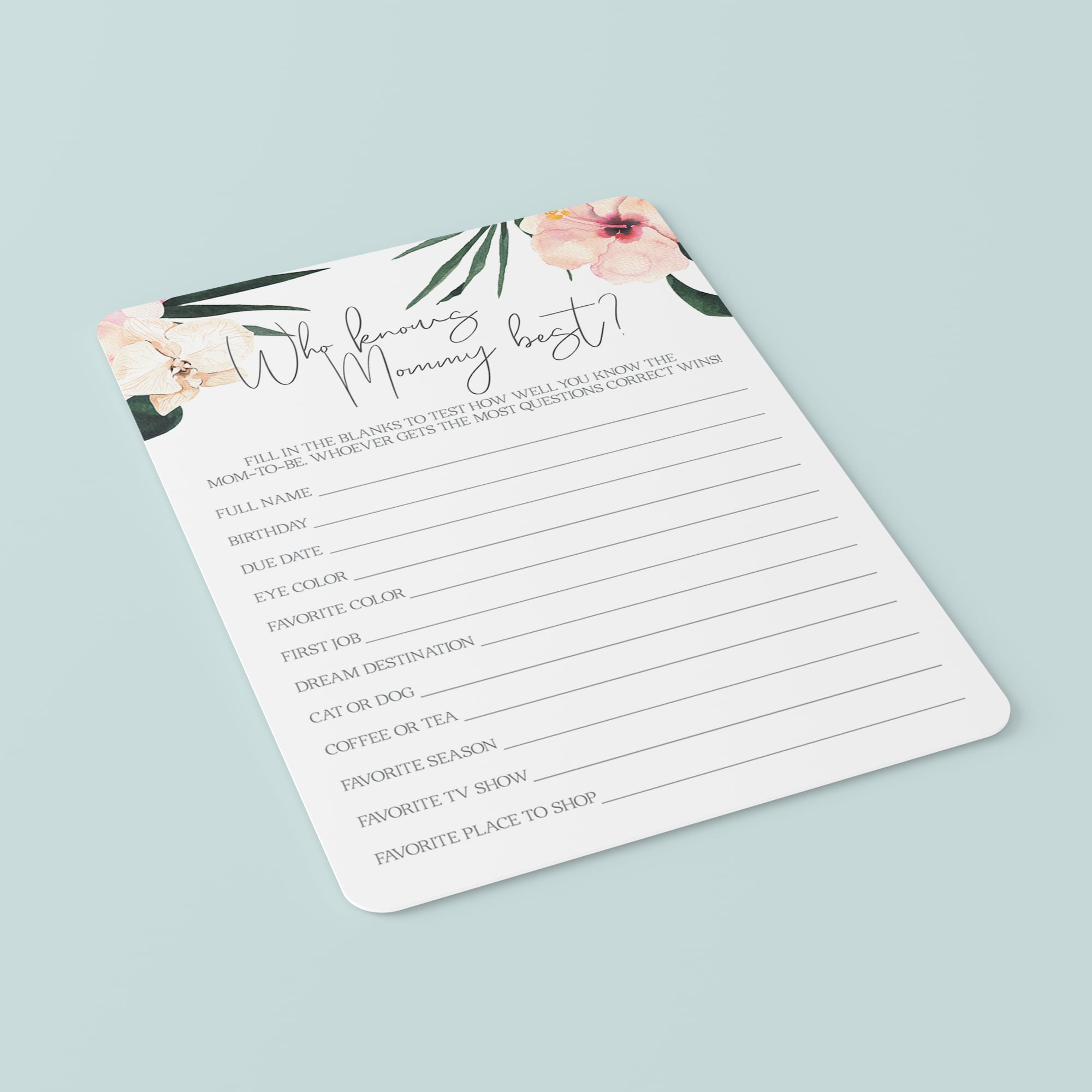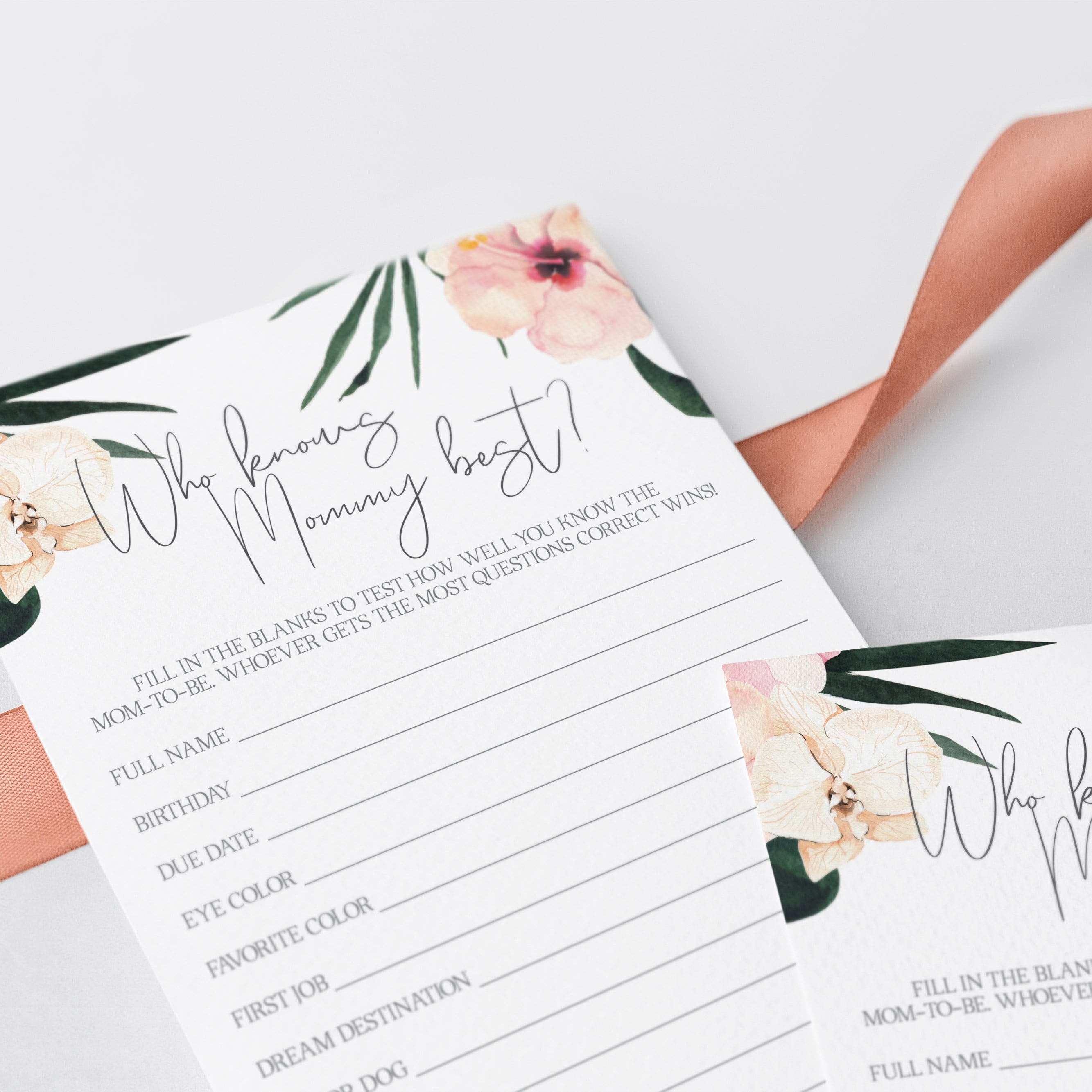 Test your baby shower guests how good they know the mommy to be and play ‘Who Knows Mommy Best’ with these tropical theme baby shower Mommy Quiz cards. This fun game with botanical leaves is perfect for a summer baby shower. A Mommy Quiz is a great way to bring disparate people together and to put them all in a party mood.