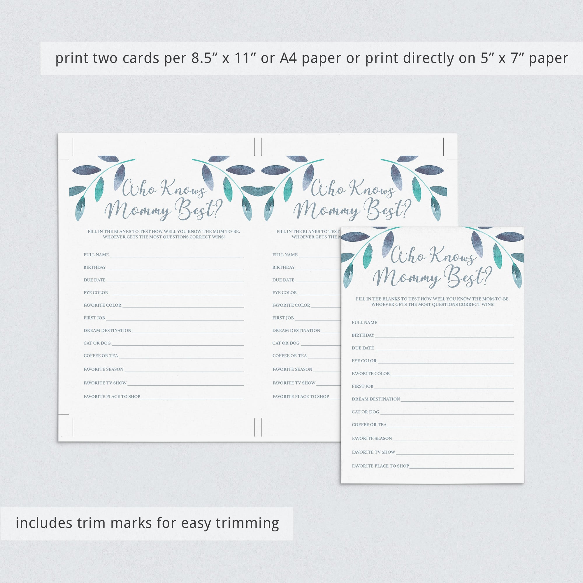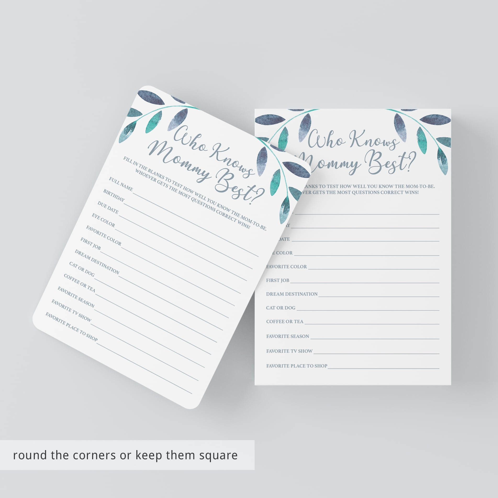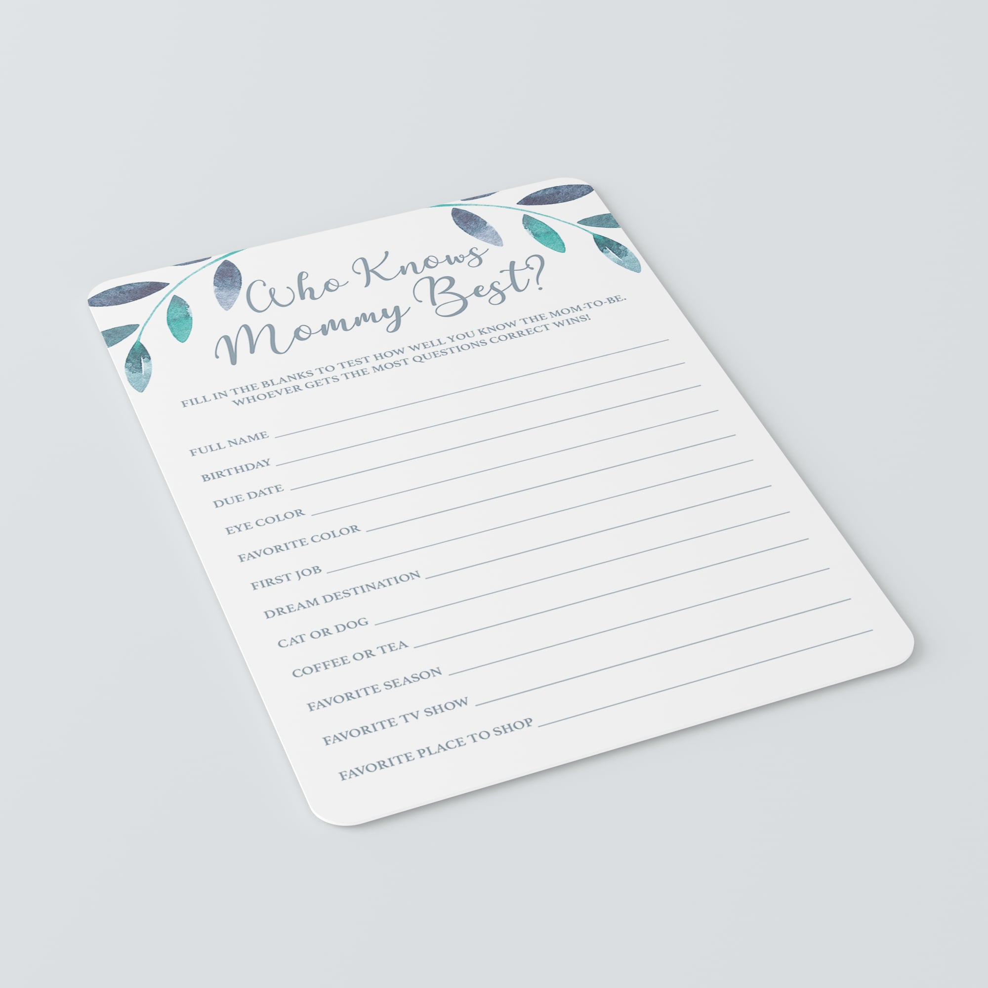 Test your guests how good they know the mommy-to-be and play a ‘Who knows mommy best’ quiz with these gorgeous baby shower game cards with watercolor leaves. This mommy quiz is a great way to bring disparate people together and to put them all in a party mood.