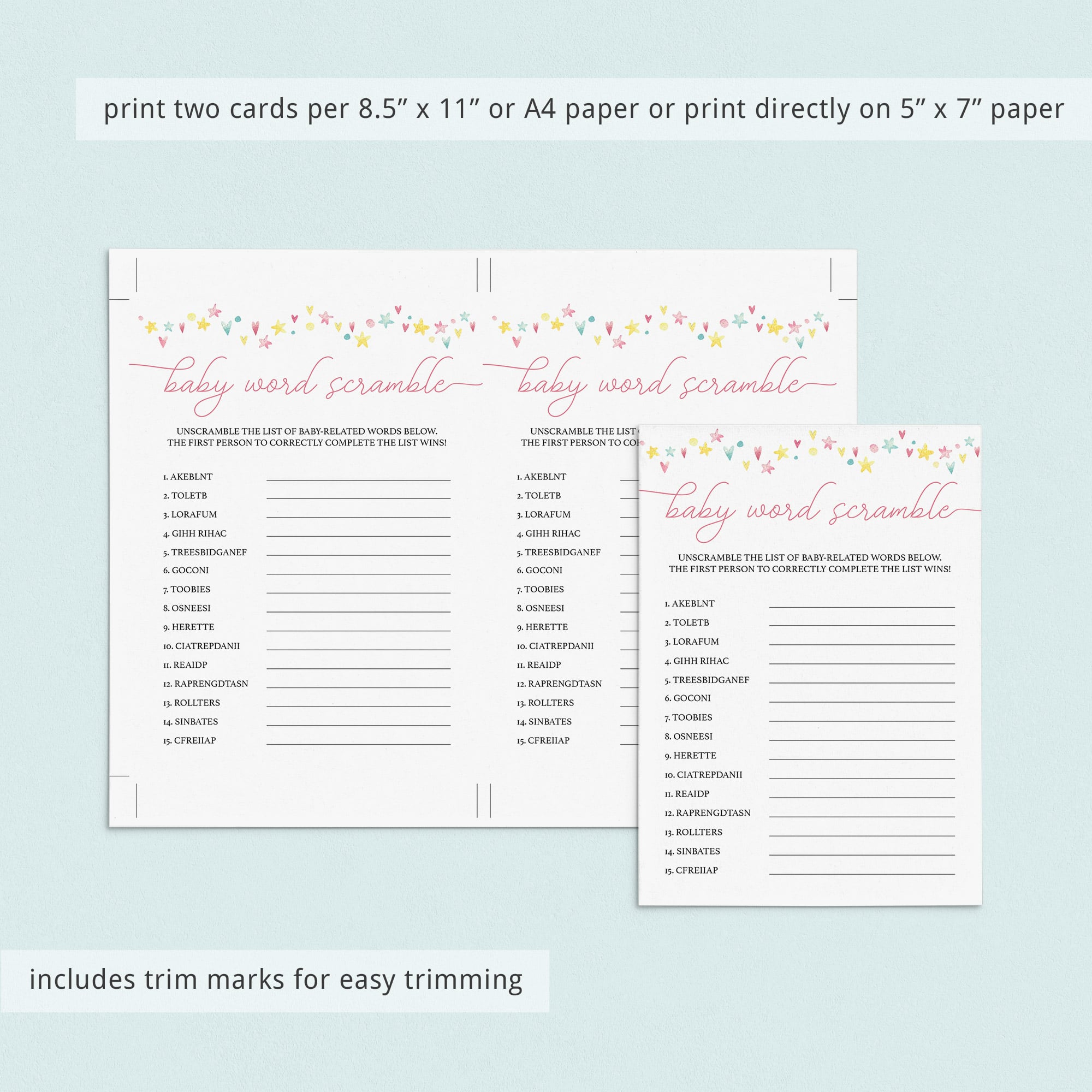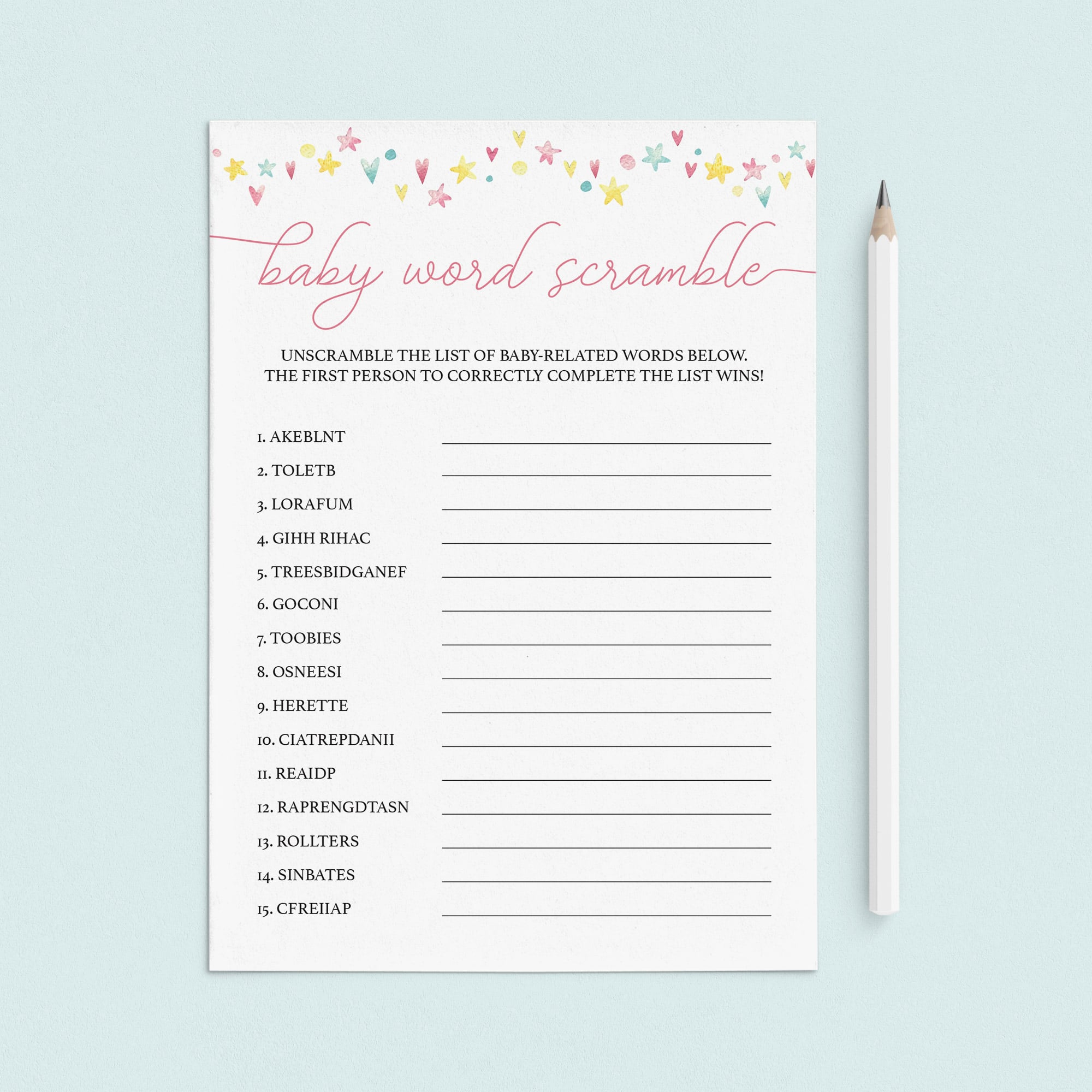 Play Baby Word Scramble at your girl baby shower with this cute pink, mint and yellow baby shower game. The printable cards with watercolor hearts and stars would be perfect for a baby shower to celebrate the arrival of a baby girl and will create a fun and enjoyable moment for all of your guests.