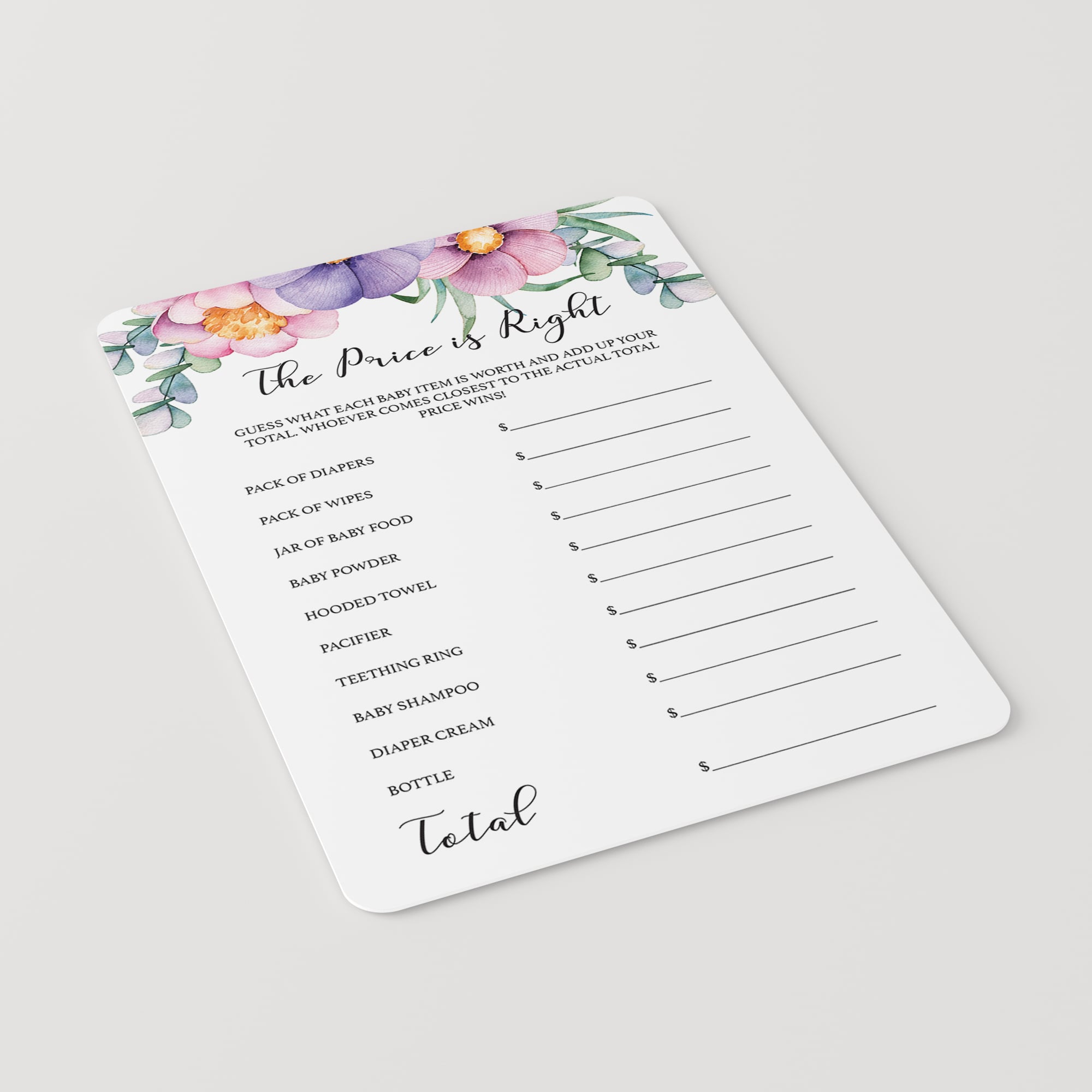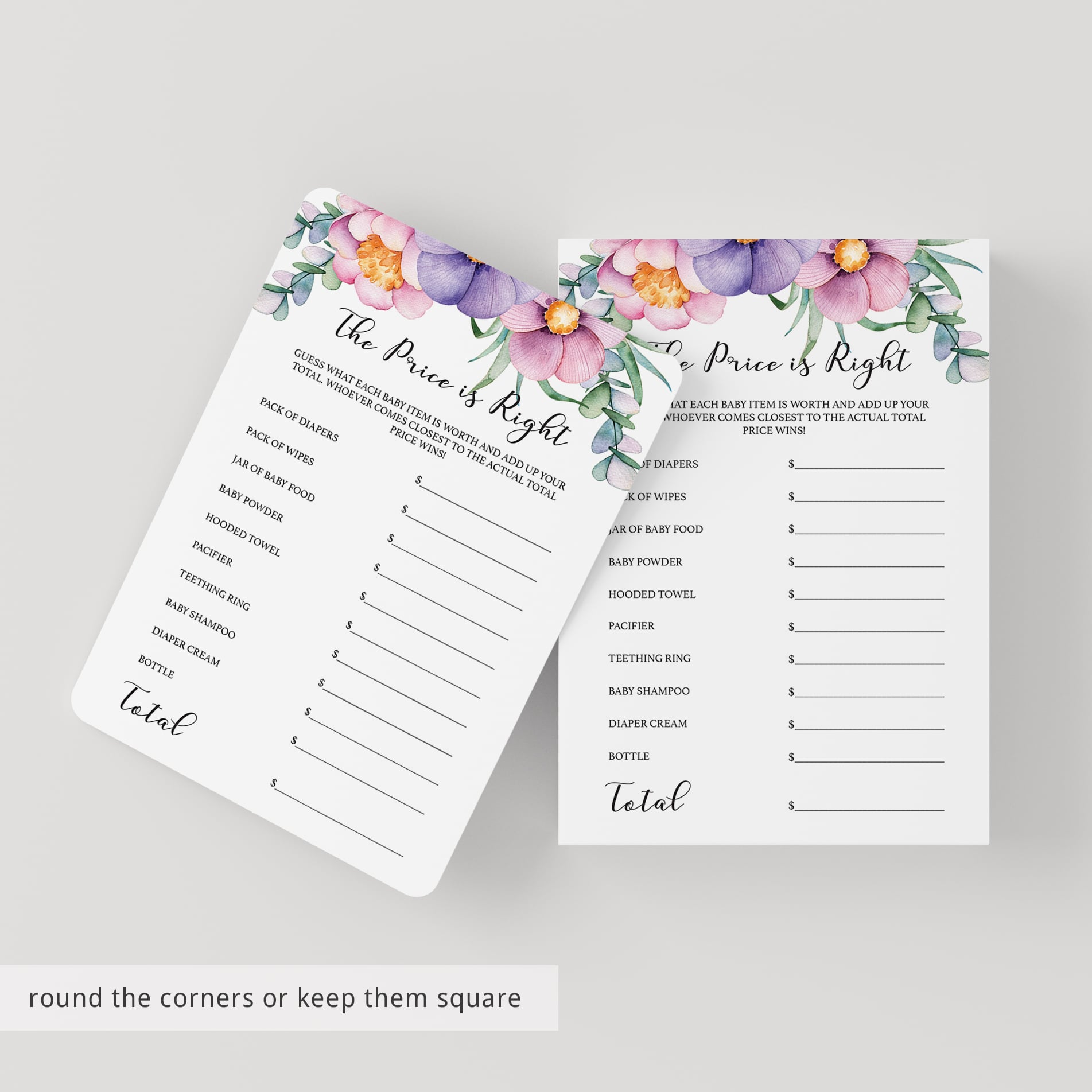 Play The Price Is Right with this gorgeous purple and pink floral baby shower game. The watercolor game cards would be perfect for a girl baby party and will create an enjoyable moment for all of your guests.