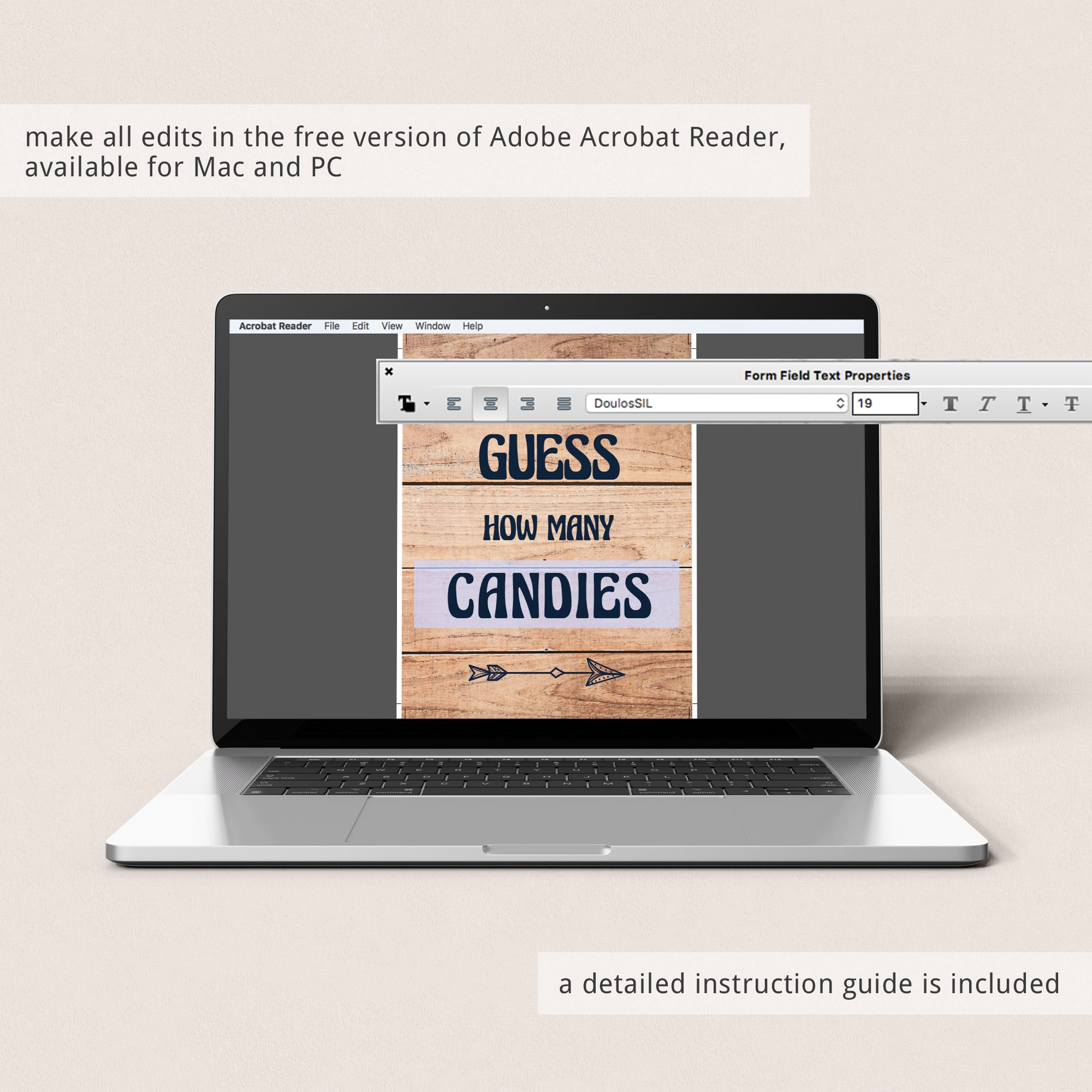 The Guess How Many sign is editable in the free version of Adobe Acrobat Reader, so that you can easily personalize the sign with your own words.