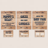 This rustic baby shower game pack includes the following popular baby shower guessing games: