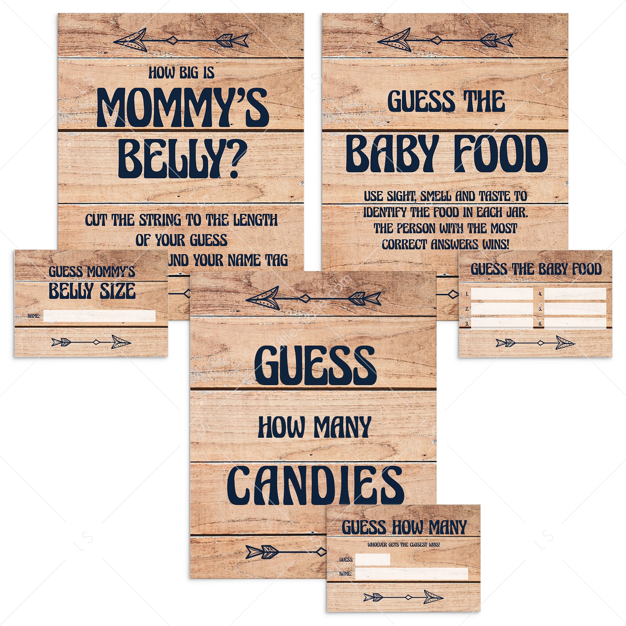 Guessing games are a huge hit at baby showers. Most people love the fun of guessing and the potential thrill of finding out they have guessed right. Kick off the fun and get your guests involved with this package of rustic baby shower guessing games. The rustic table signs and matching guessing cards with wood background are perfect for a woodland themed baby shower.