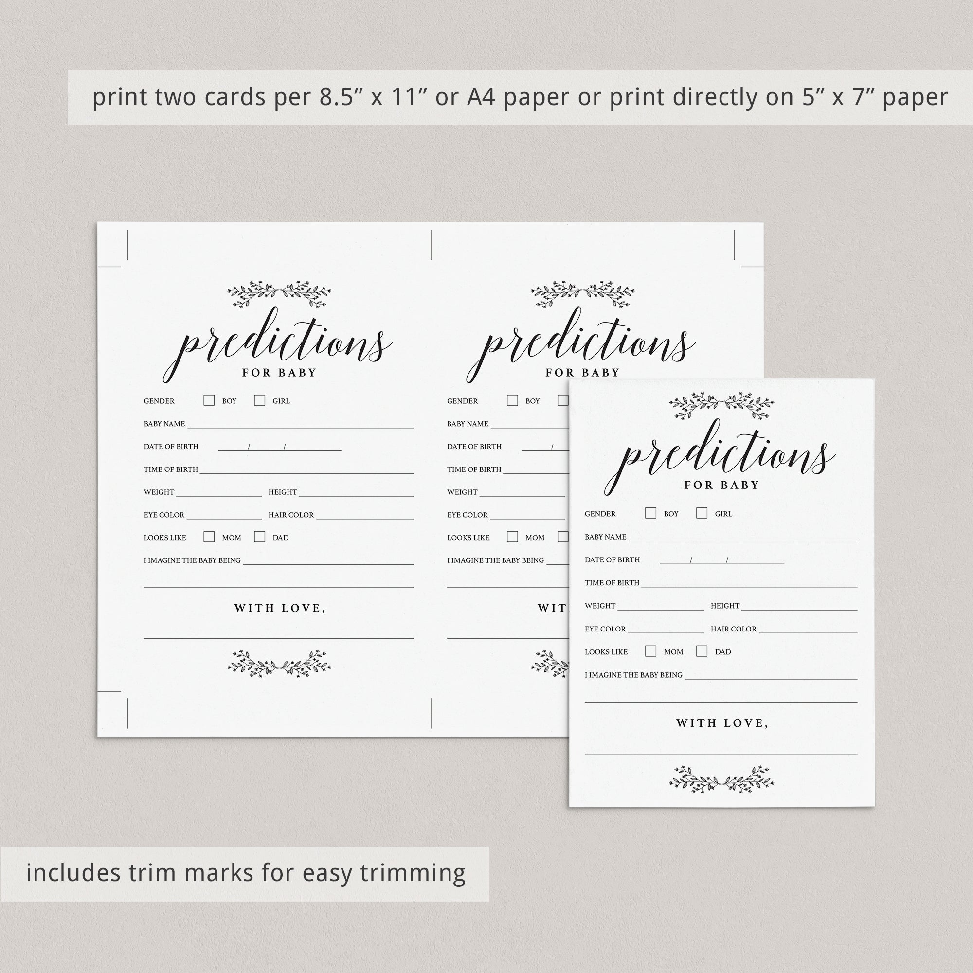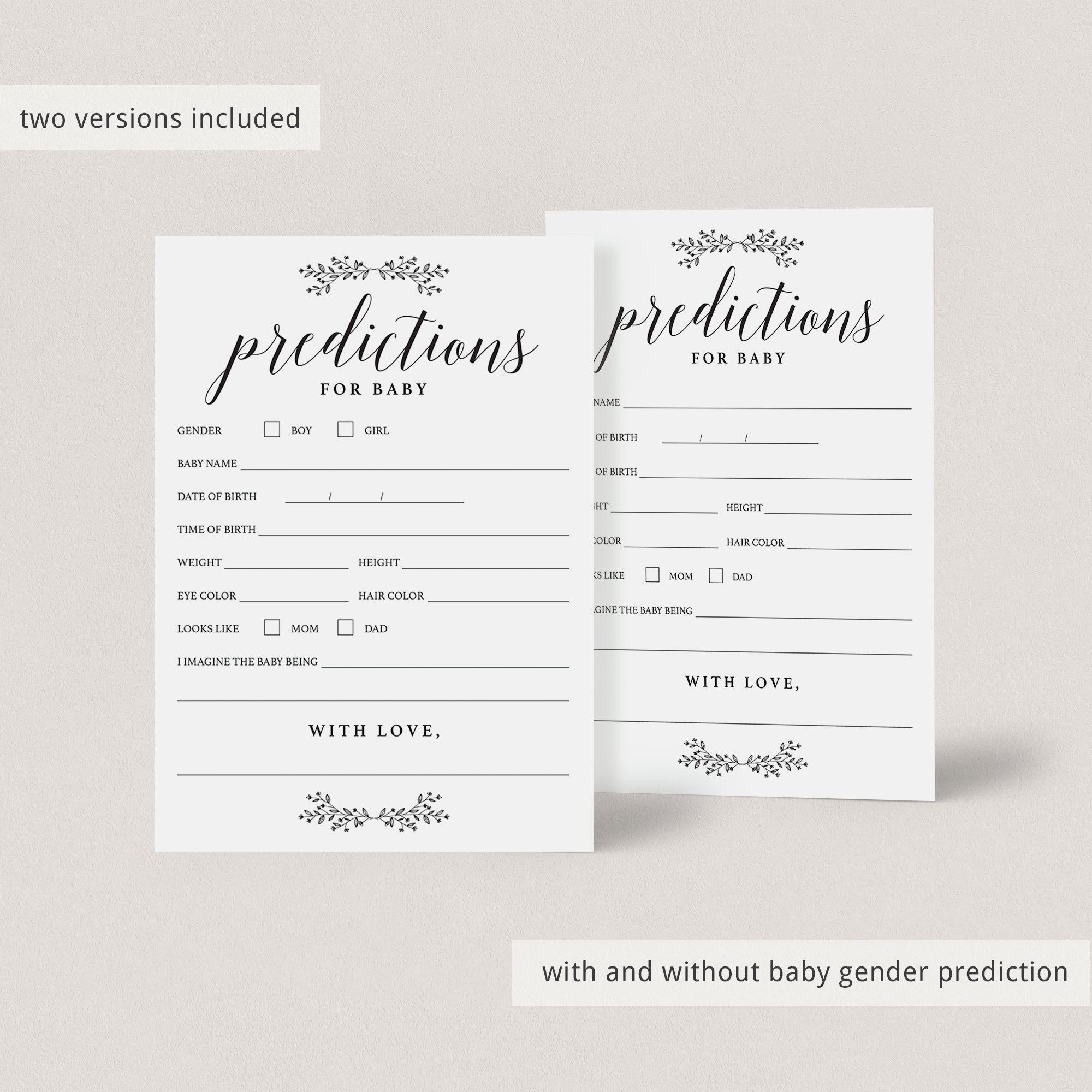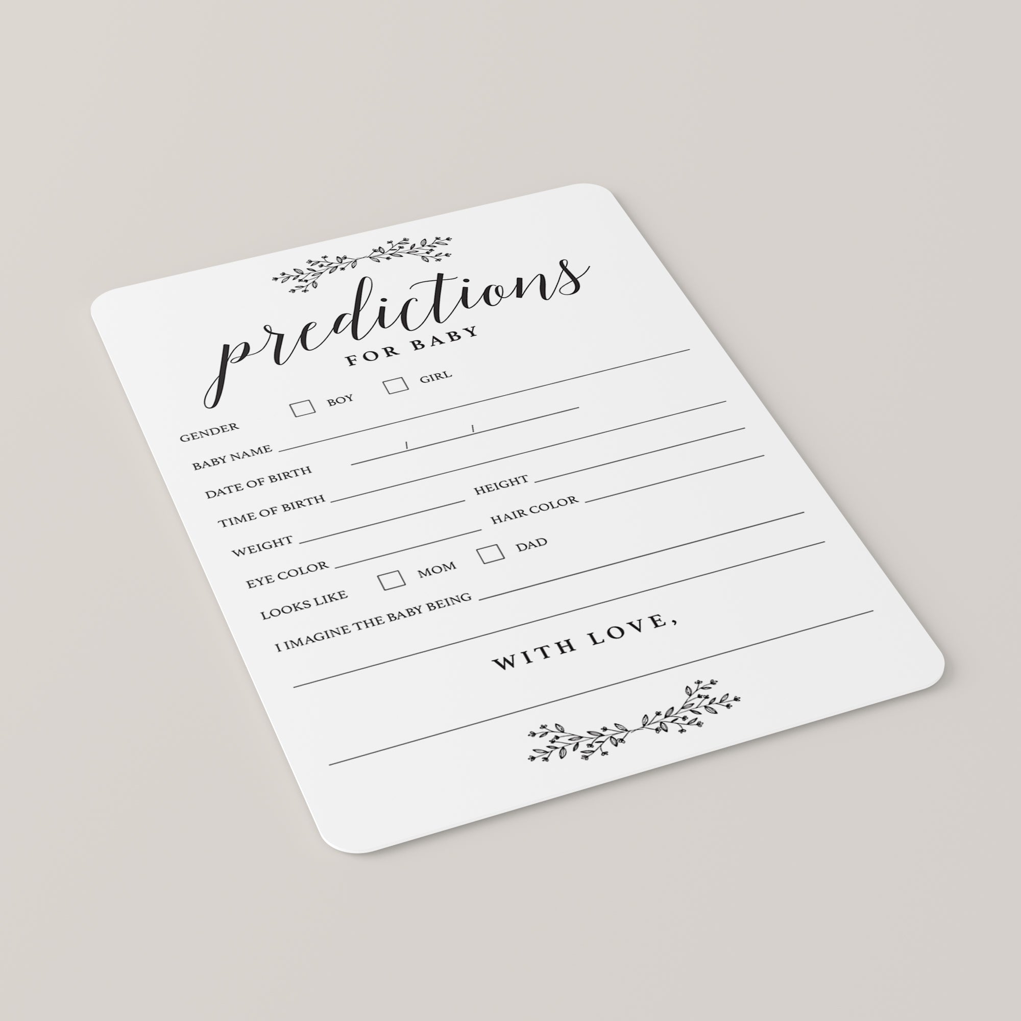 Create a meaningful keepsake with this rustic minimal baby shower predictions card. It's a fun way to engage your guests during the party and it makes a beautiful keepsake for the mom-to-be afterwards. The minimal design with calligraphy script black and white leaves makes this game the perfect addition to a neutral baby shower.