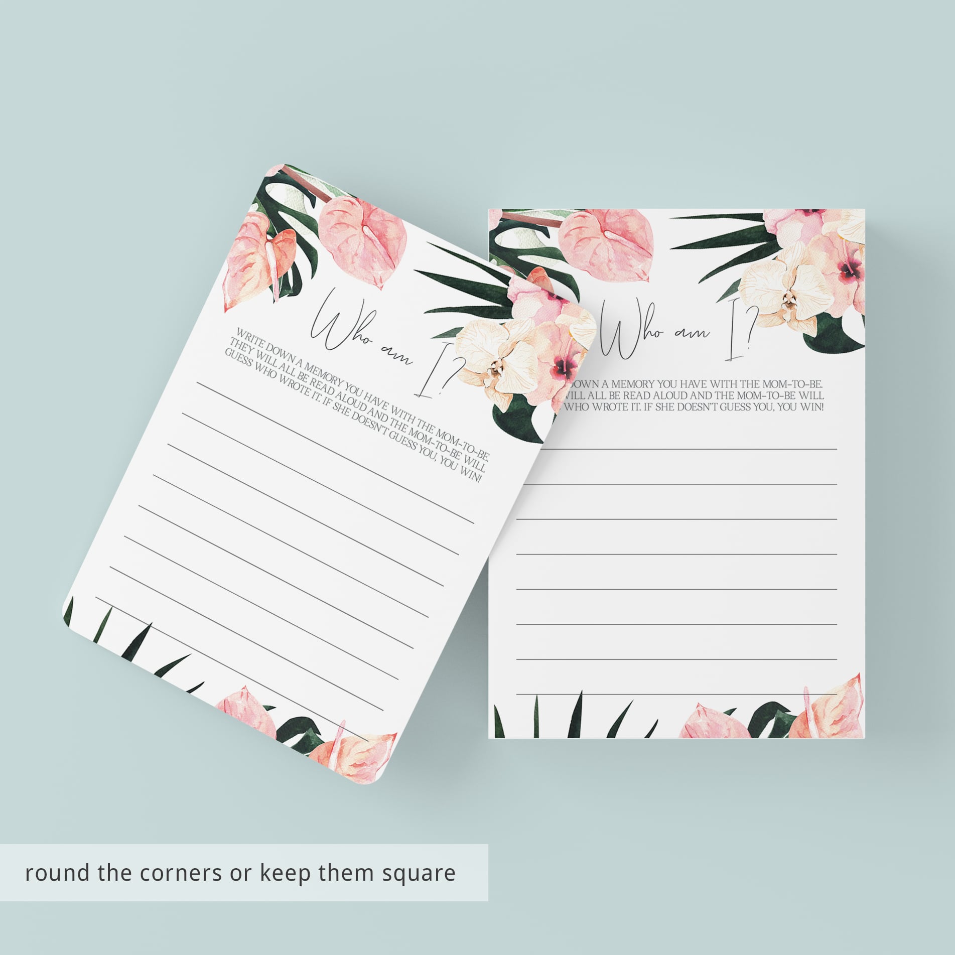 Entertain your baby shower guests with this summer theme baby shower games pack with watercolor leaves and flowers. The games pack includes everything you need to entertain large groups of guests with a variety of activities. It is perfect for a tropical theme baby party.